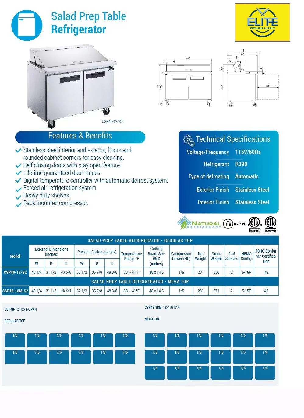 48 in. Refrigerated Sandwich Prep Table 12 Cu. Ft. Two-door Commercial Salad Pre Table