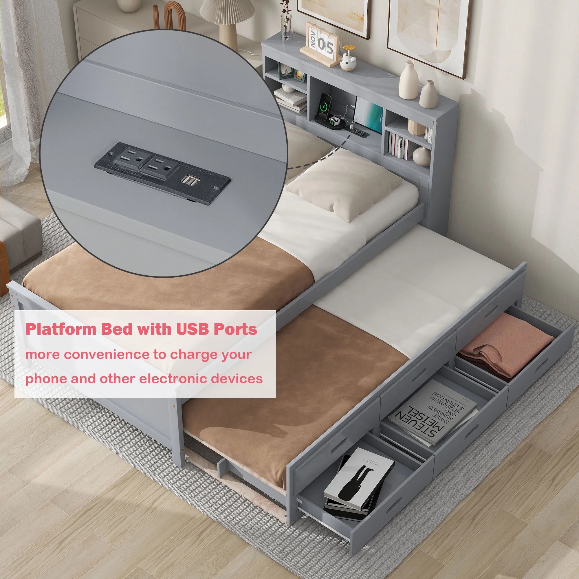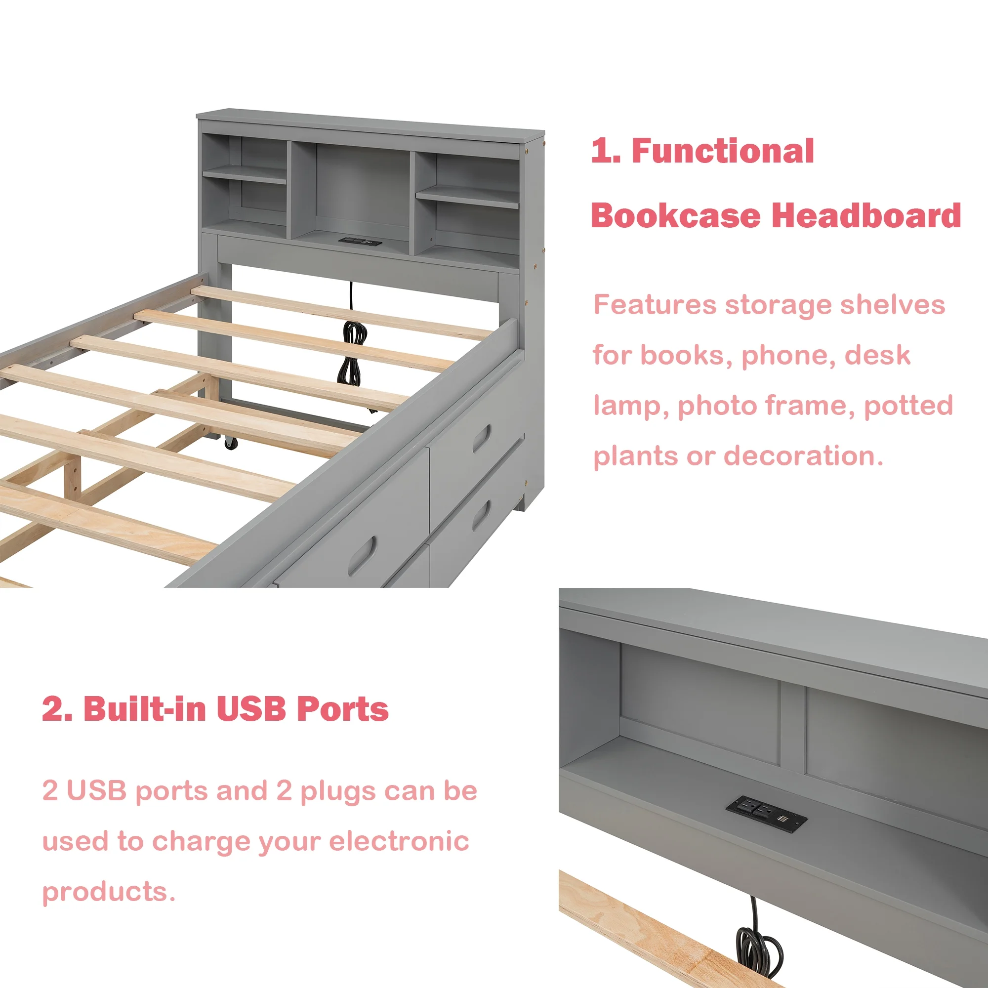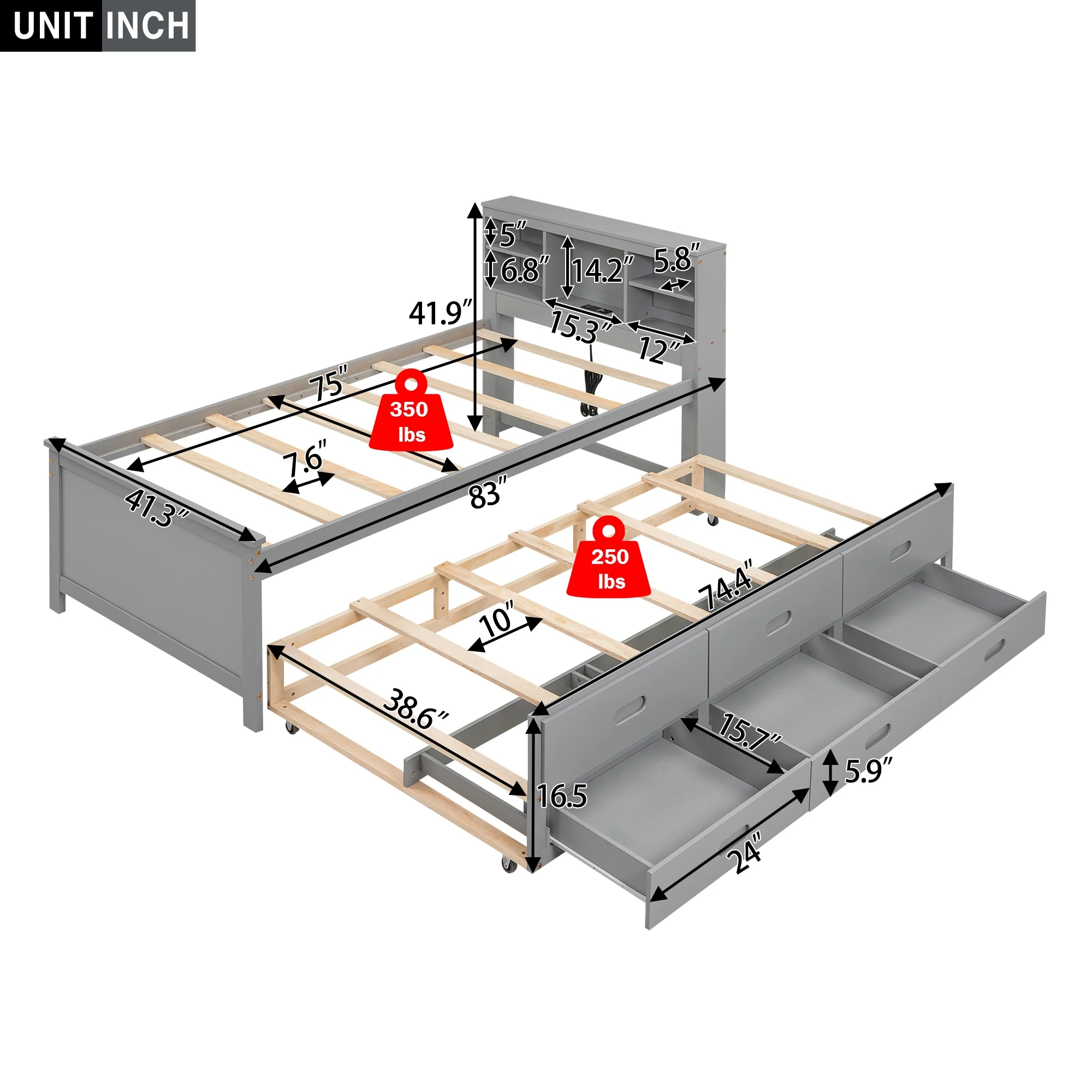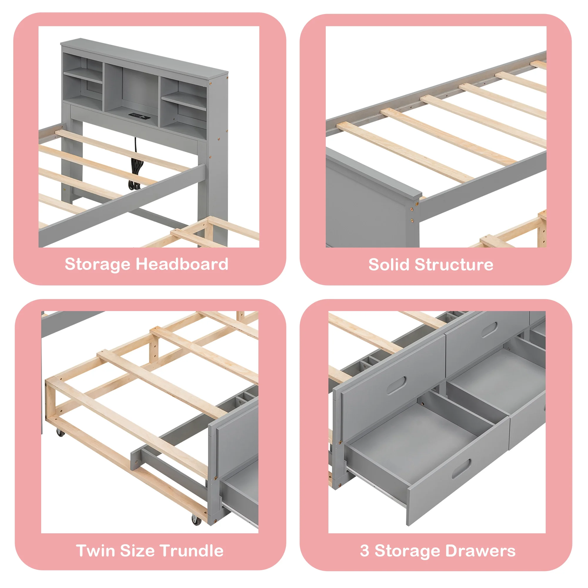Breslin Bookcase Twin Bed with Trundle and 1 USB Port, Gray, by Hillsdale Living Essentials