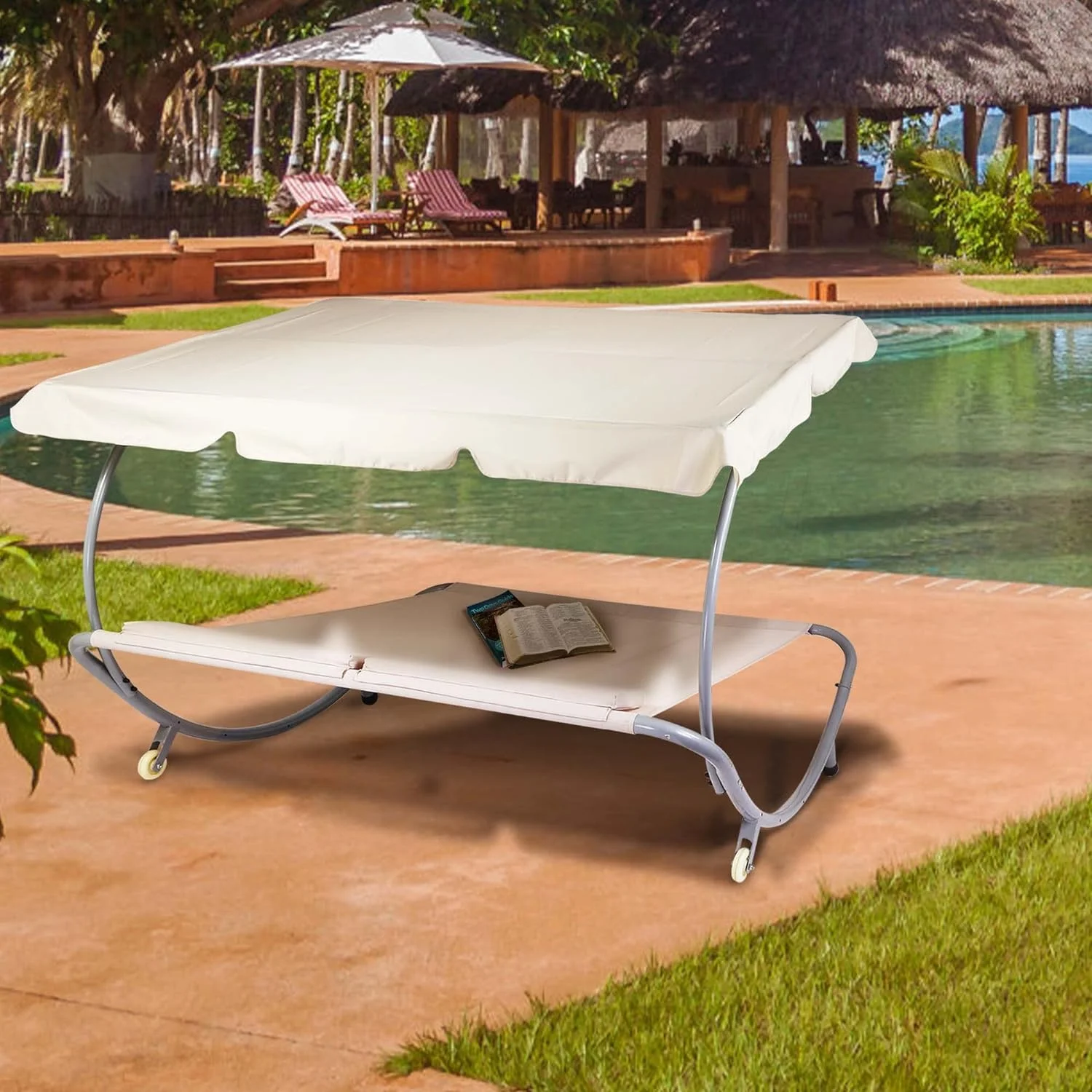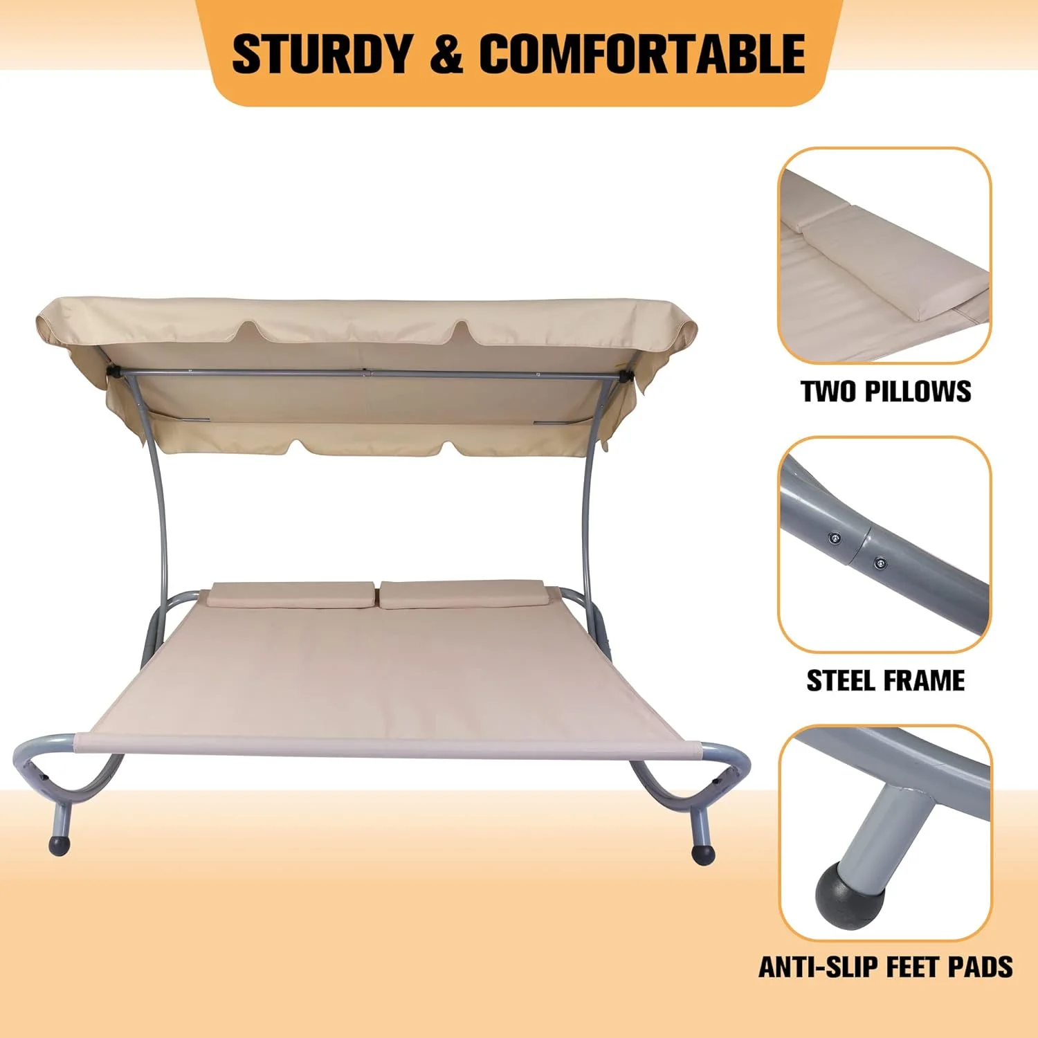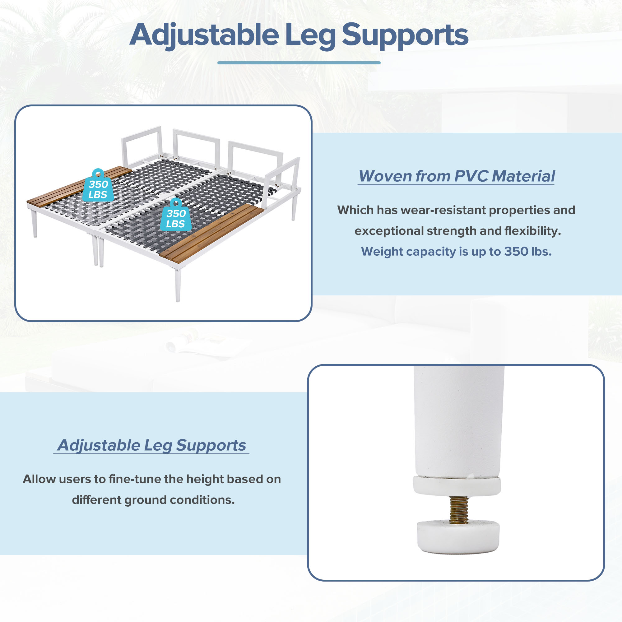 Metal Outdoor Daybed, 2 in 1 Padded Double Chaise Lounge Set with Wood Topped Side Spaces, Patio Sunbed Seating Set, Gray