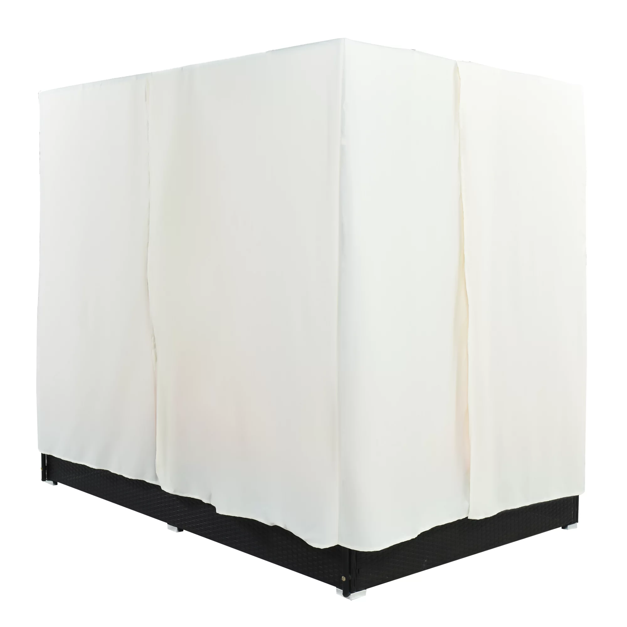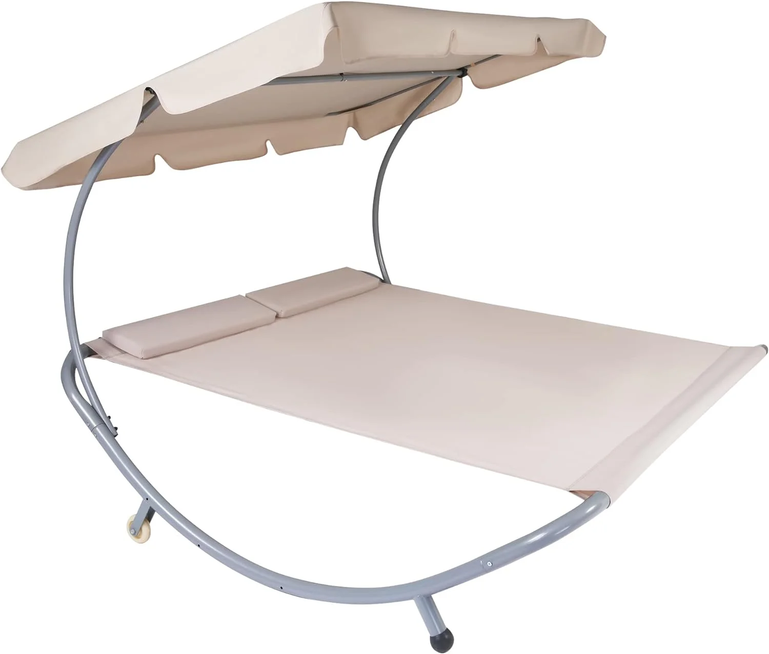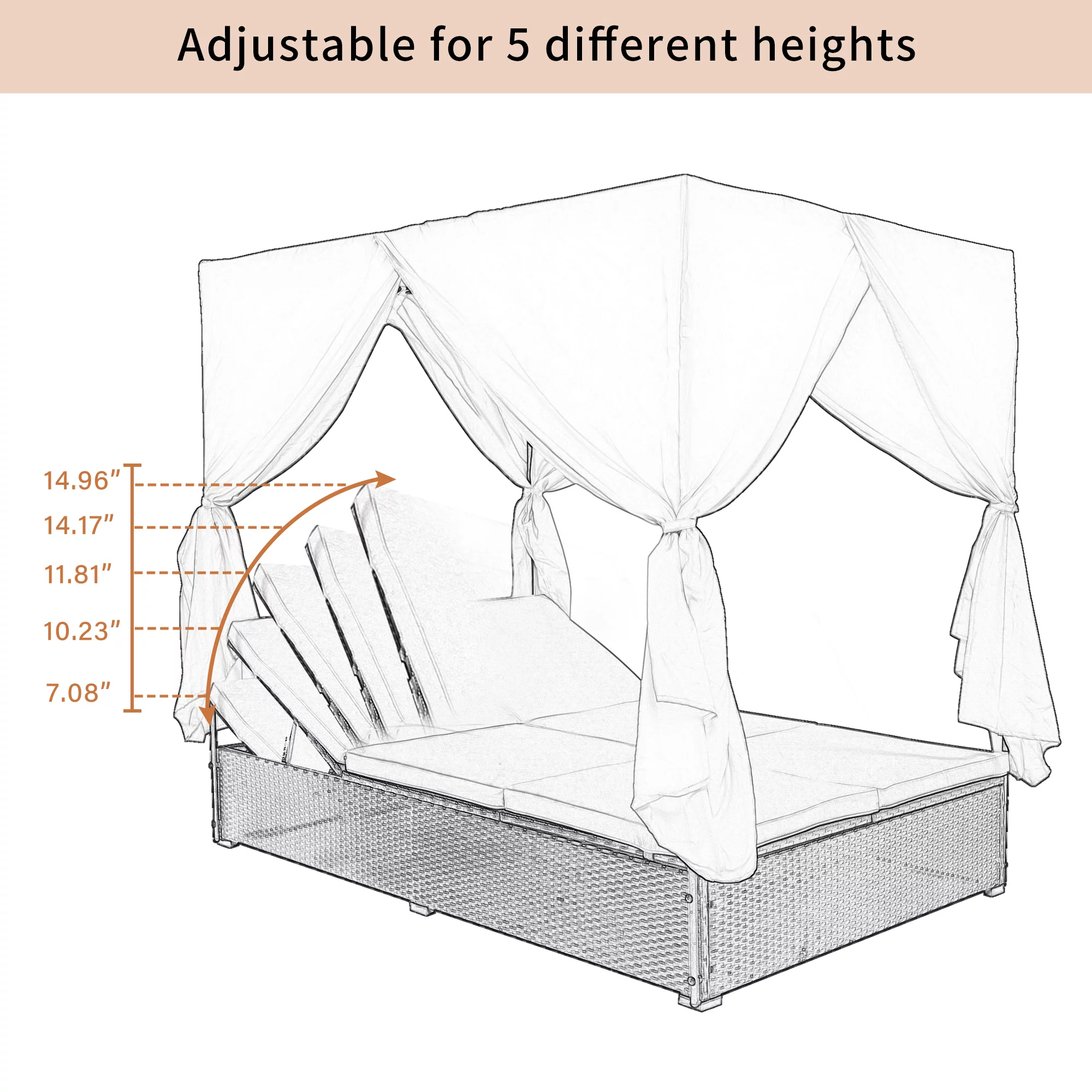 Metal Outdoor Daybed, 2 in 1 Padded Double Chaise Lounge Set with Wood Topped Side Spaces, Patio Sunbed Seating Set, Gray