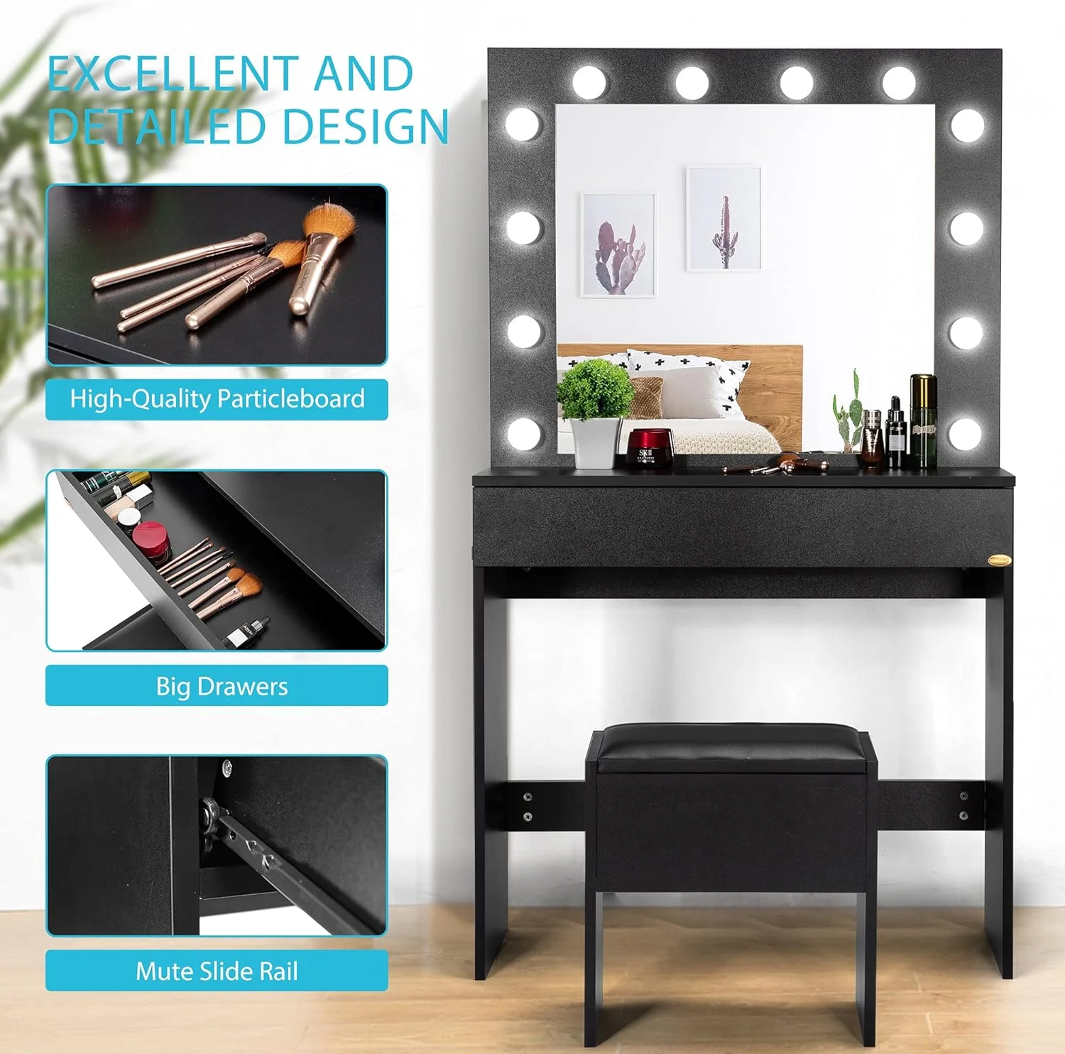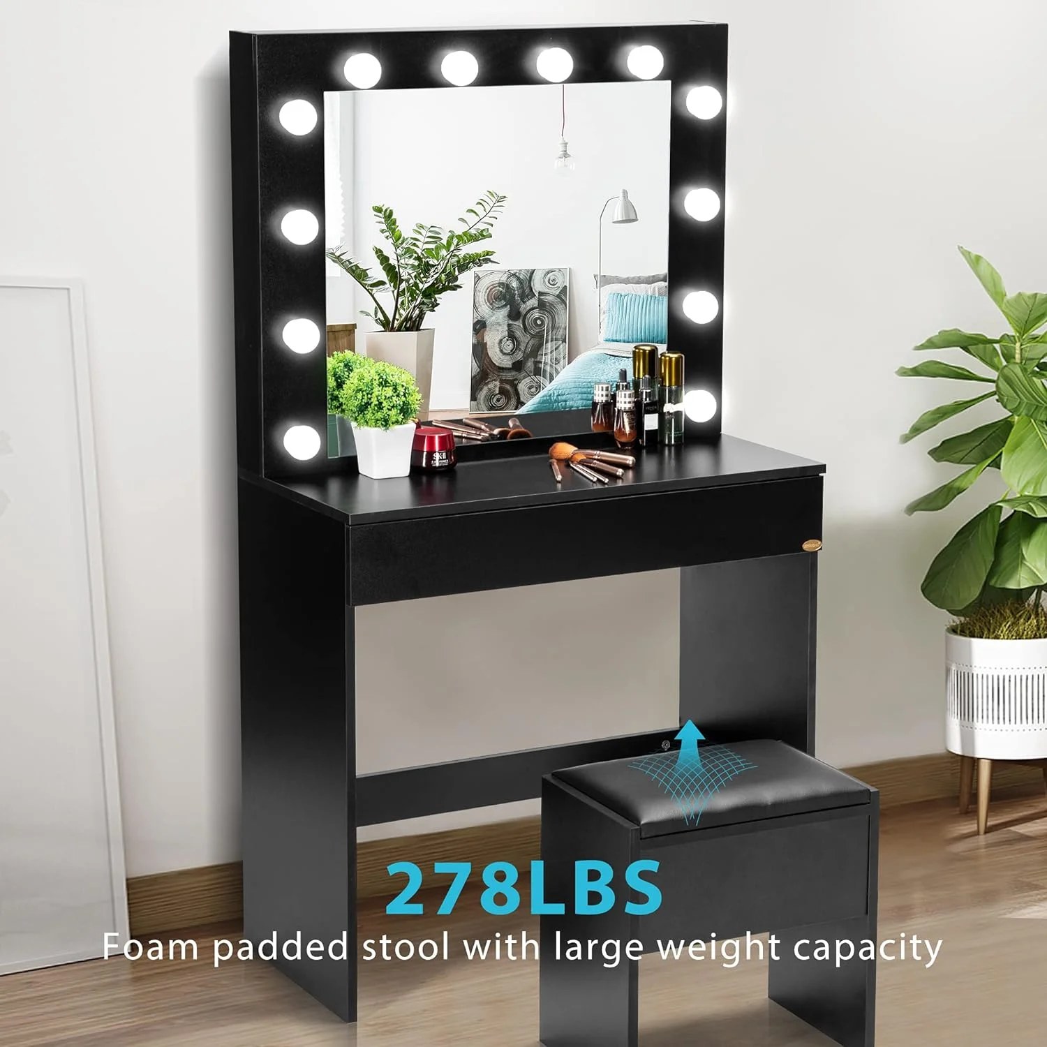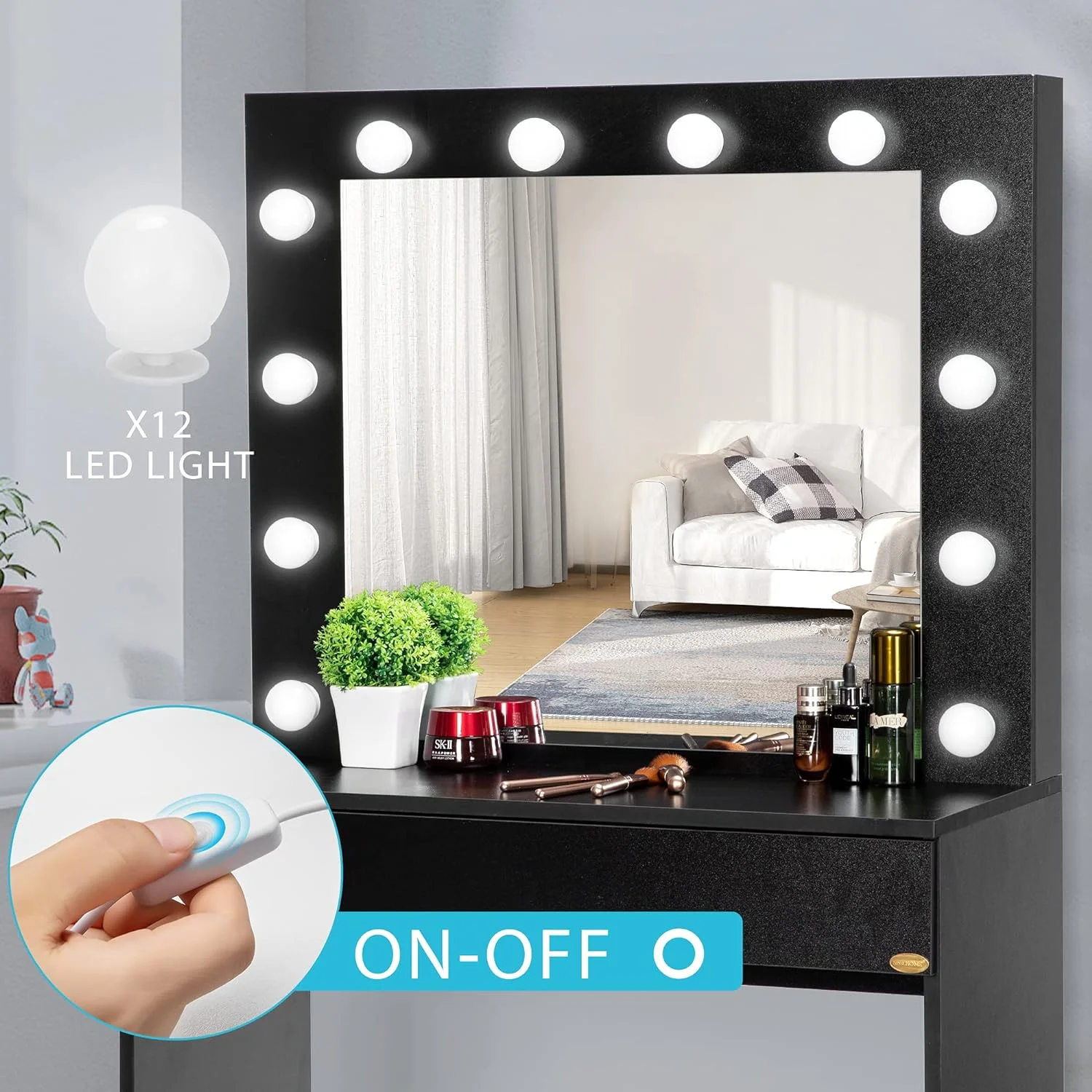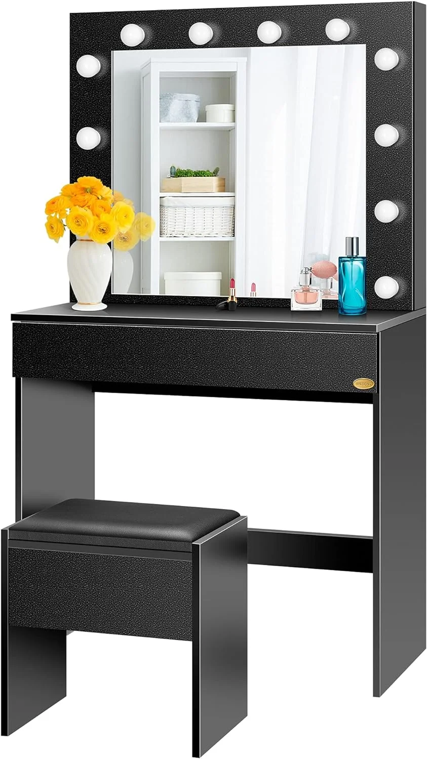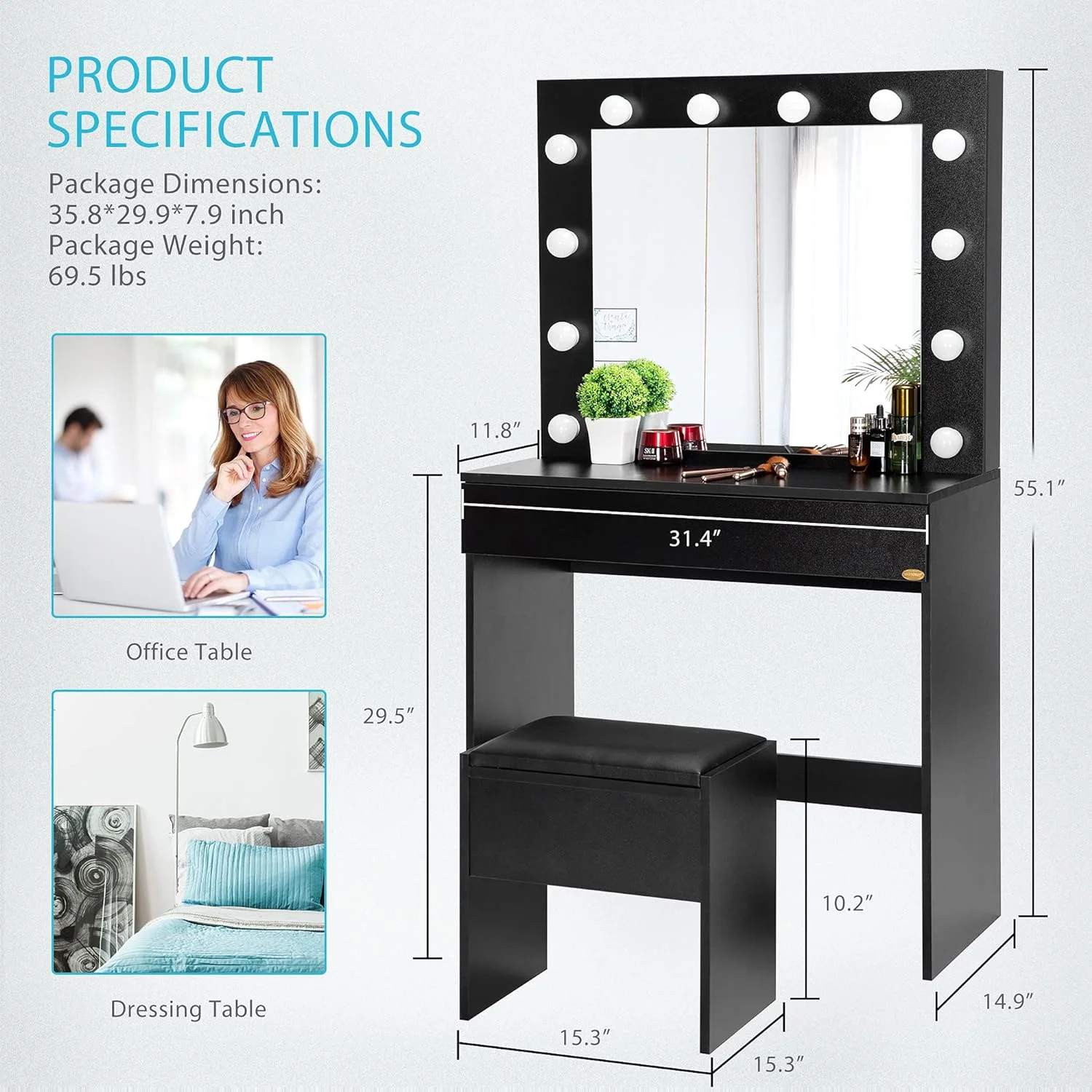 SPECSTAR Makeup Vanity Set with 12 Light Bulbs, Makeup Dressing Table with Lighted Mirror and Large Drawer, Black