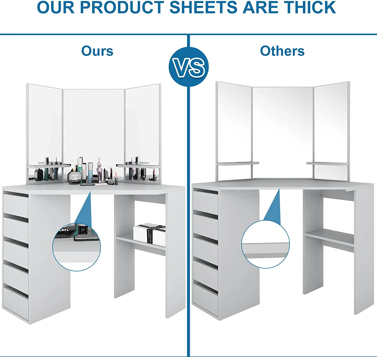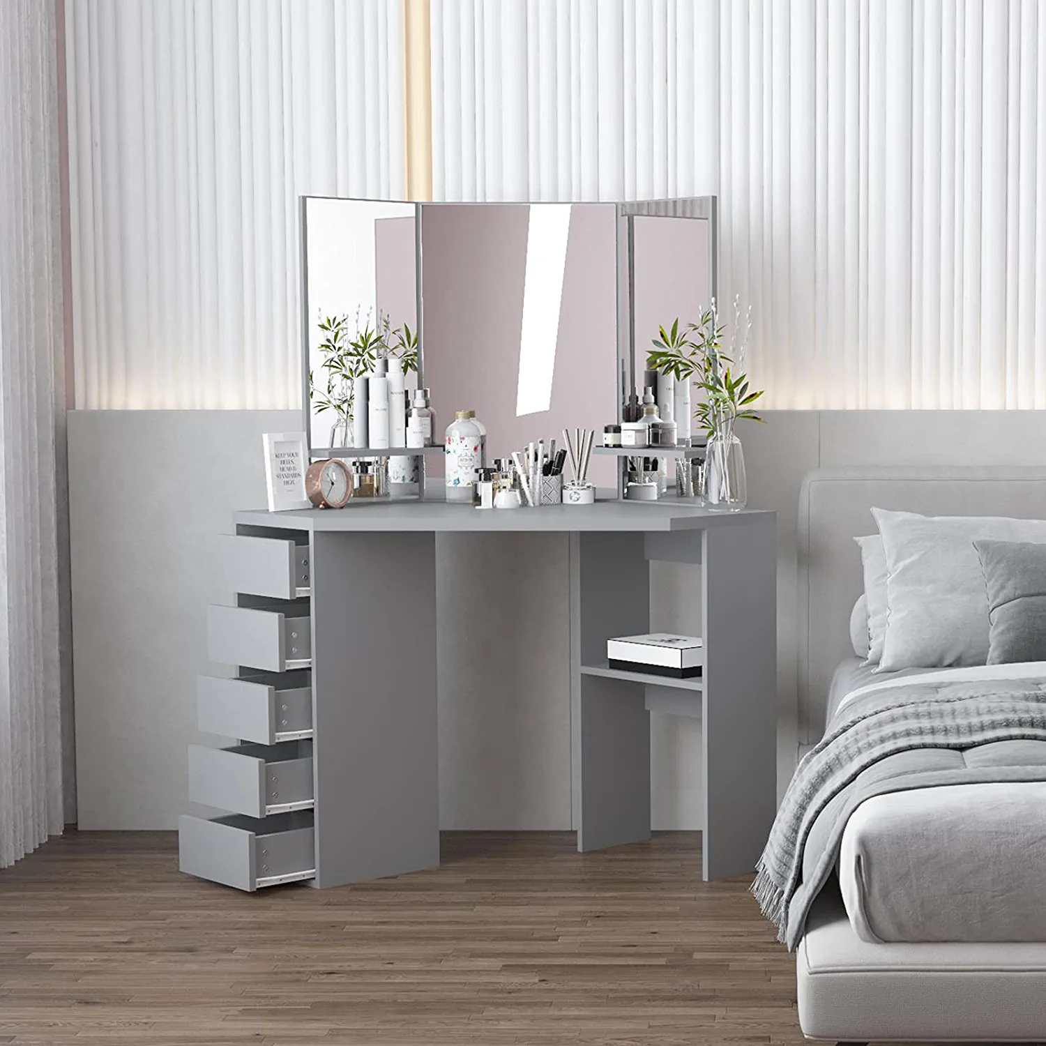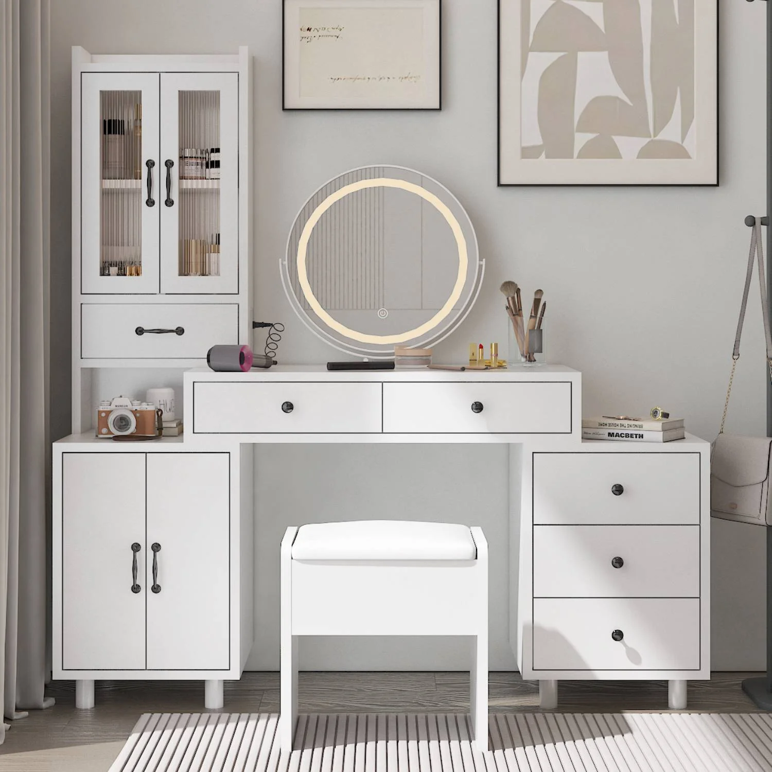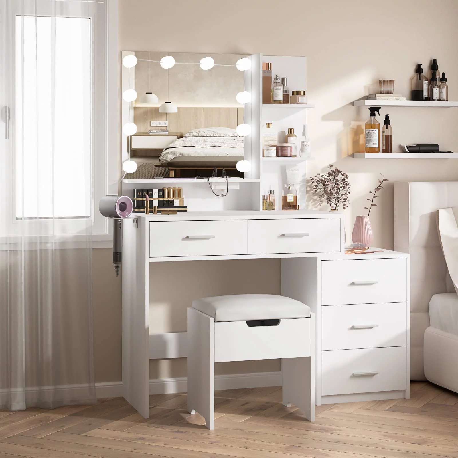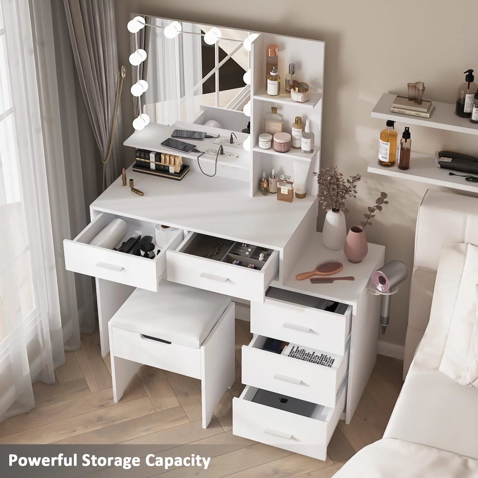 Boahaus Freya Modern Bedroom Vanity Table with Light Bulbs, 07 Drawers, Large Standing Mirror, Black