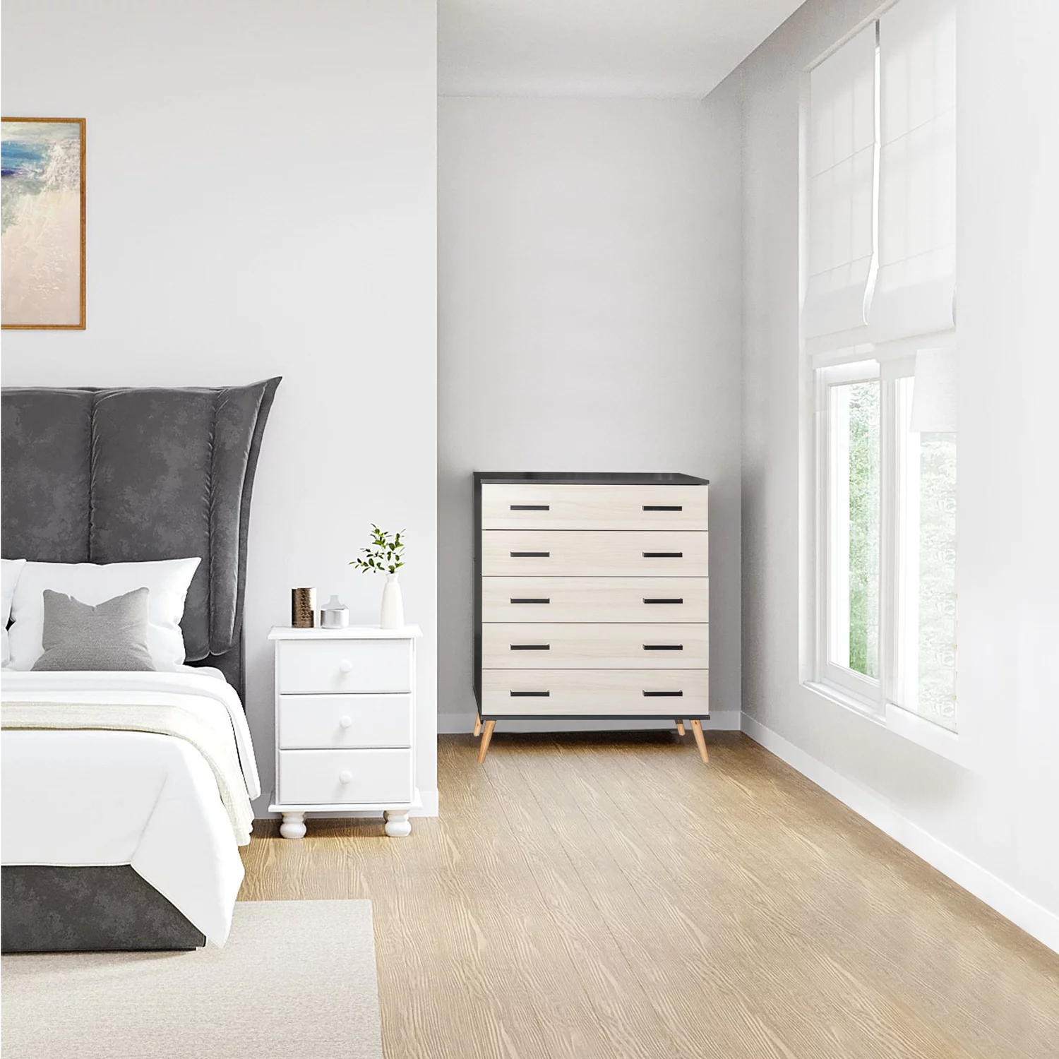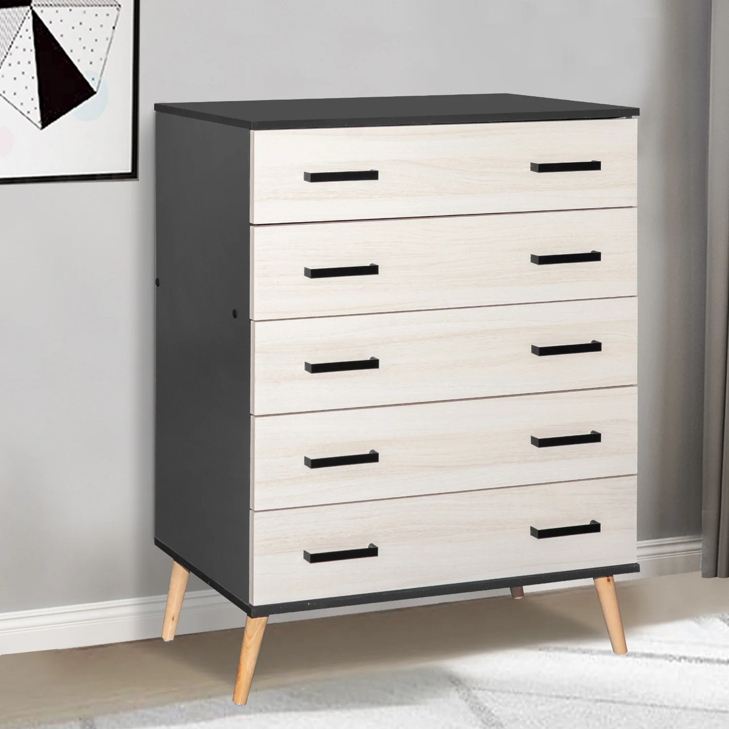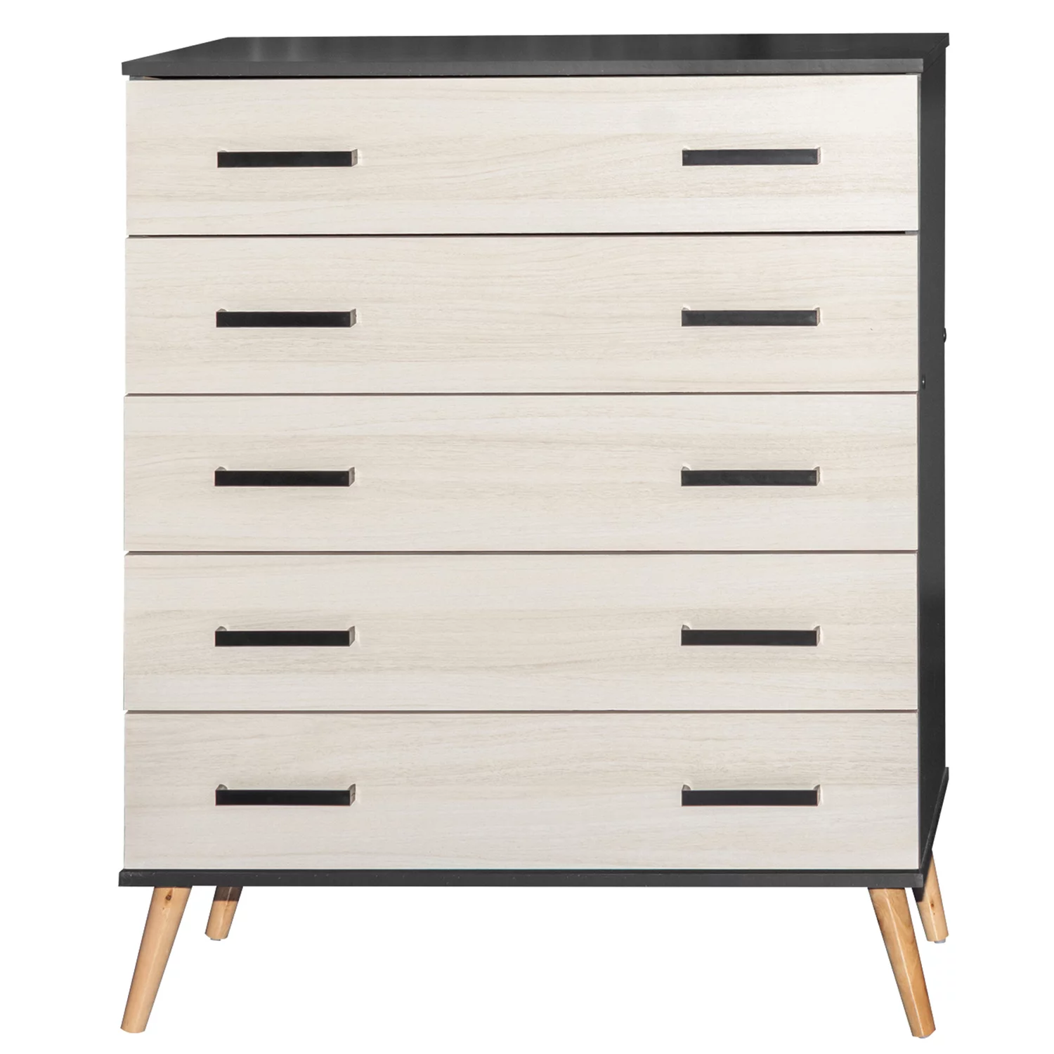 Better Home Products Chest Five Drawer with Pine Legs in Dark Gray and Honey Oak Finish.