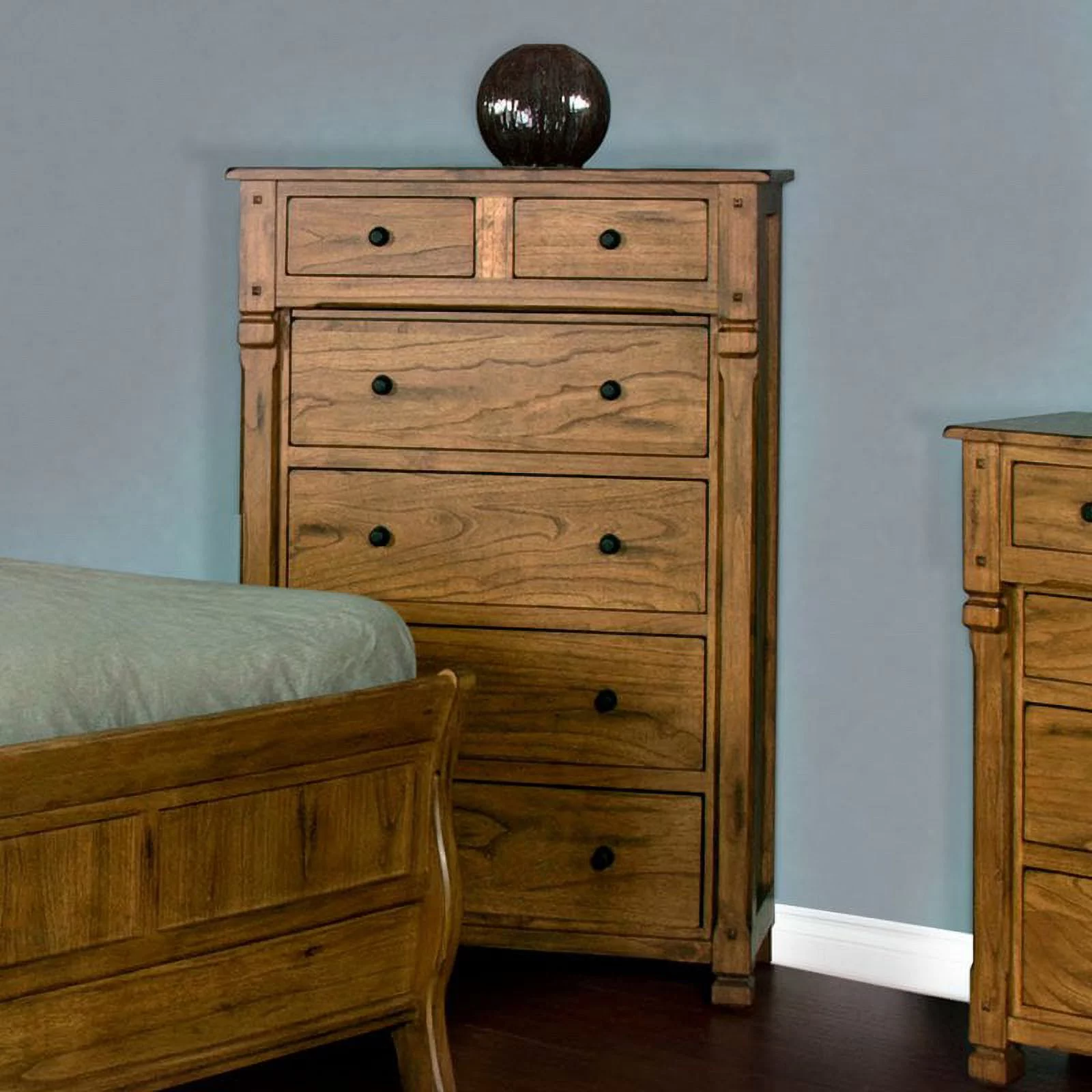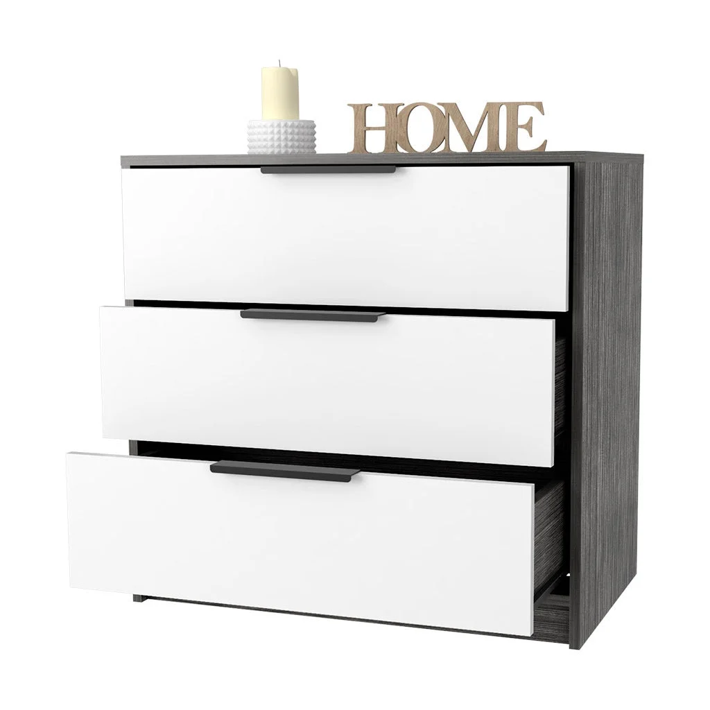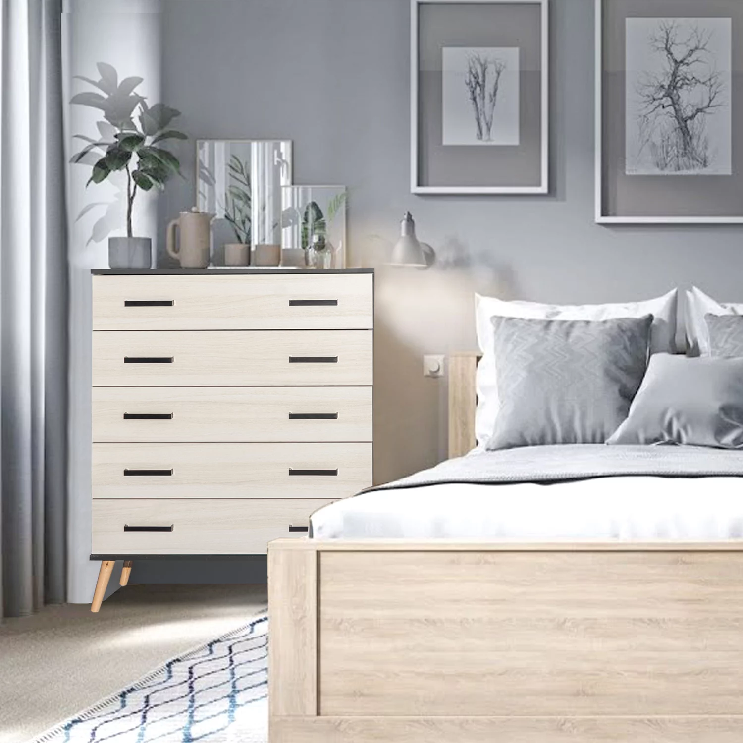 Better Home Products Chest Five Drawer with Pine Legs in Dark Gray and Honey Oak Finish.
