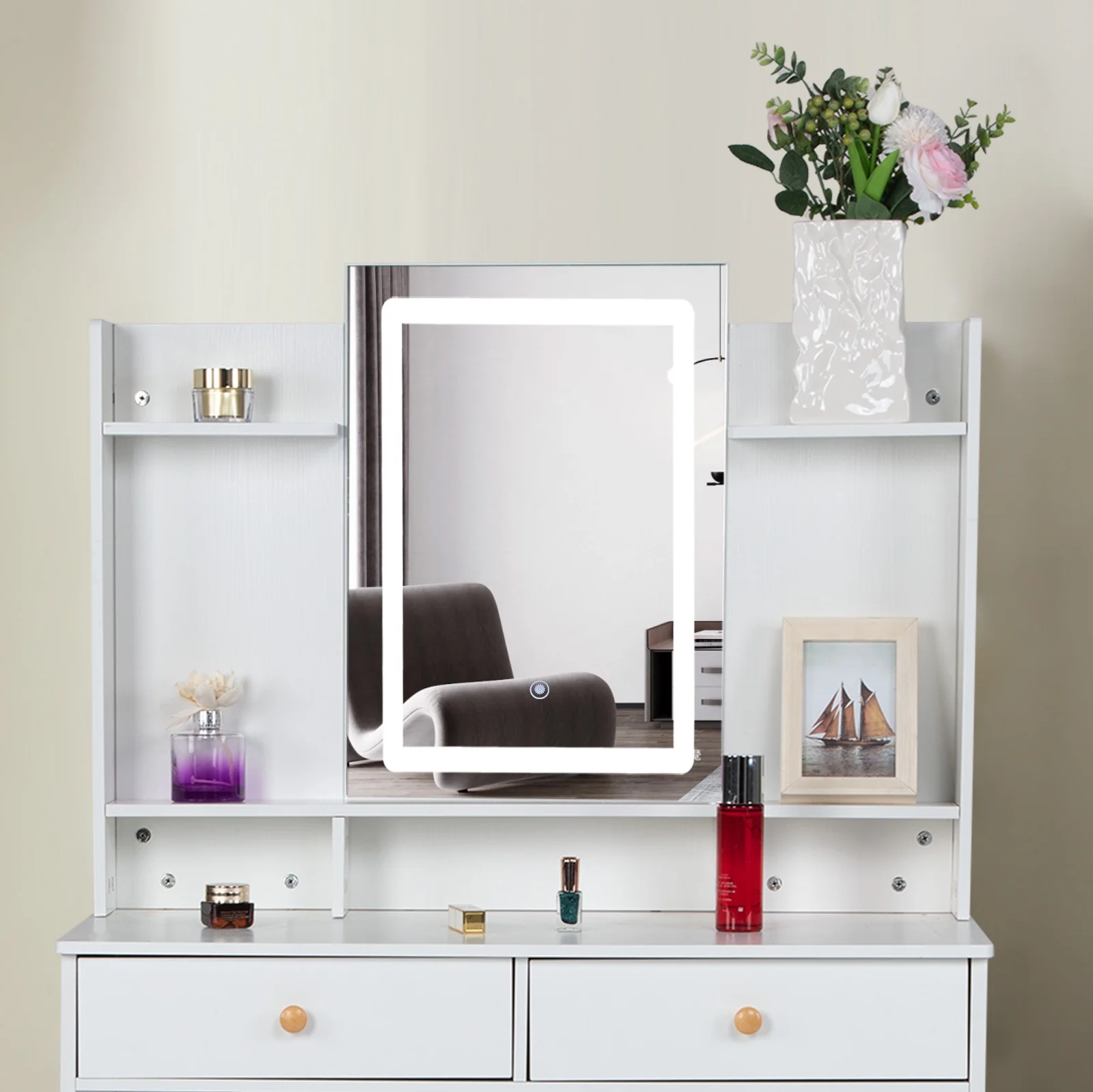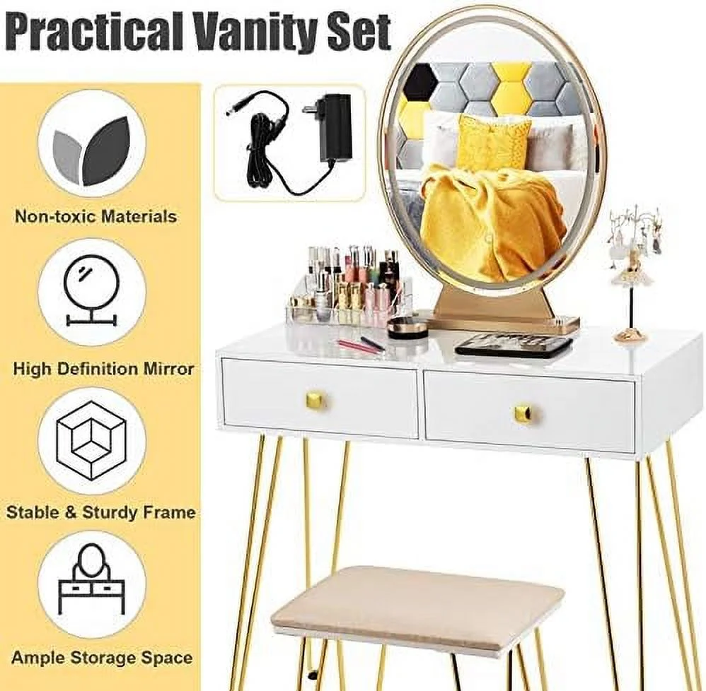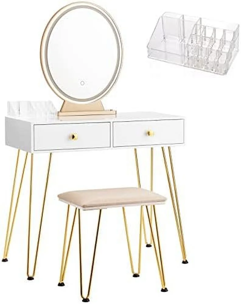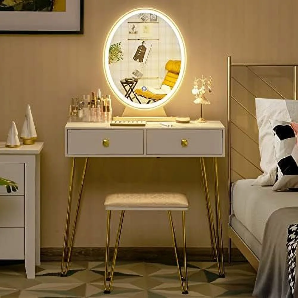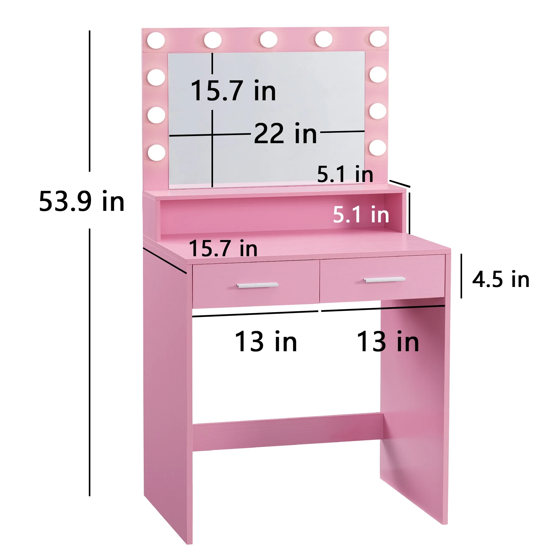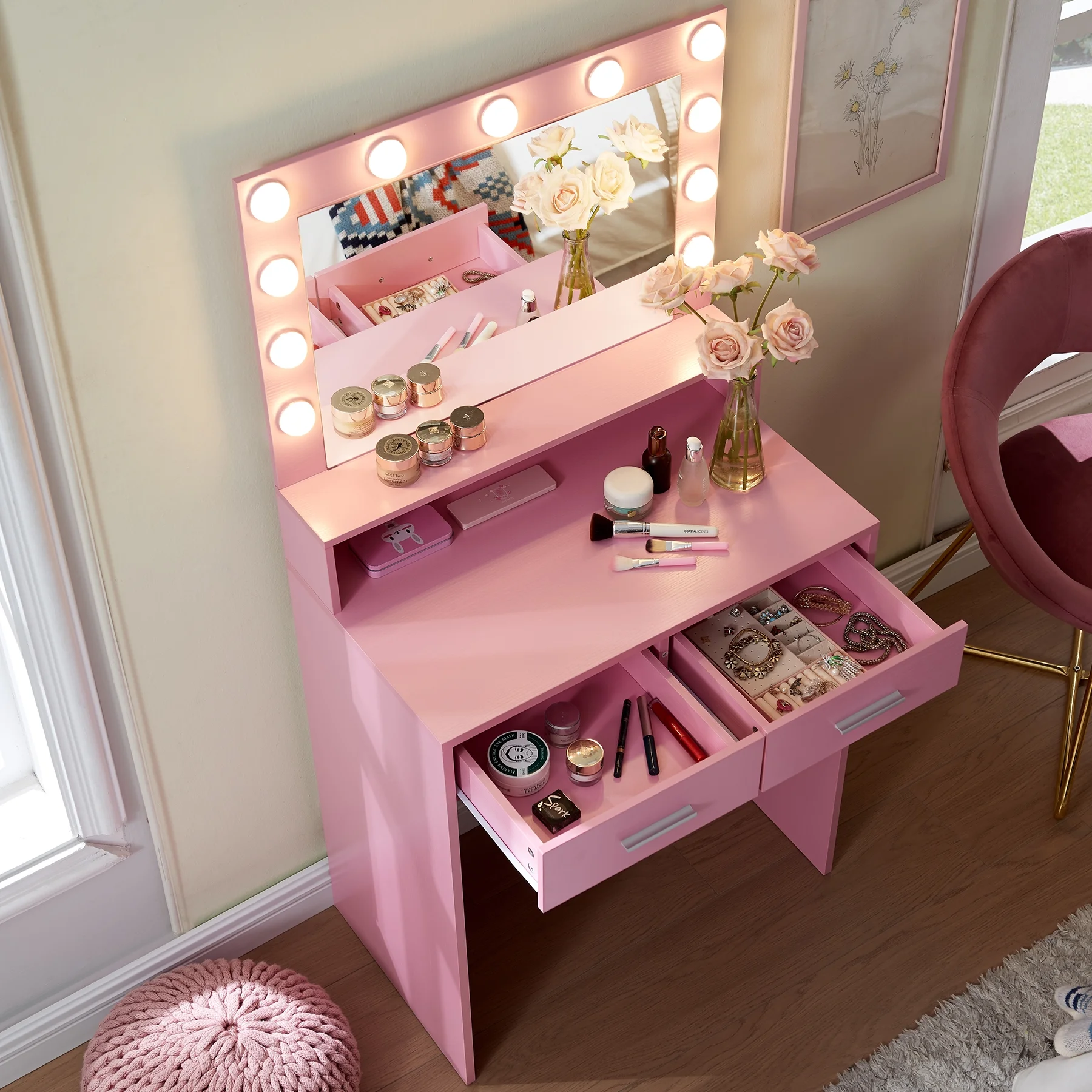 MIRROTOWEL Vanity Desk, Dressing Table with Large Drawer, 3 Level Storage & 3 Lighting Modes (Pink)