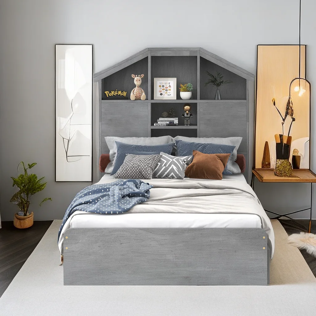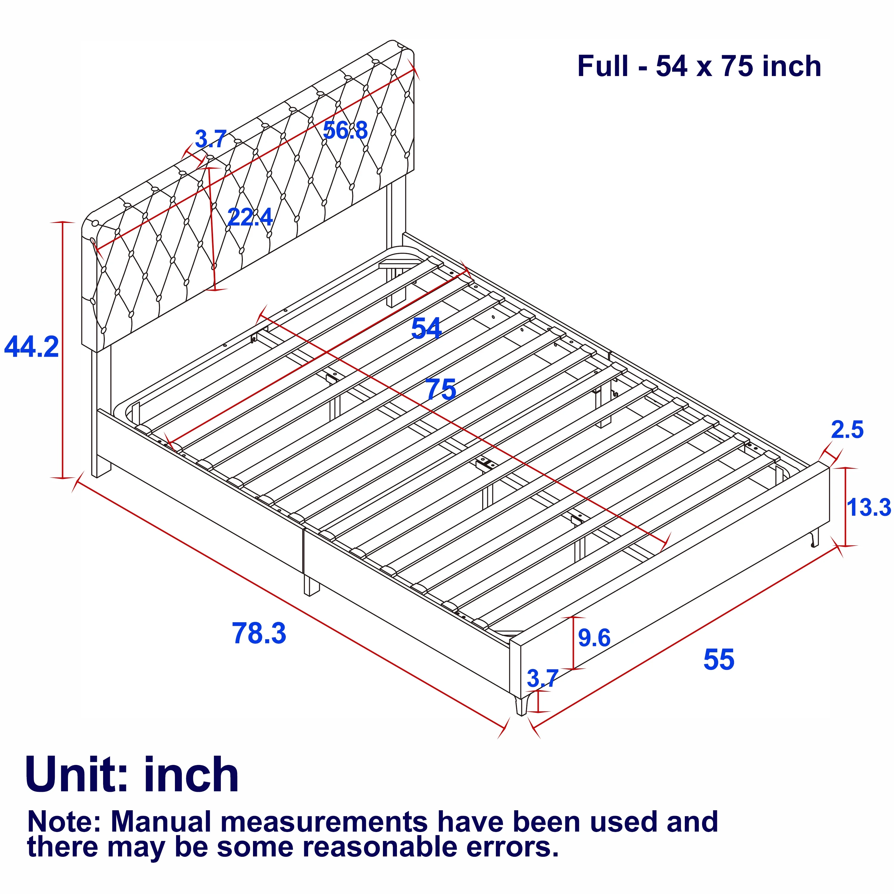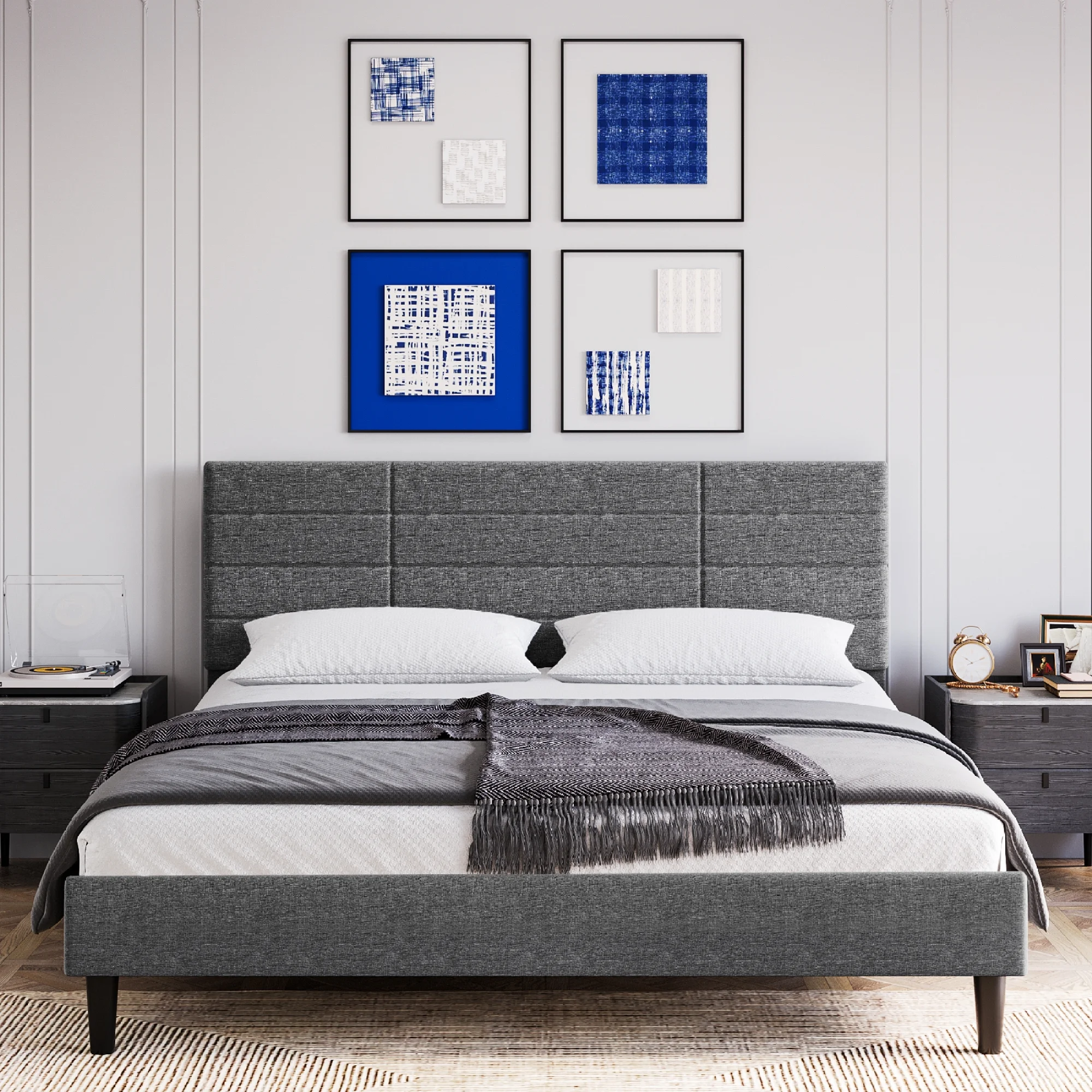 Light Grey Full Size Bed Frame with Upholstered Headboard, Strong Frame, Wooden Slats, No Box Spring Needed