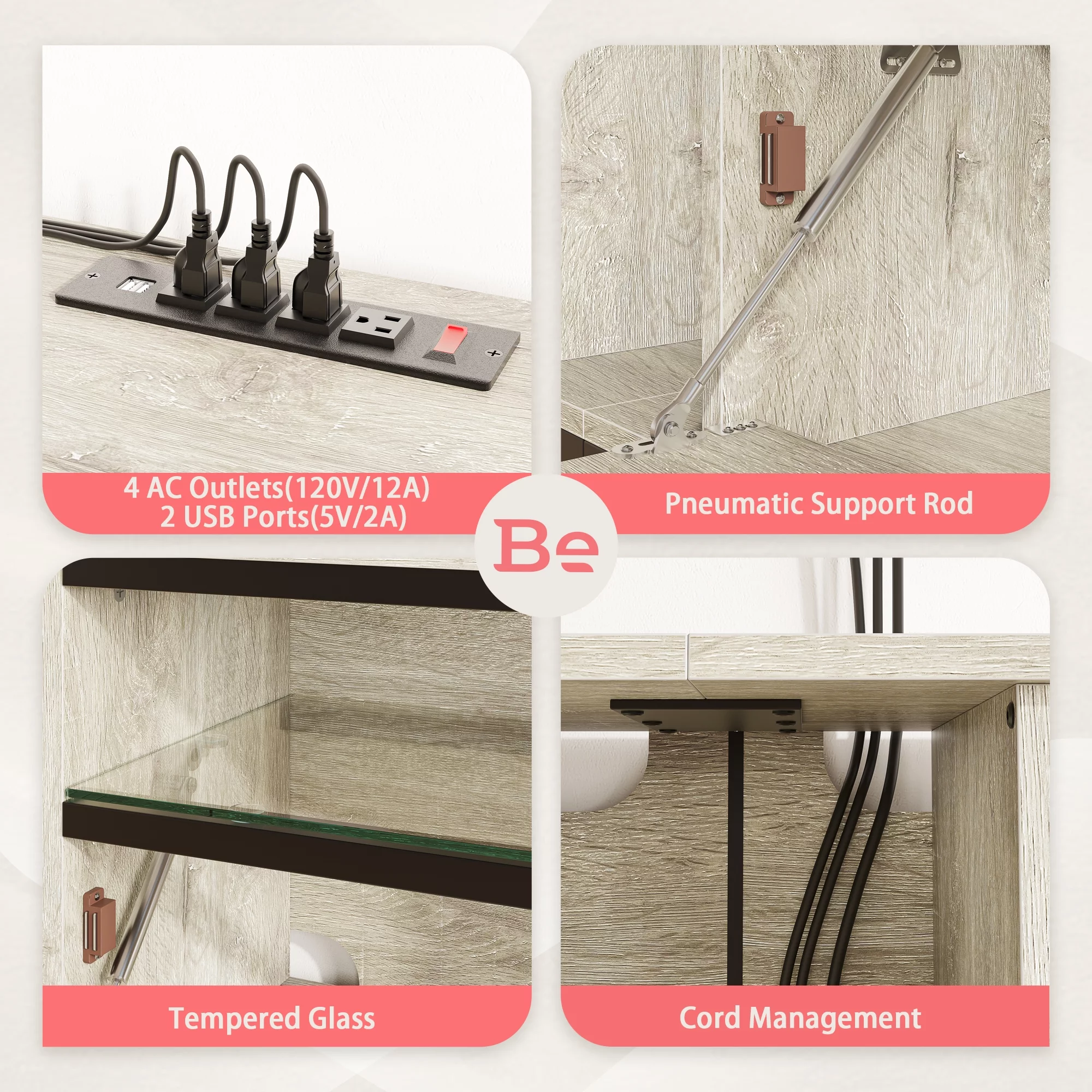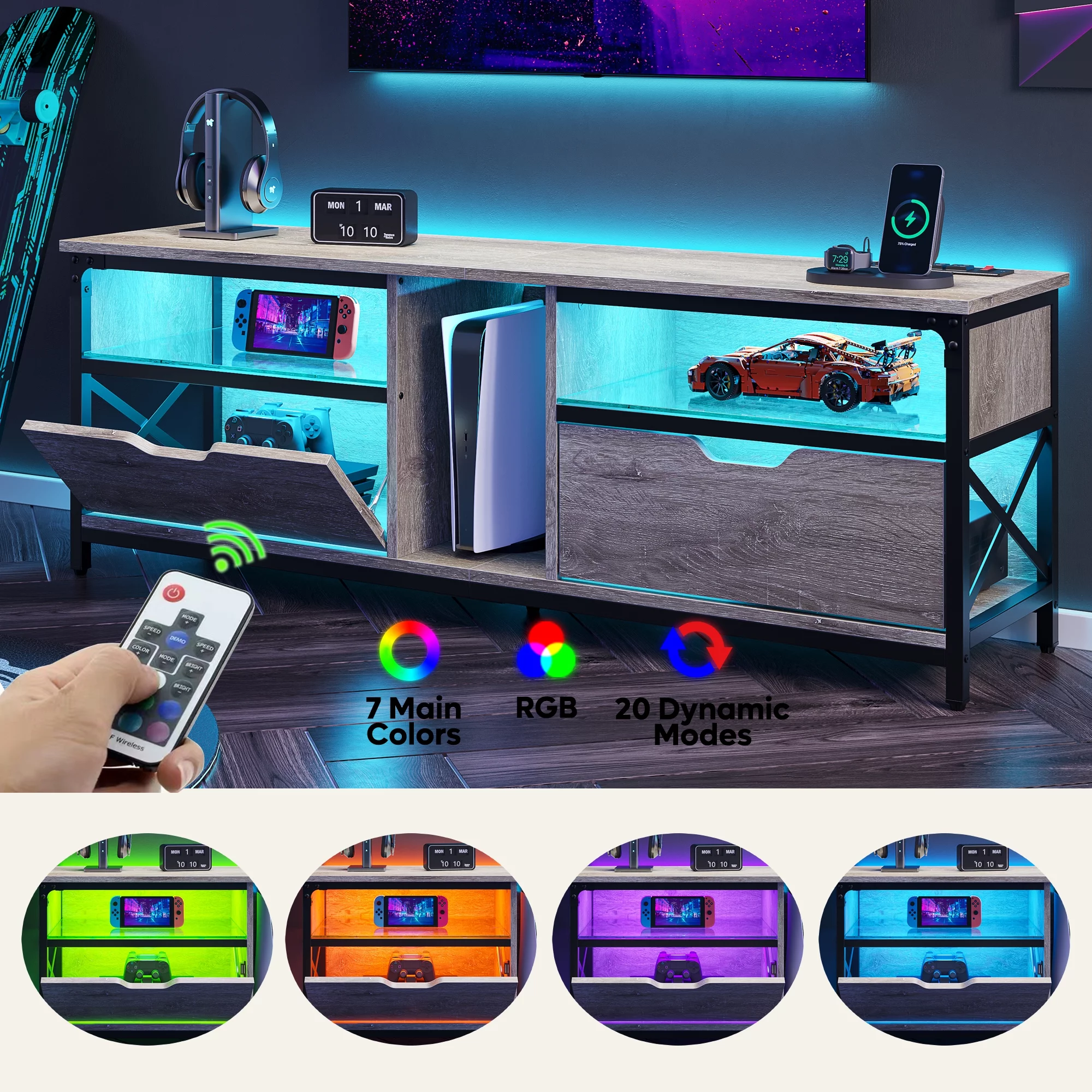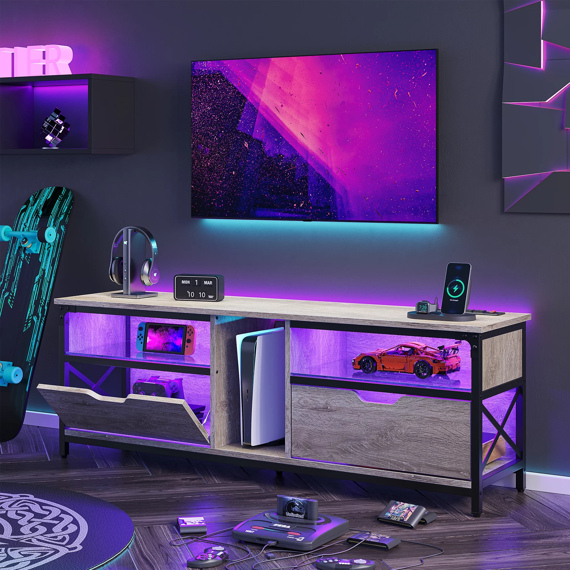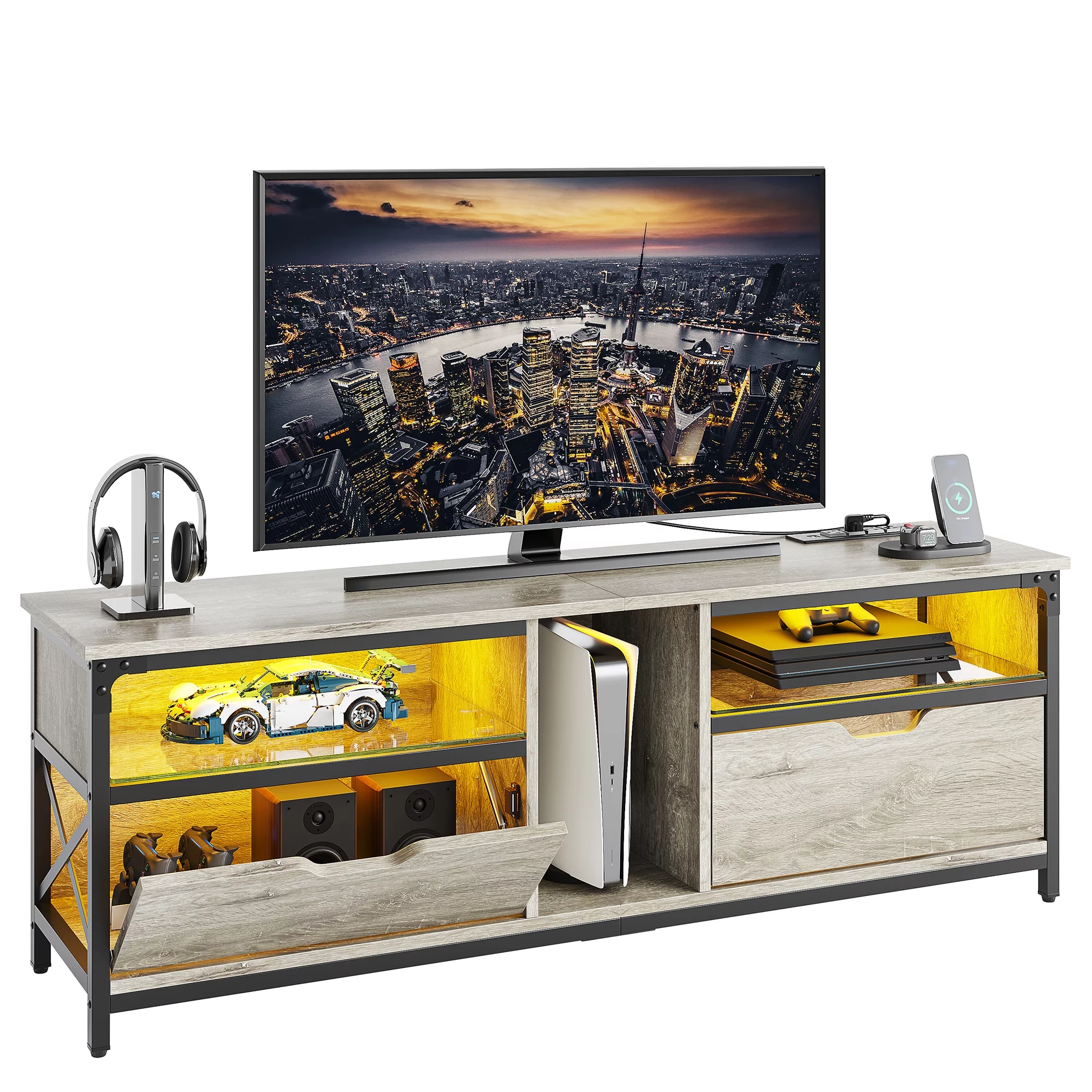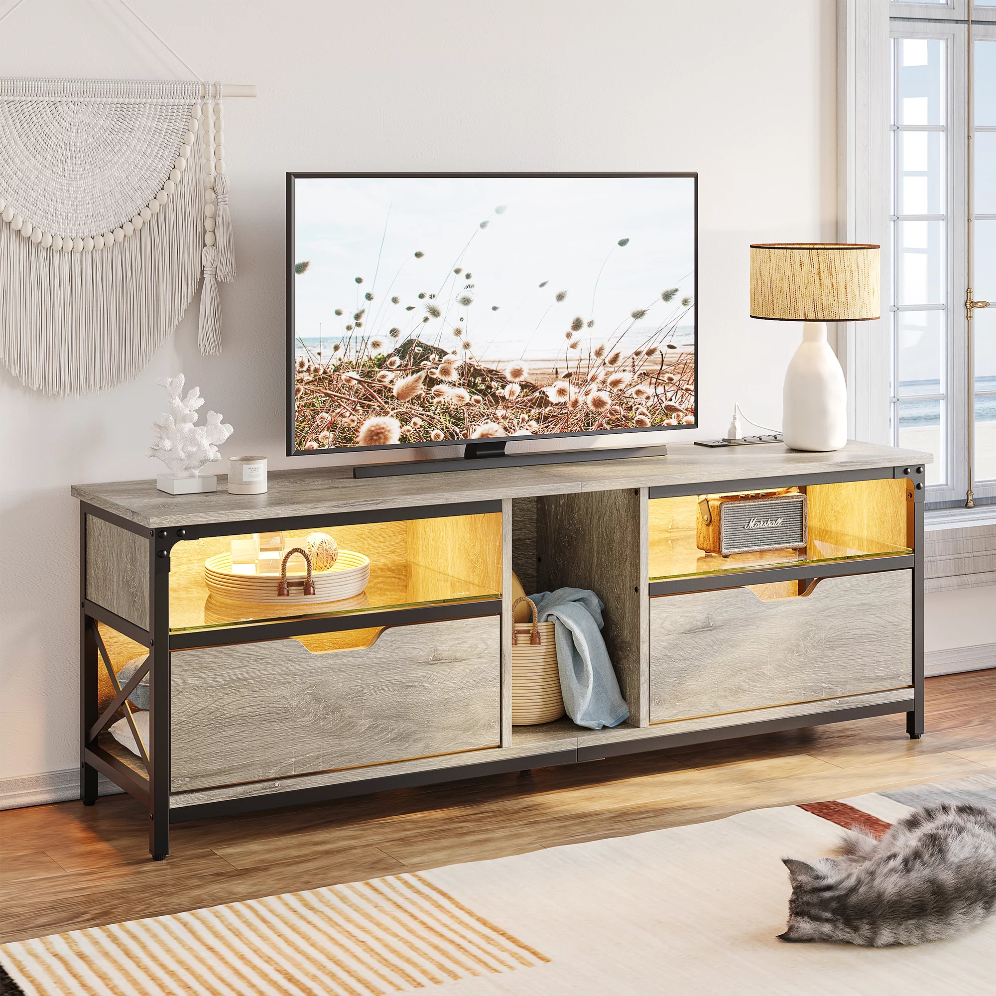 Bestier Modern Farmhouse TV Stand for TVs up to 70" with Charging Station & LED Lights, Gray