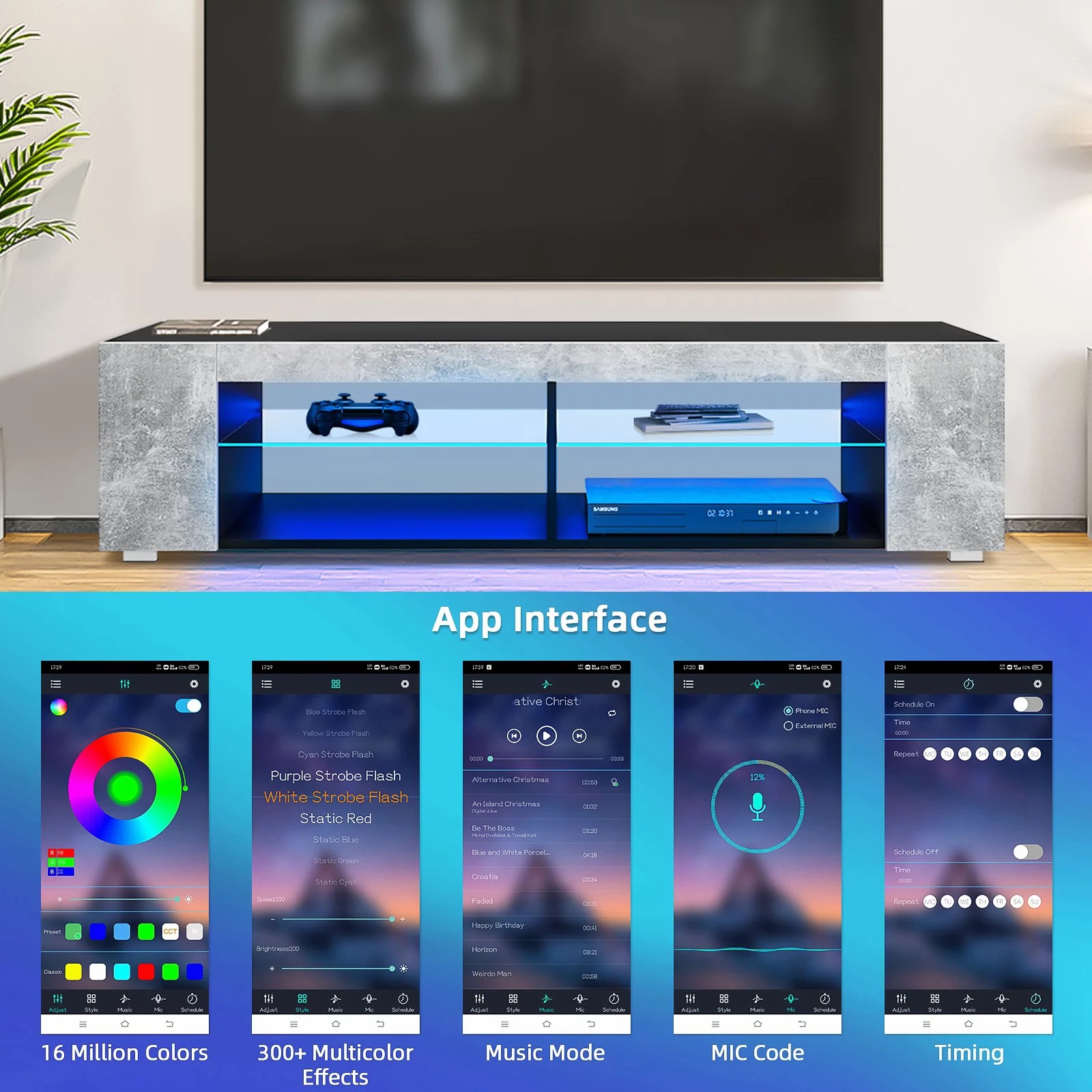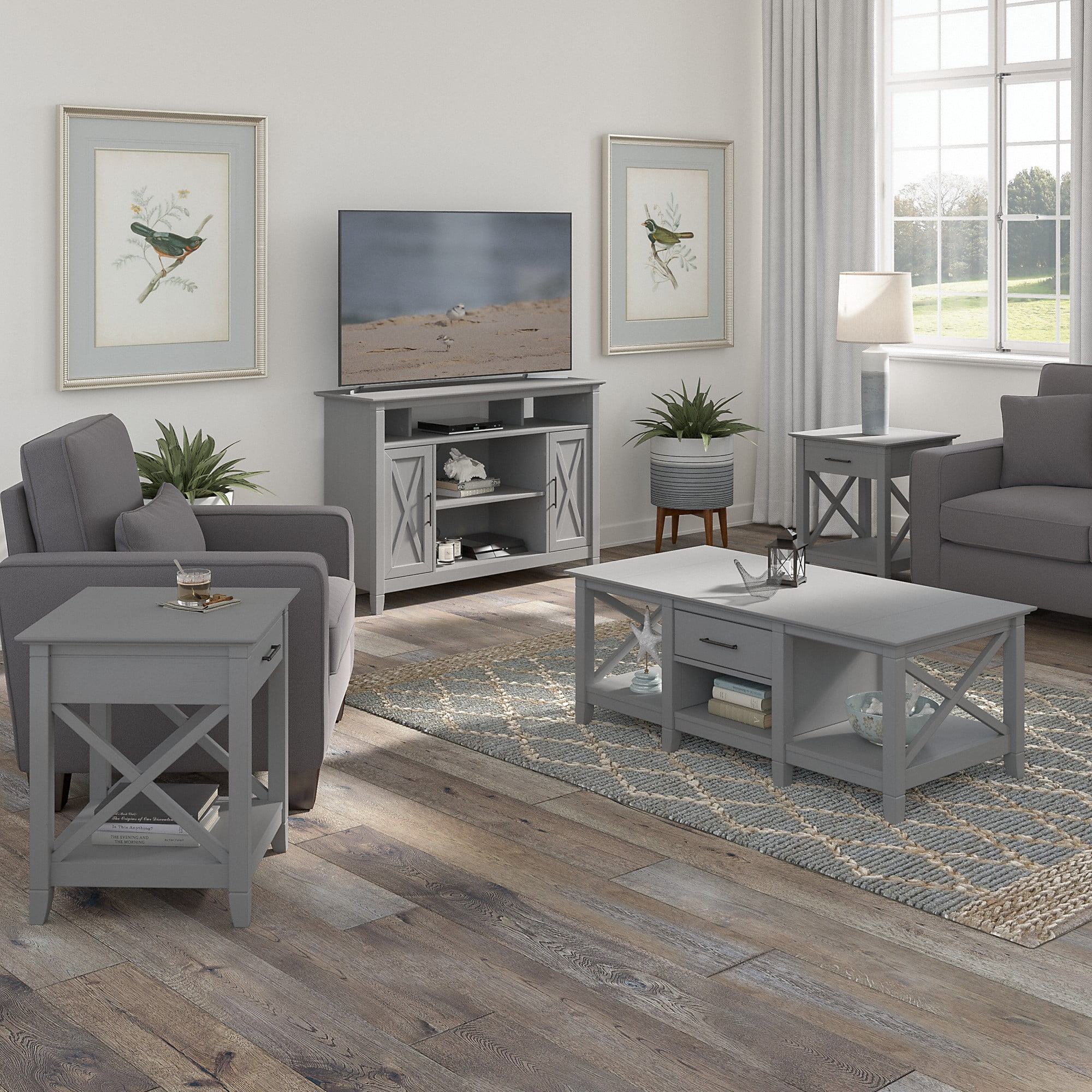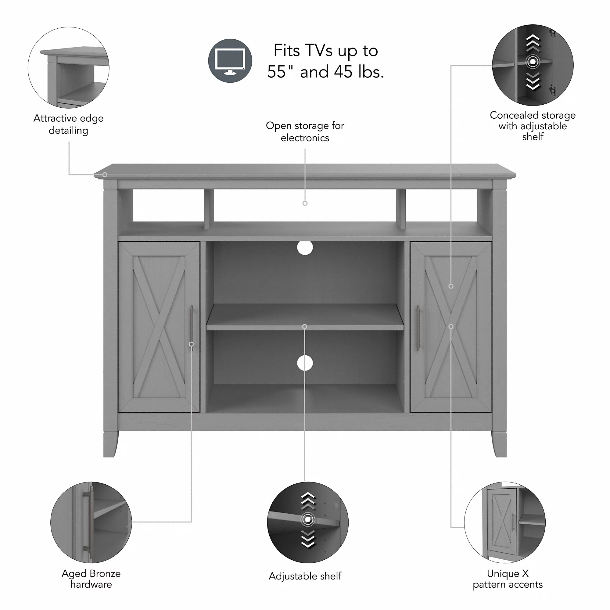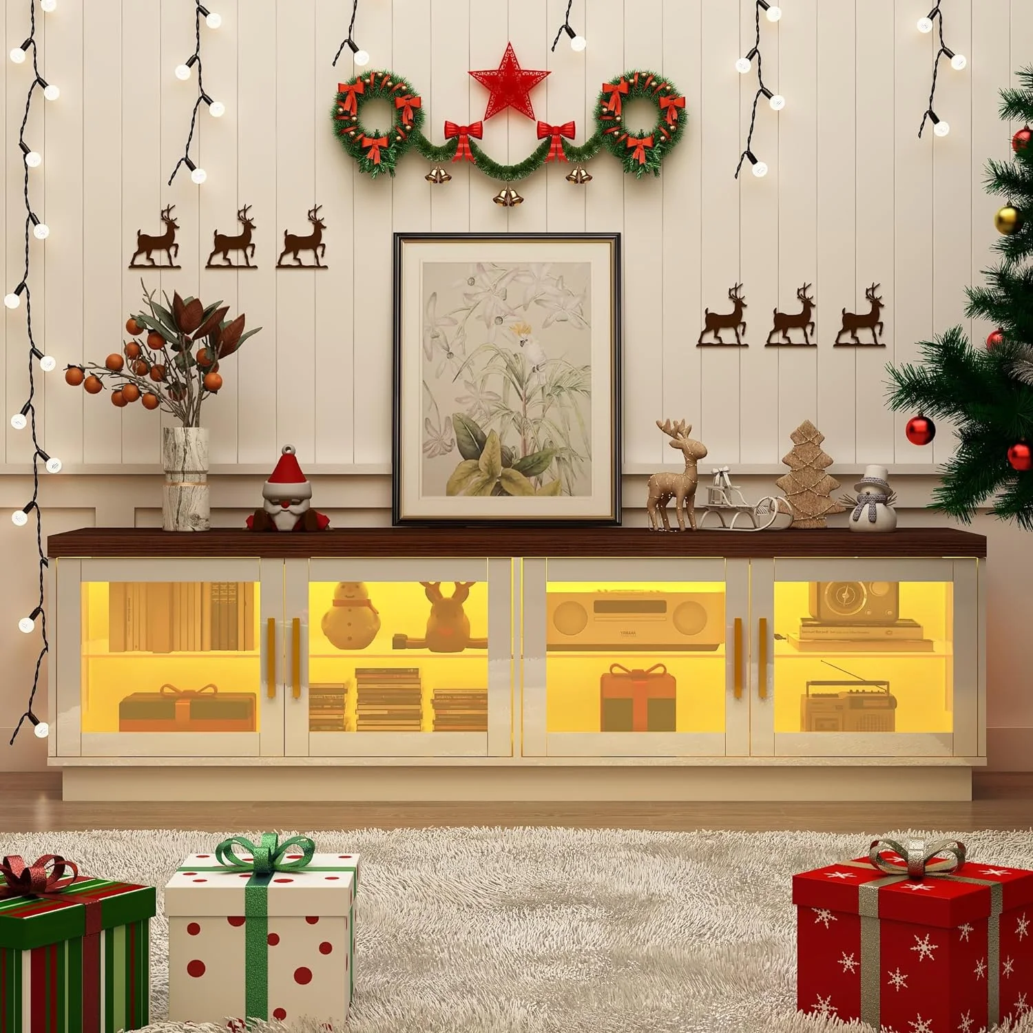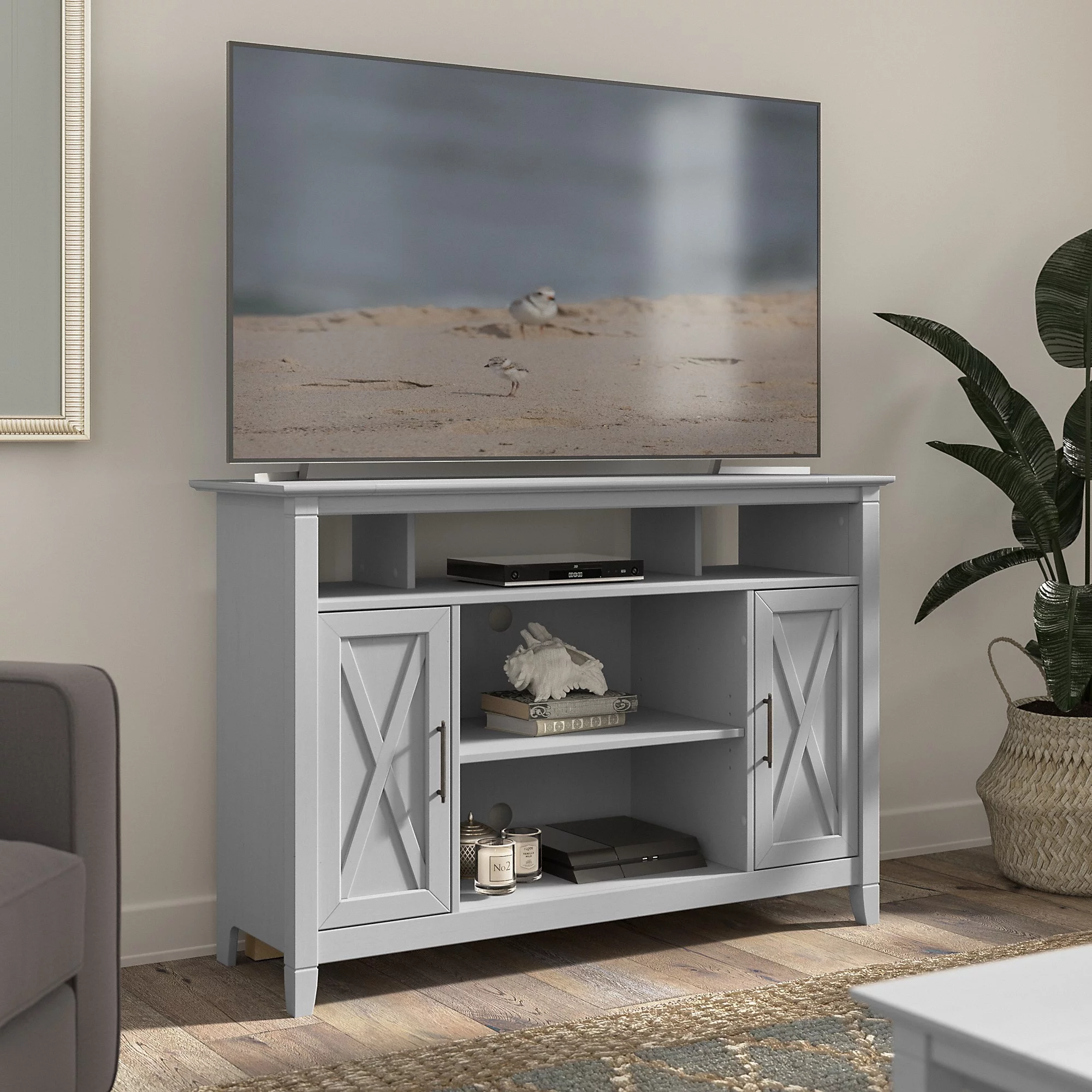 Bestier Modern Farmhouse TV Stand for TVs up to 70" with Charging Station & LED Lights, Gray