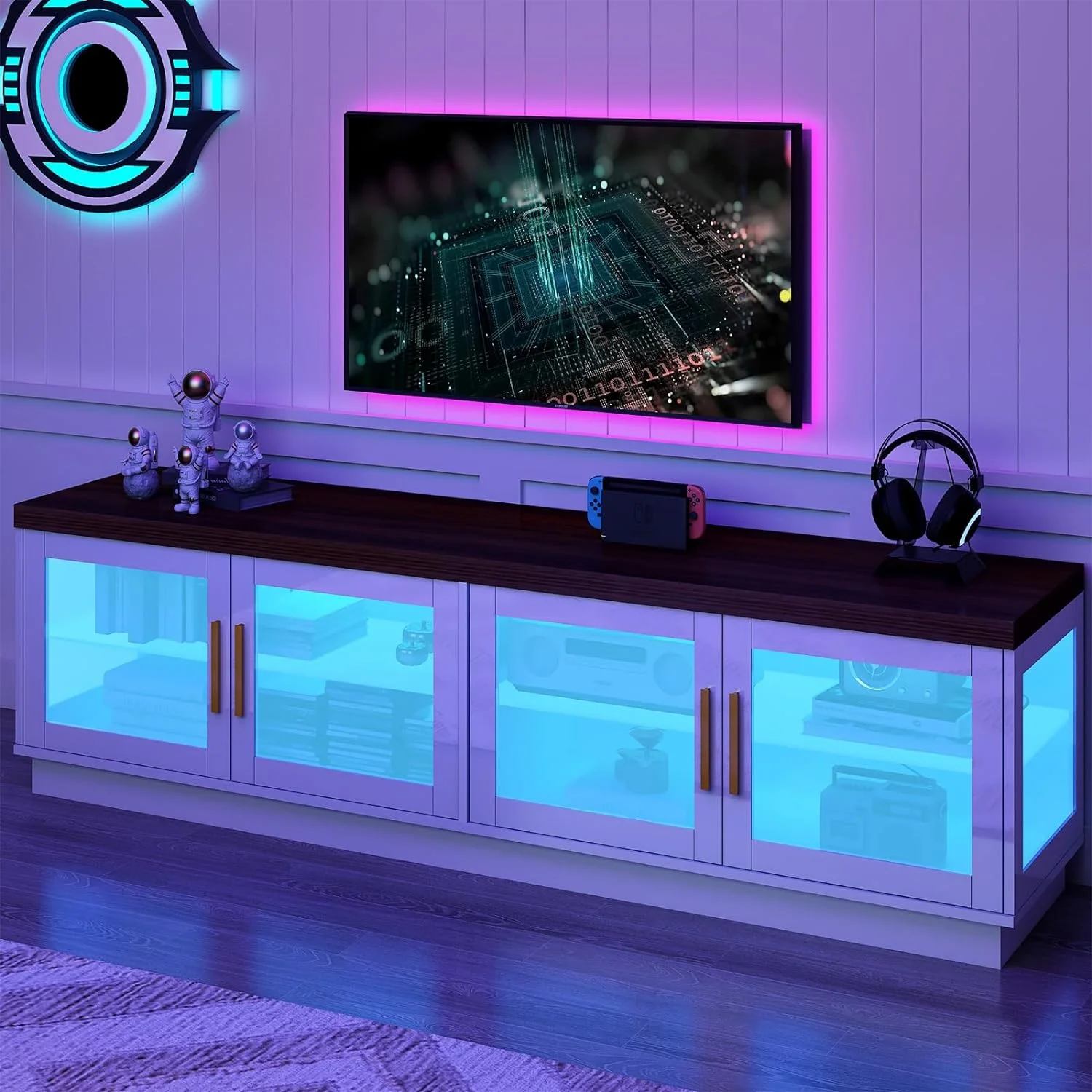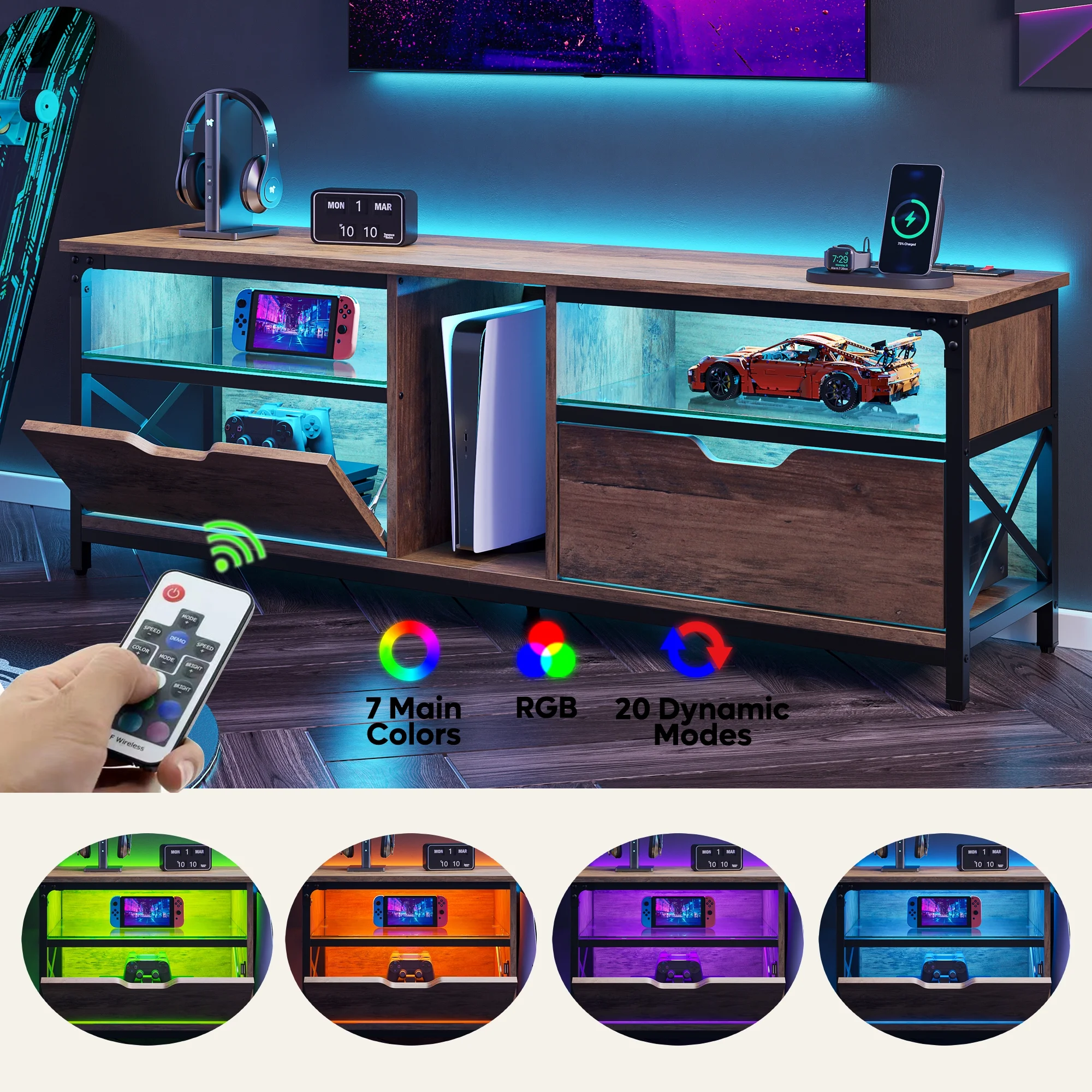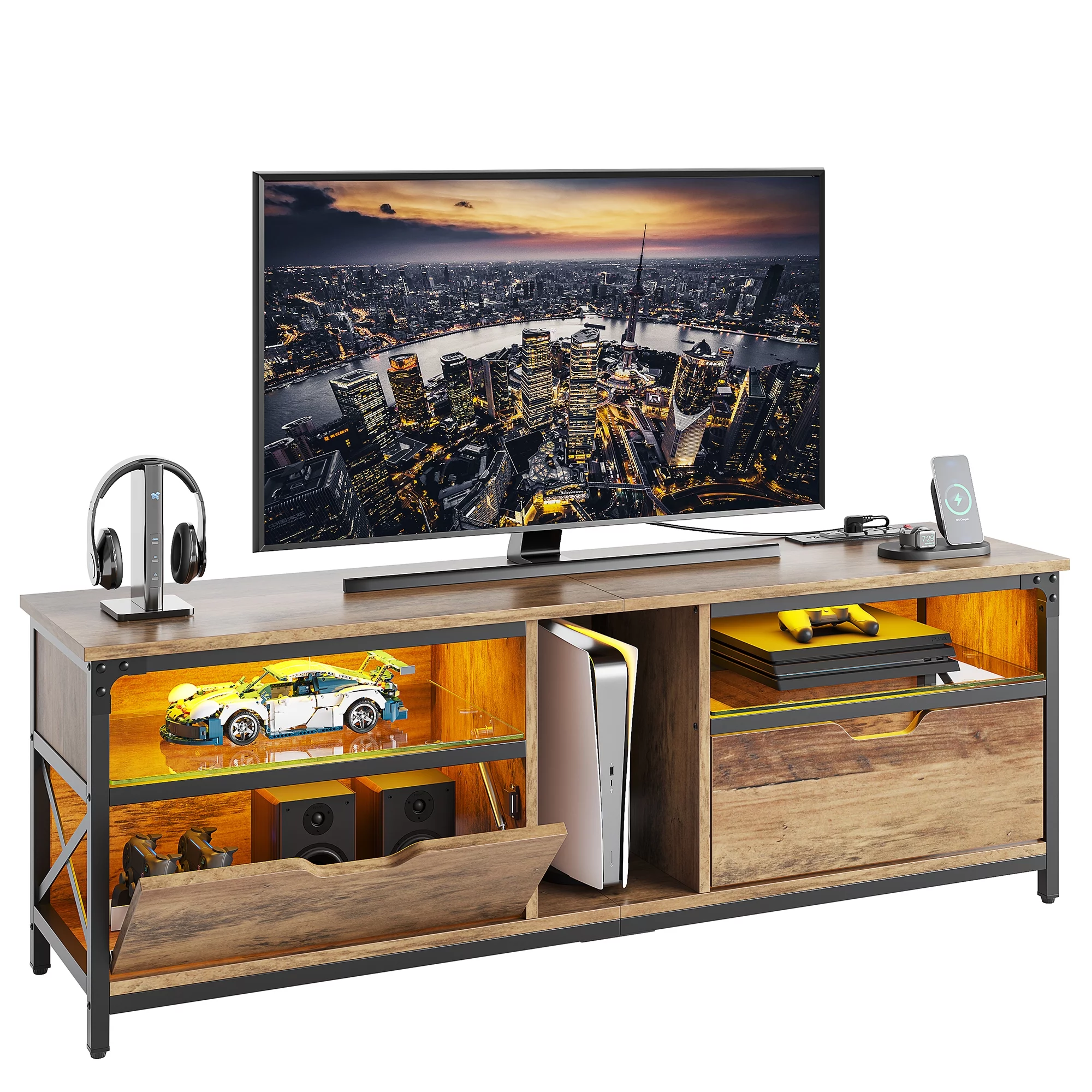 Bestier Modern Farmhouse TV Stand for TVs up to 70" with Charging Station & LED Lights, Weathered Rustic Oak