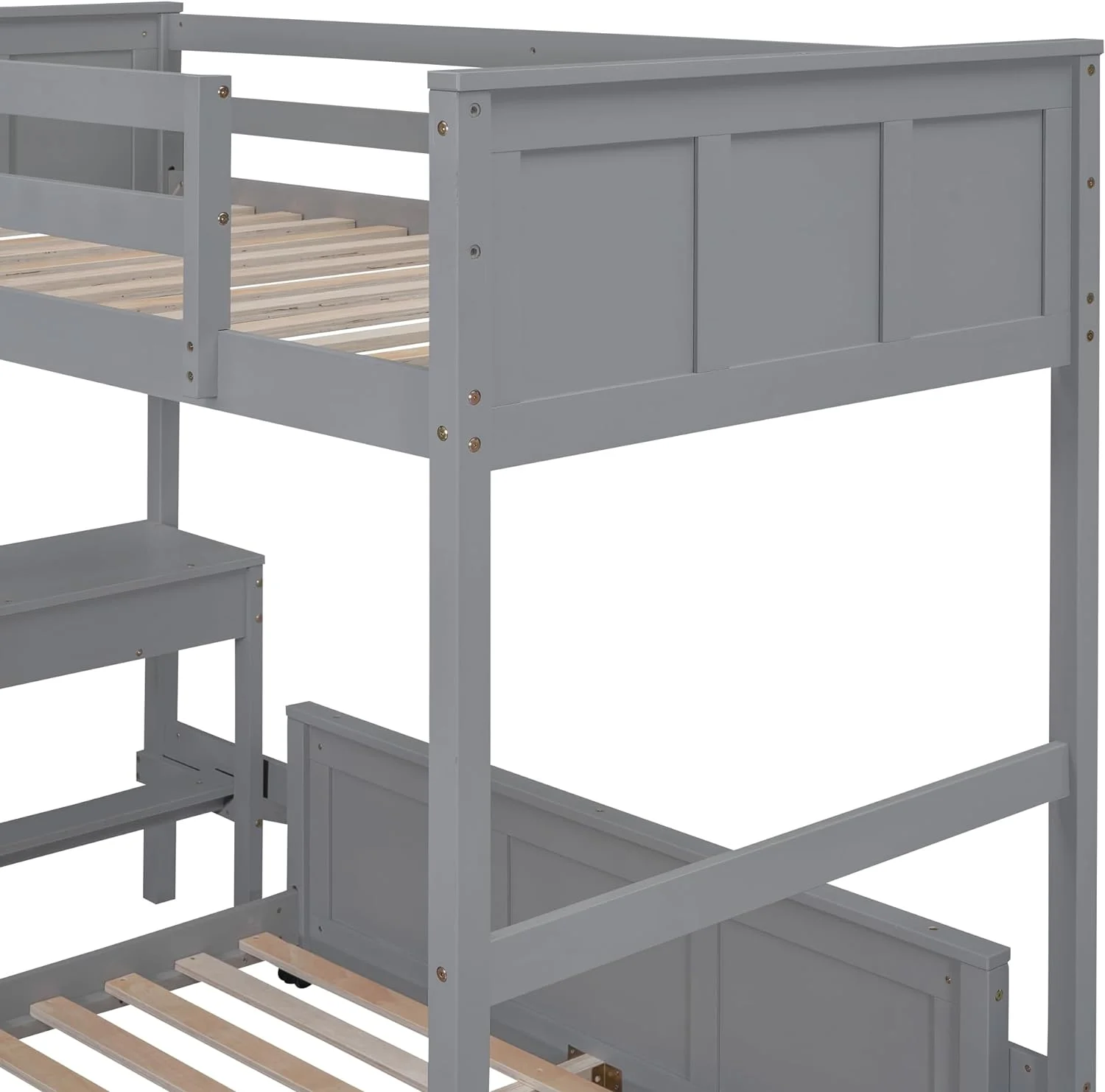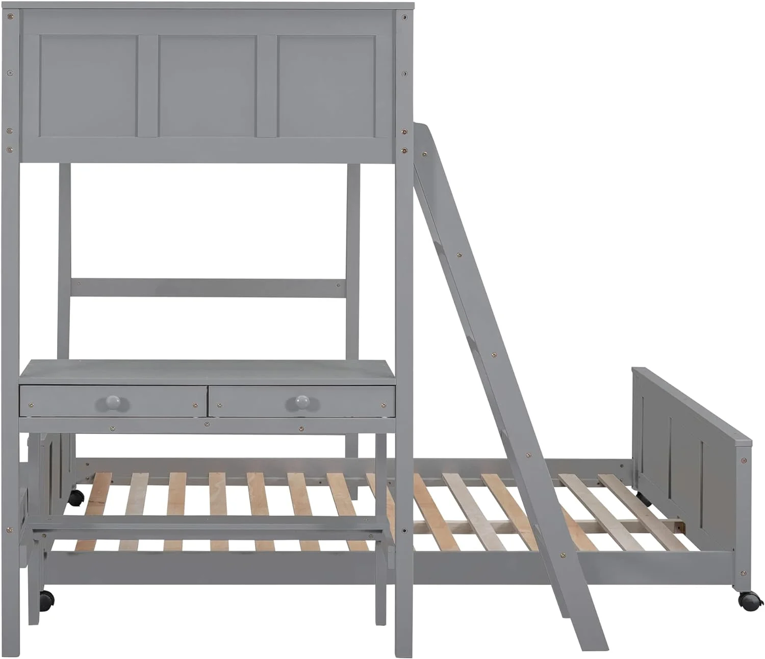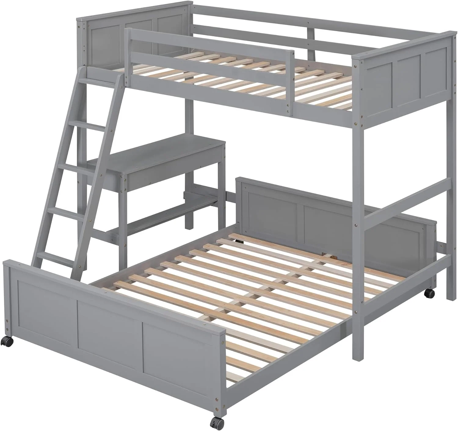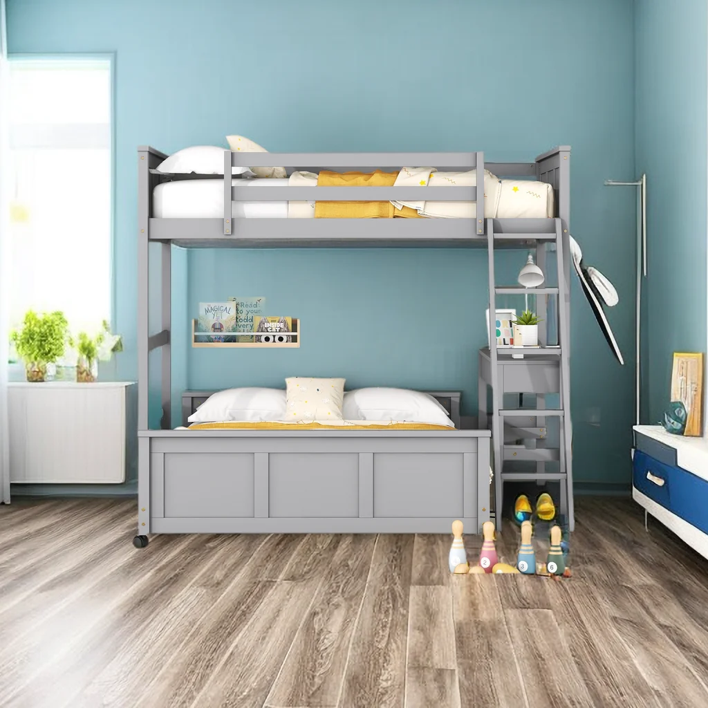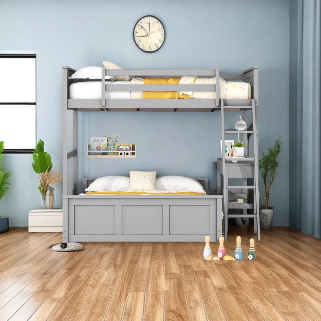 Twin Over Full Bunk Bed with Built-in Desk w/Drawers,L Shaped Wood Bunkbeds Frame with Ladder and Guardrail