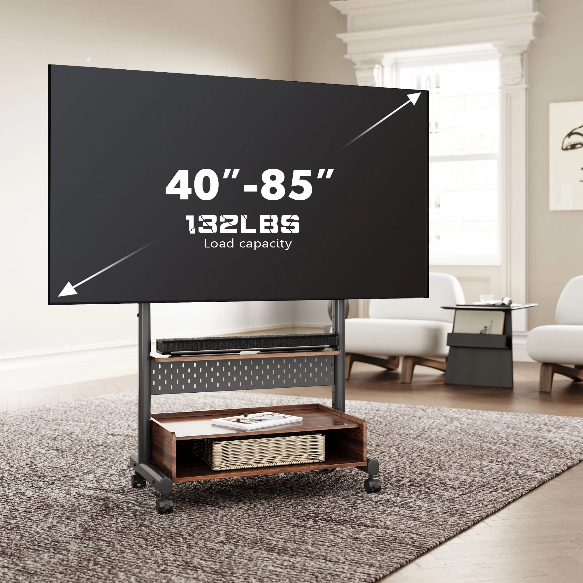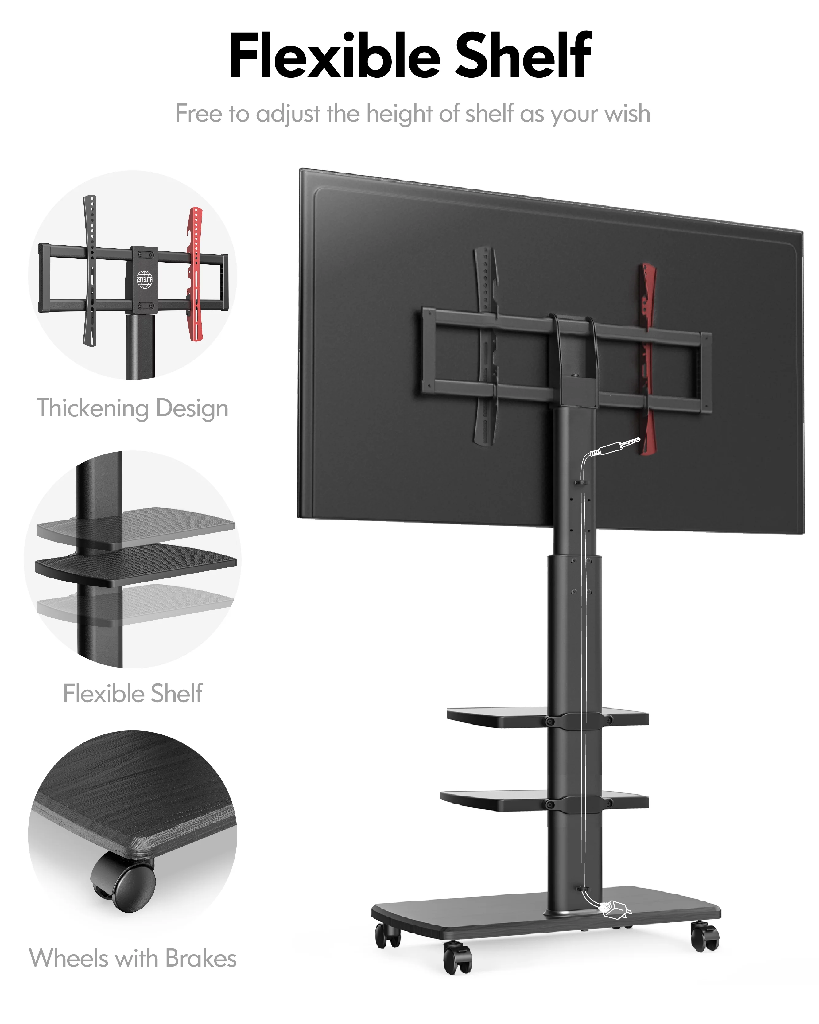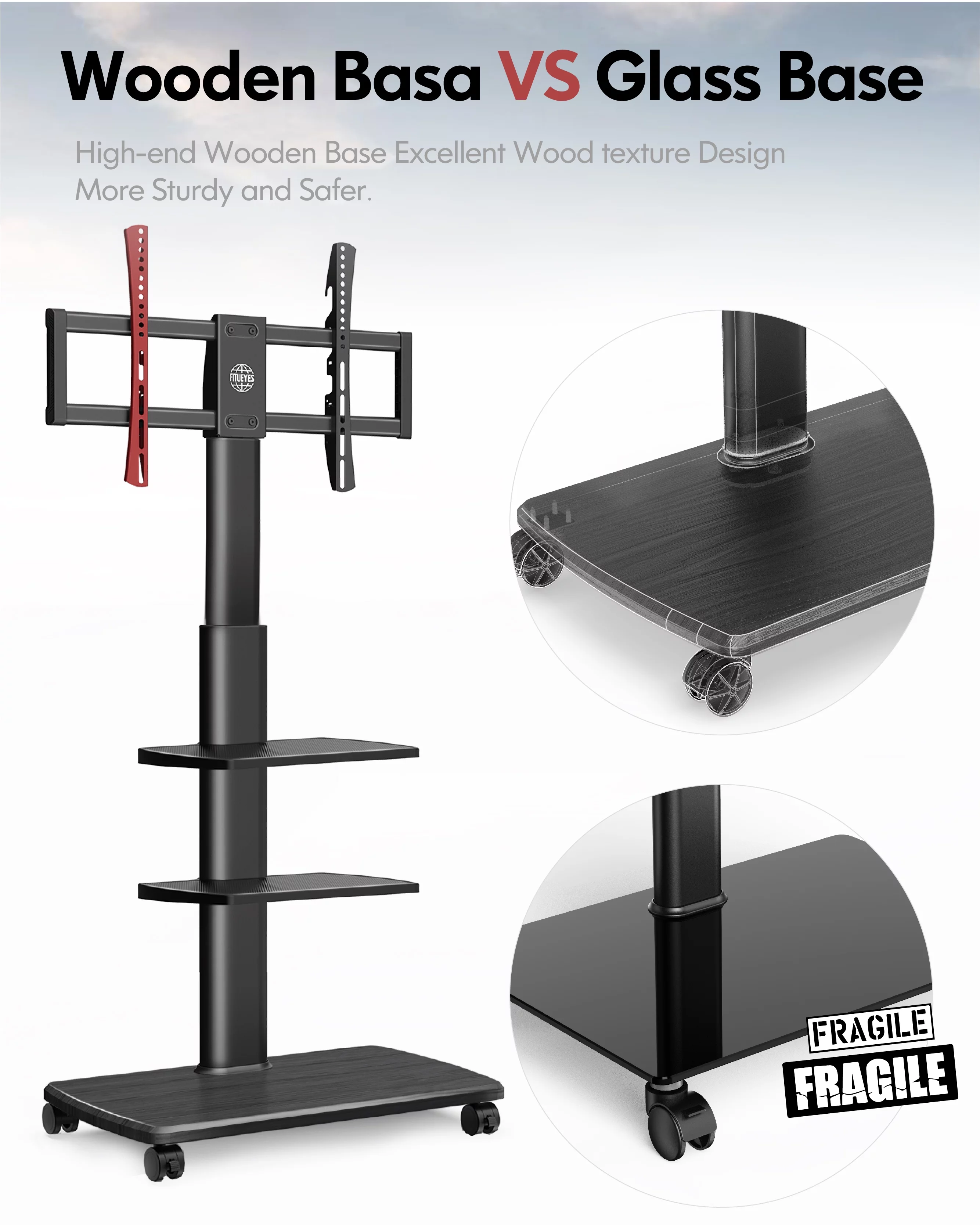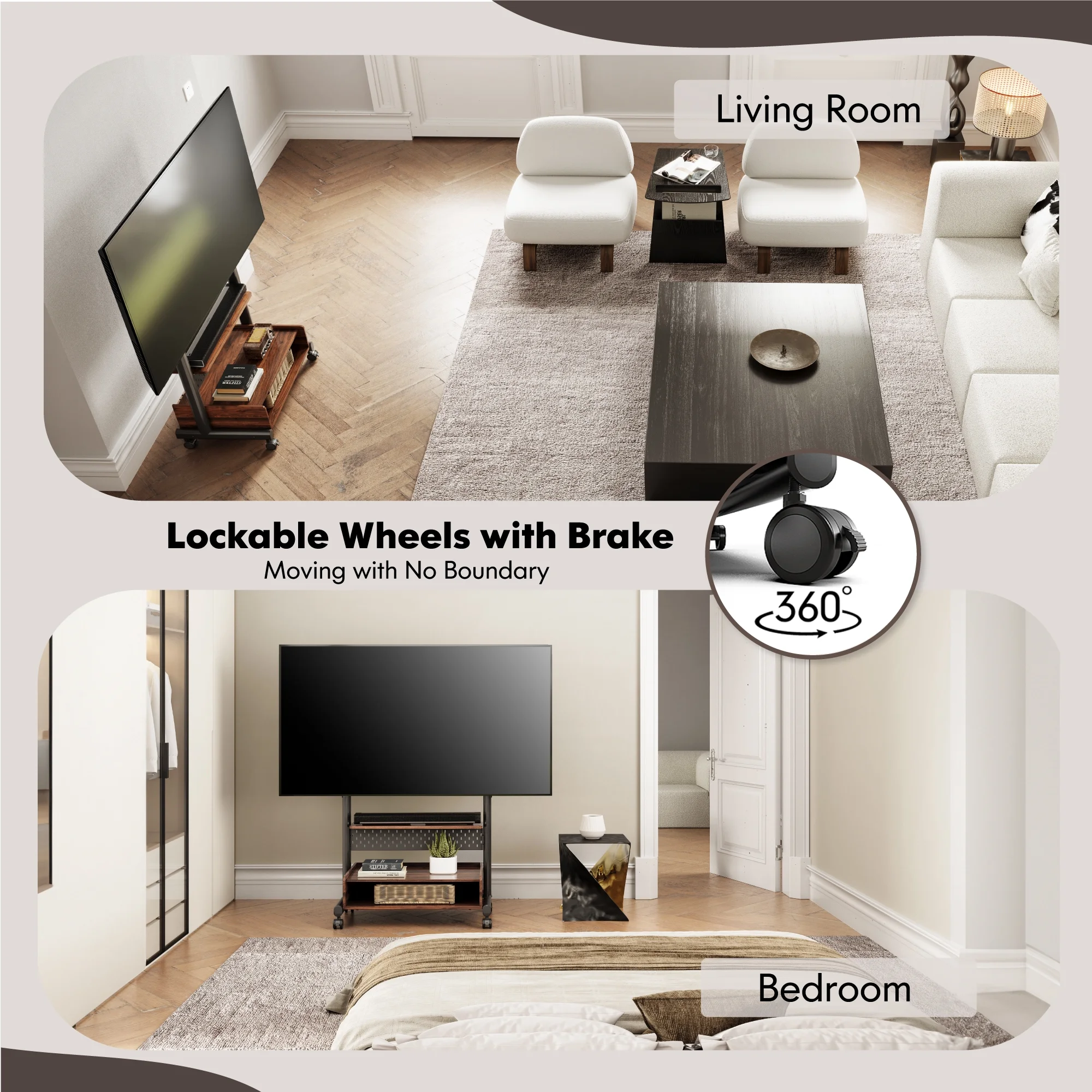 Floor TV Stand For Tvs up To 65”, Black & Modern Mobile TV Stand on Wheels, Wooden Base