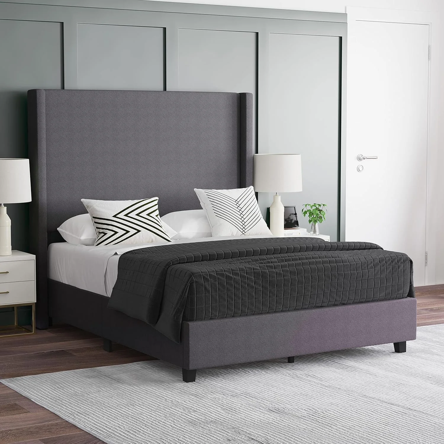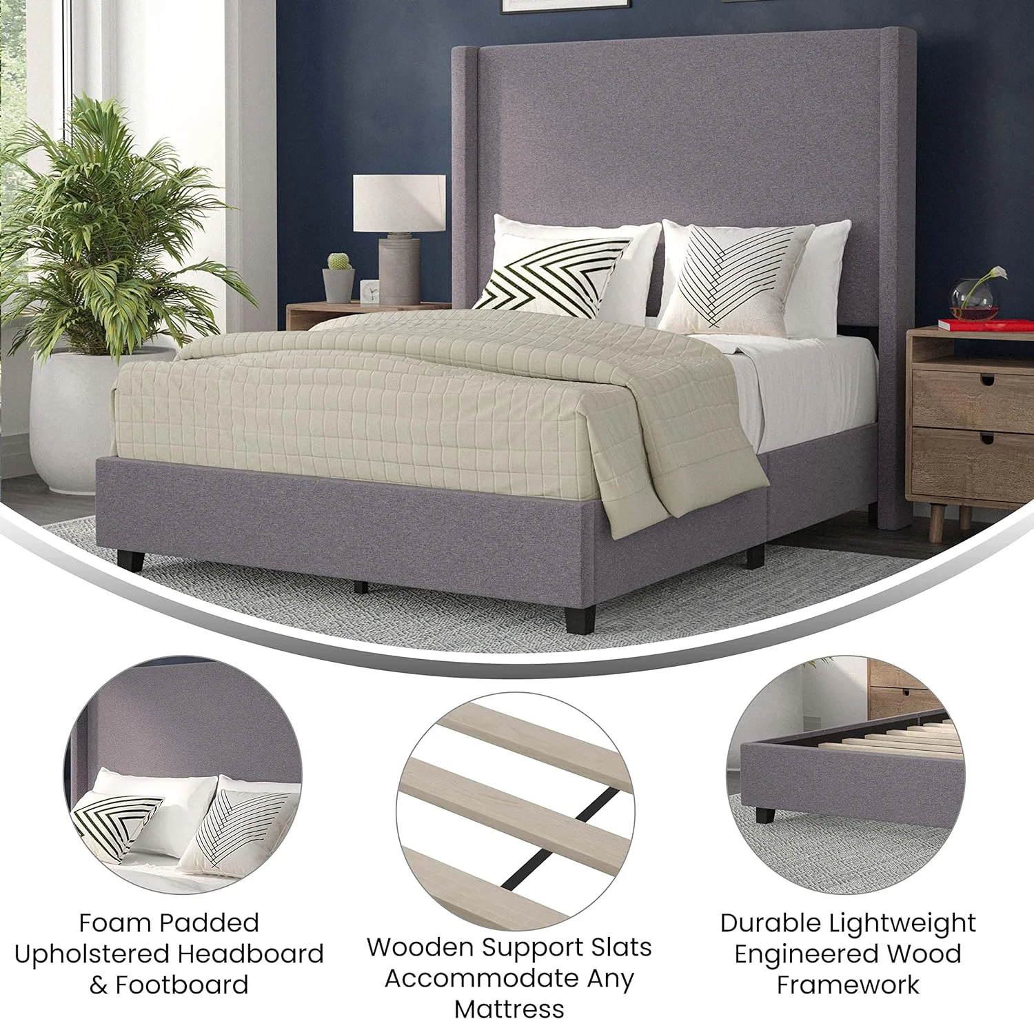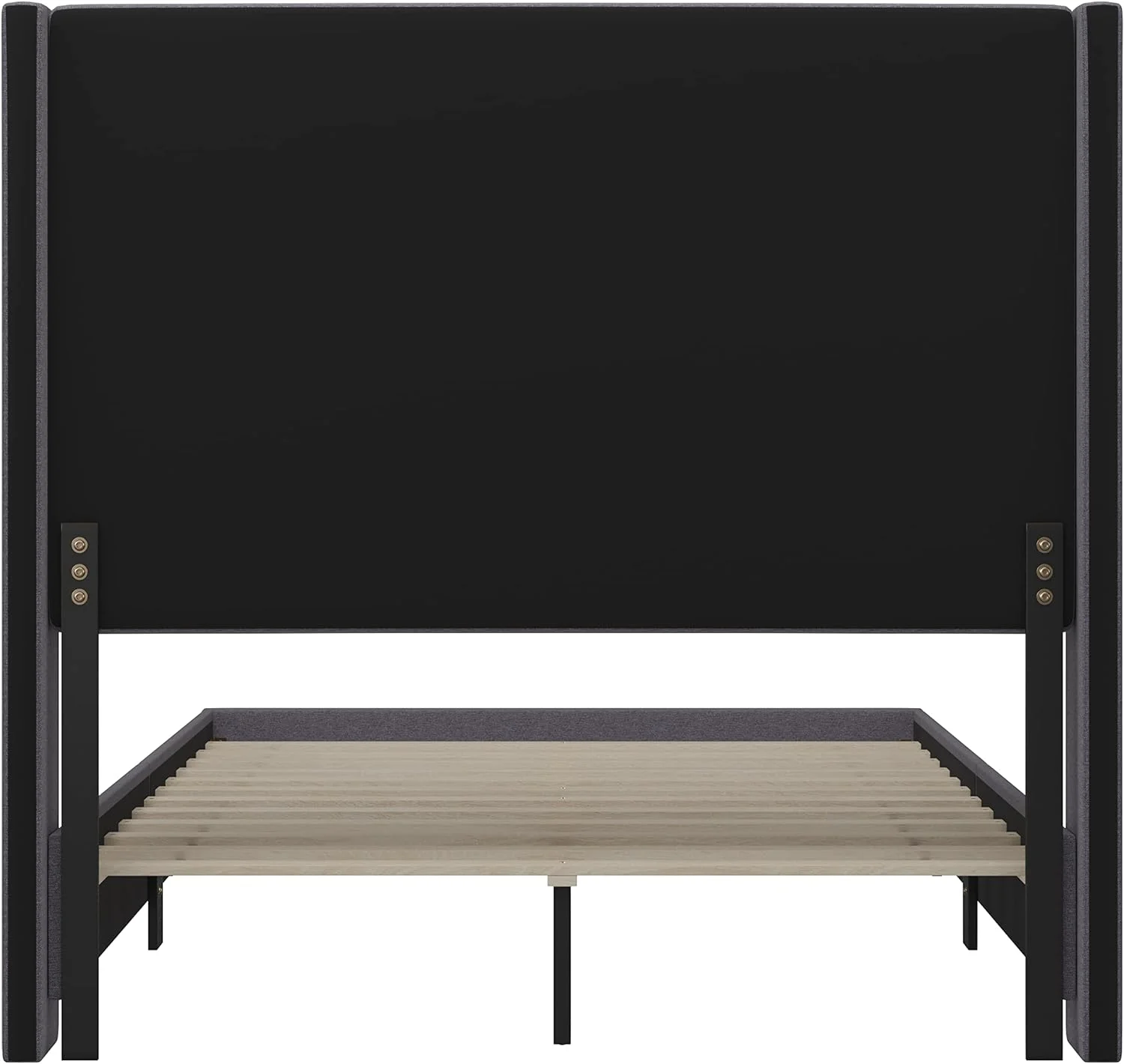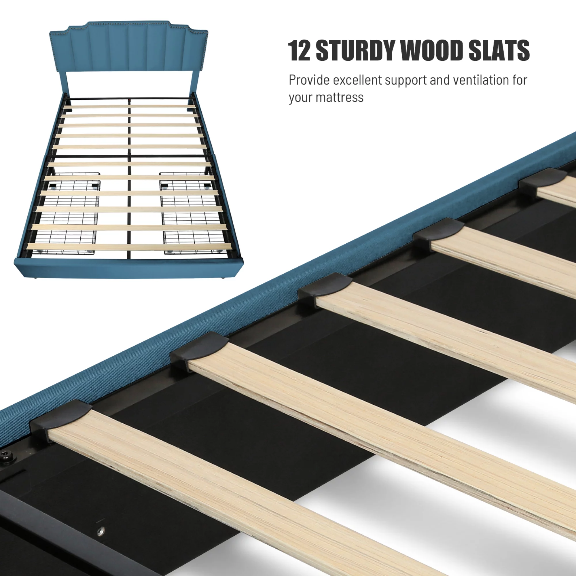 OWSOO Queen Size Platform Bed with Under Bed Stripe PU Leather Padded Headboard Wooden Slats System Easy Assembly Black