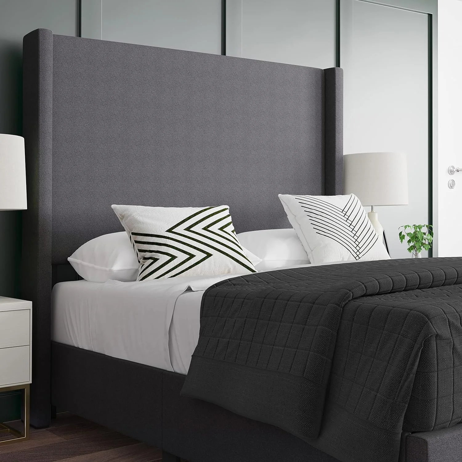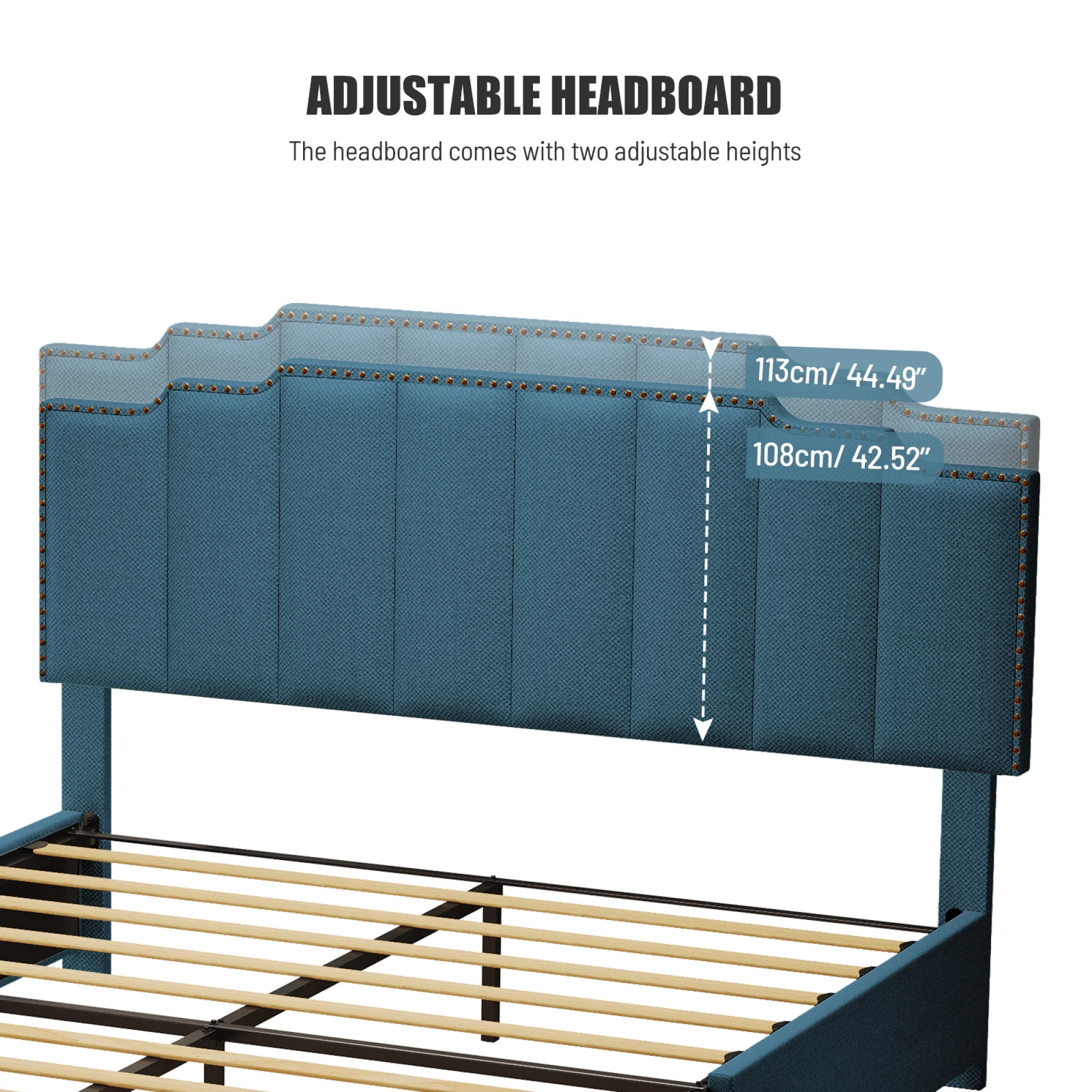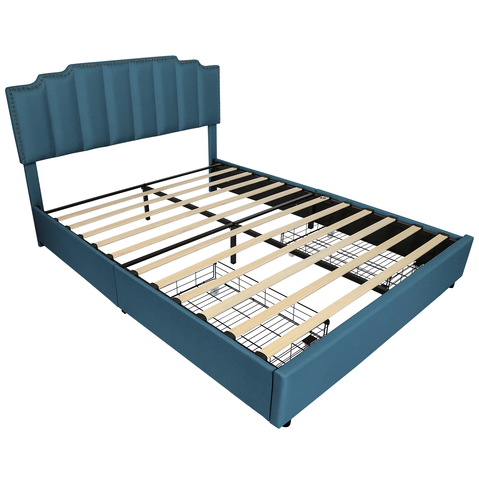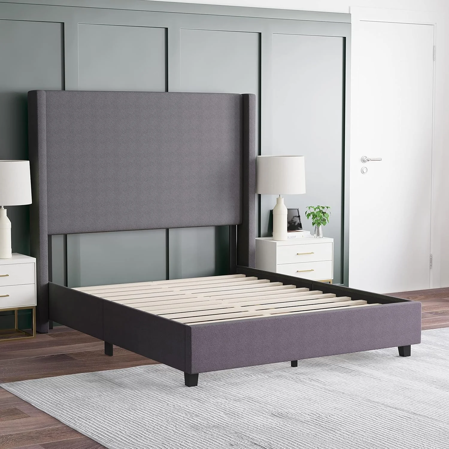 OWSOO Queen Size Platform Bed with Under Bed Stripe PU Leather Padded Headboard Wooden Slats System Easy Assembly Black