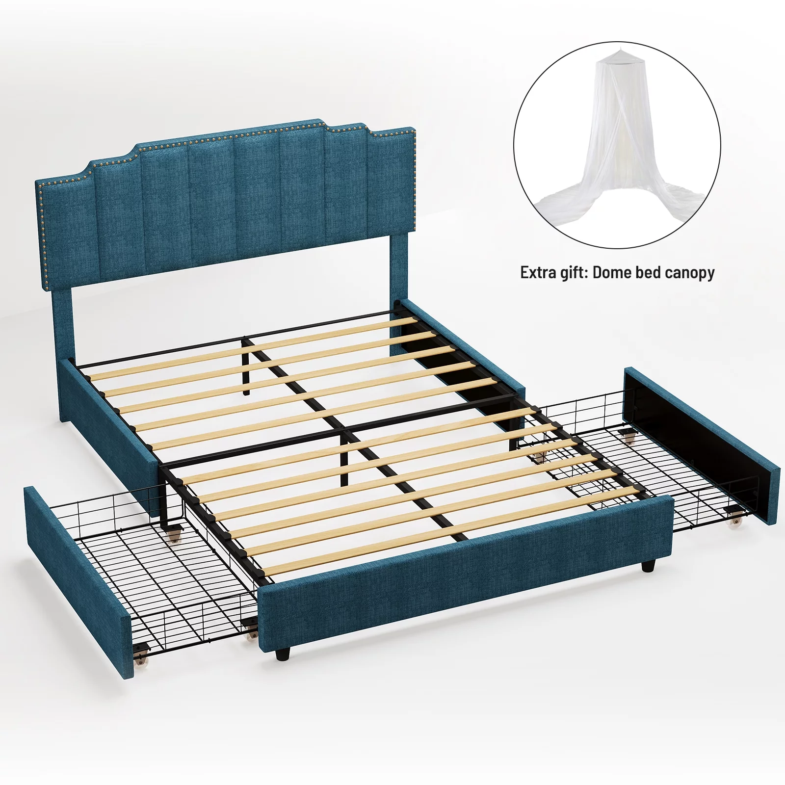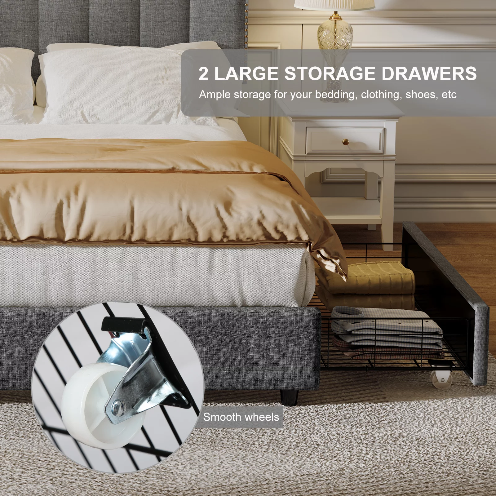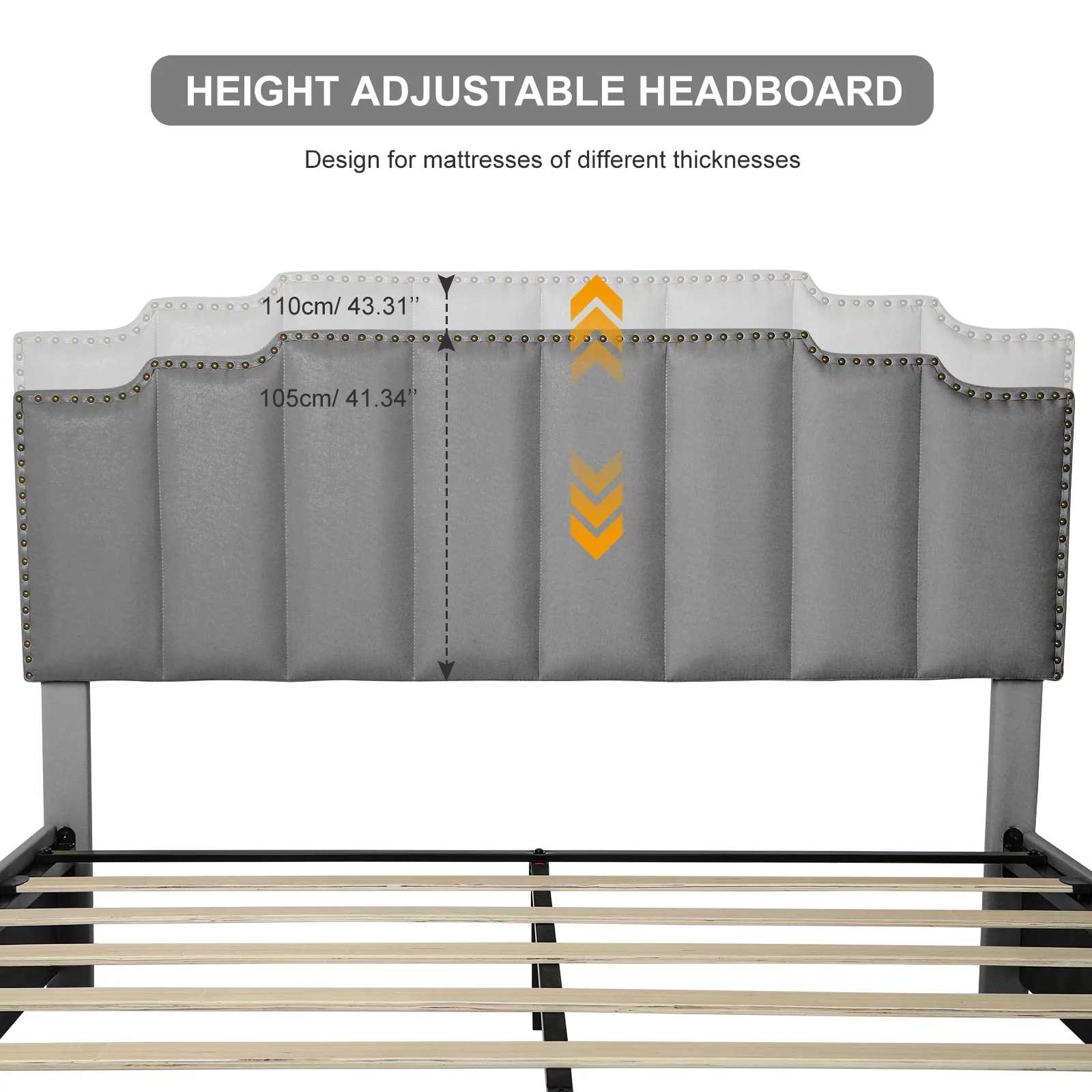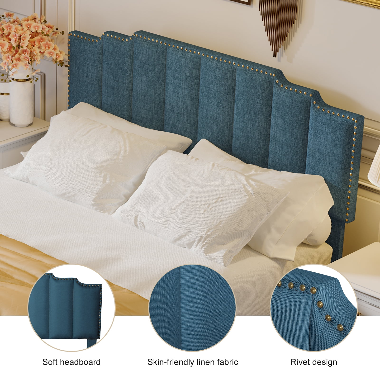 OWSOO Queen Size Platform Bed with Under Bed Stripe PU Leather Padded Headboard Wooden Slats System Easy Assembly Black