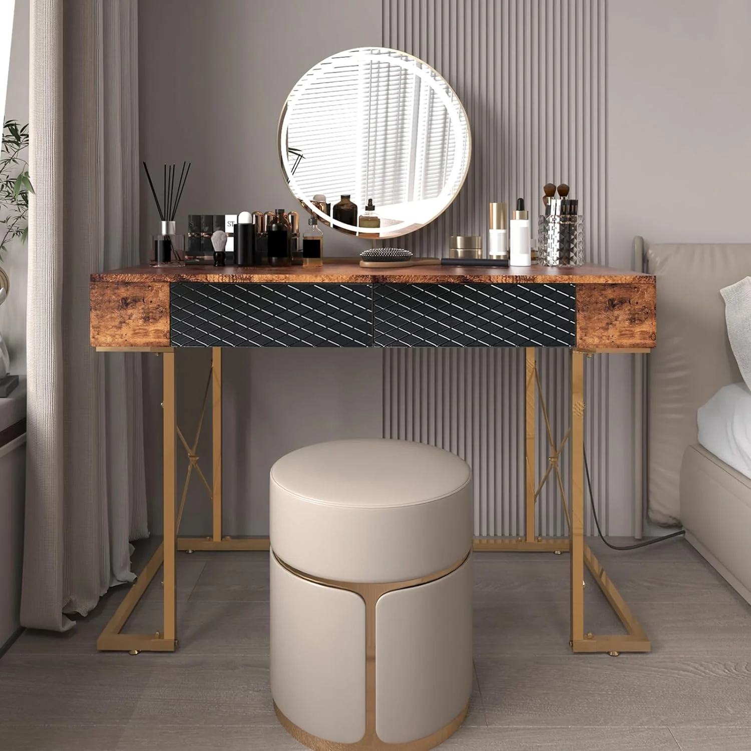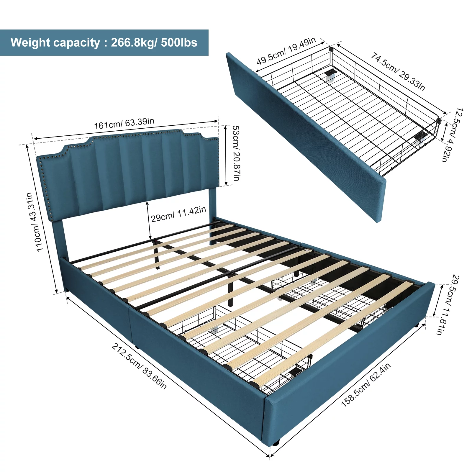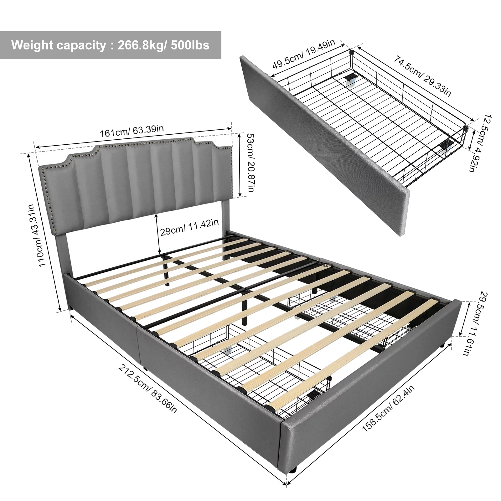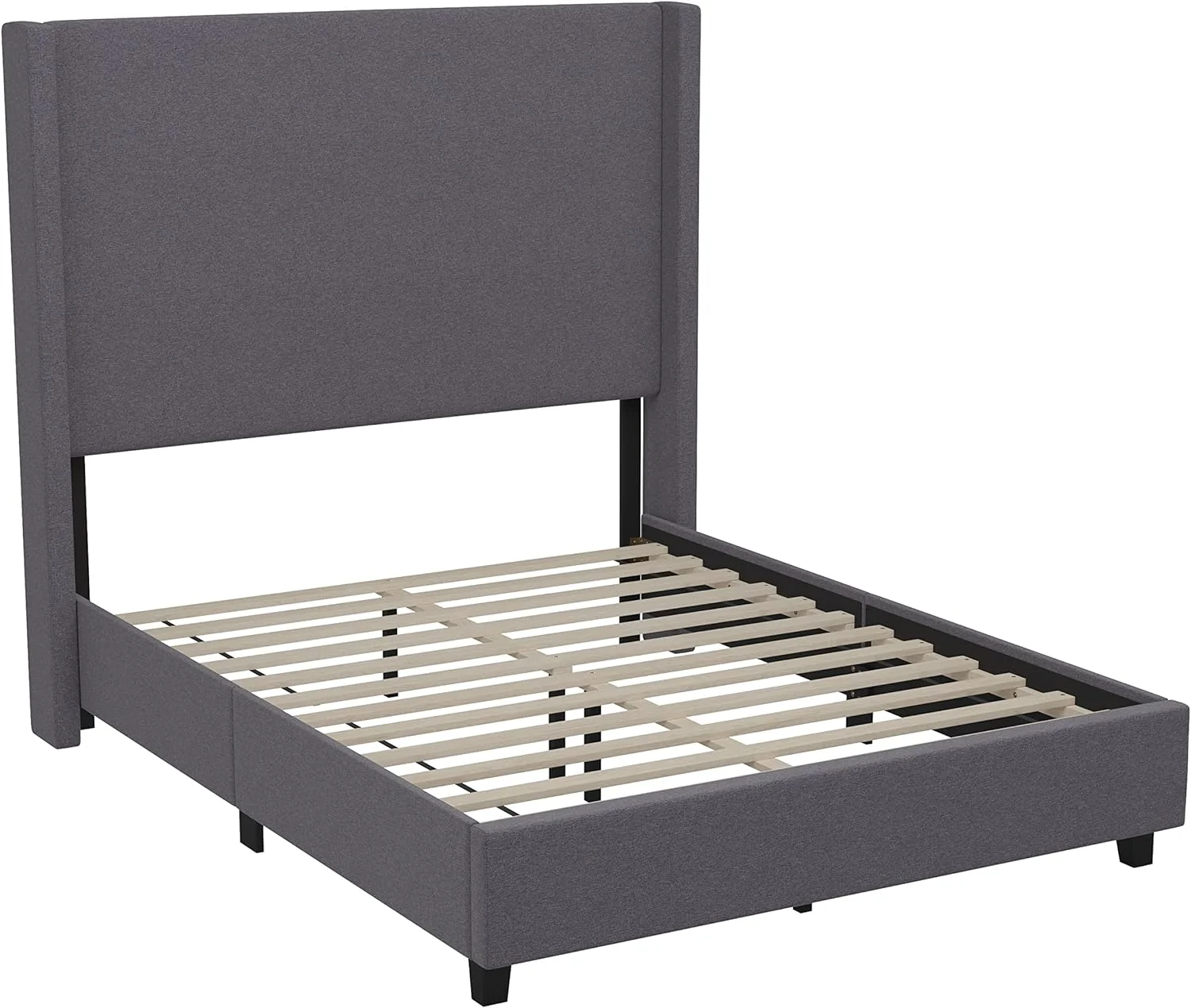 Dcenta Queen Size Platform Bed with Under Bed Stripe PU Leather Padded Headboard Wooden Slats System Easy Assembly Black