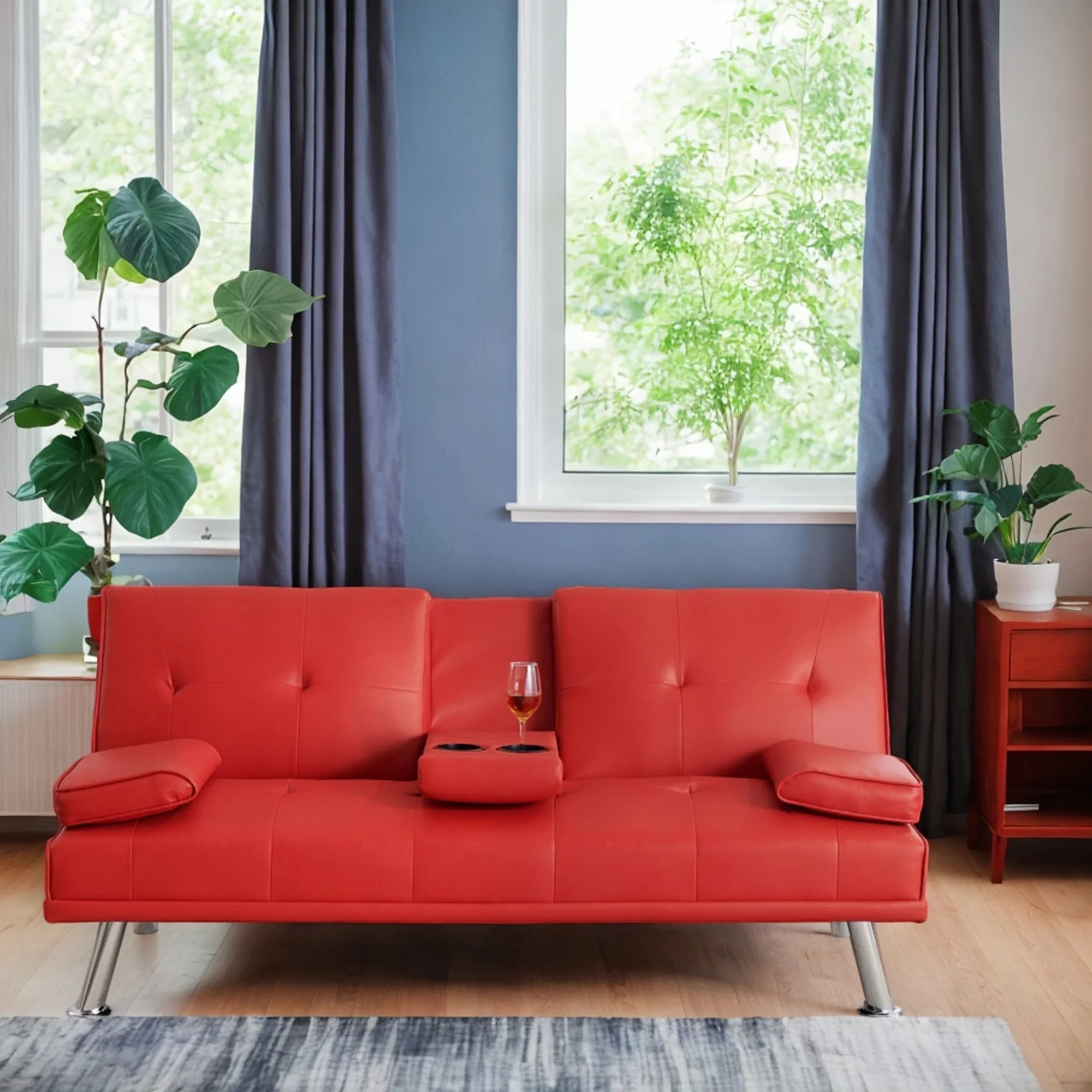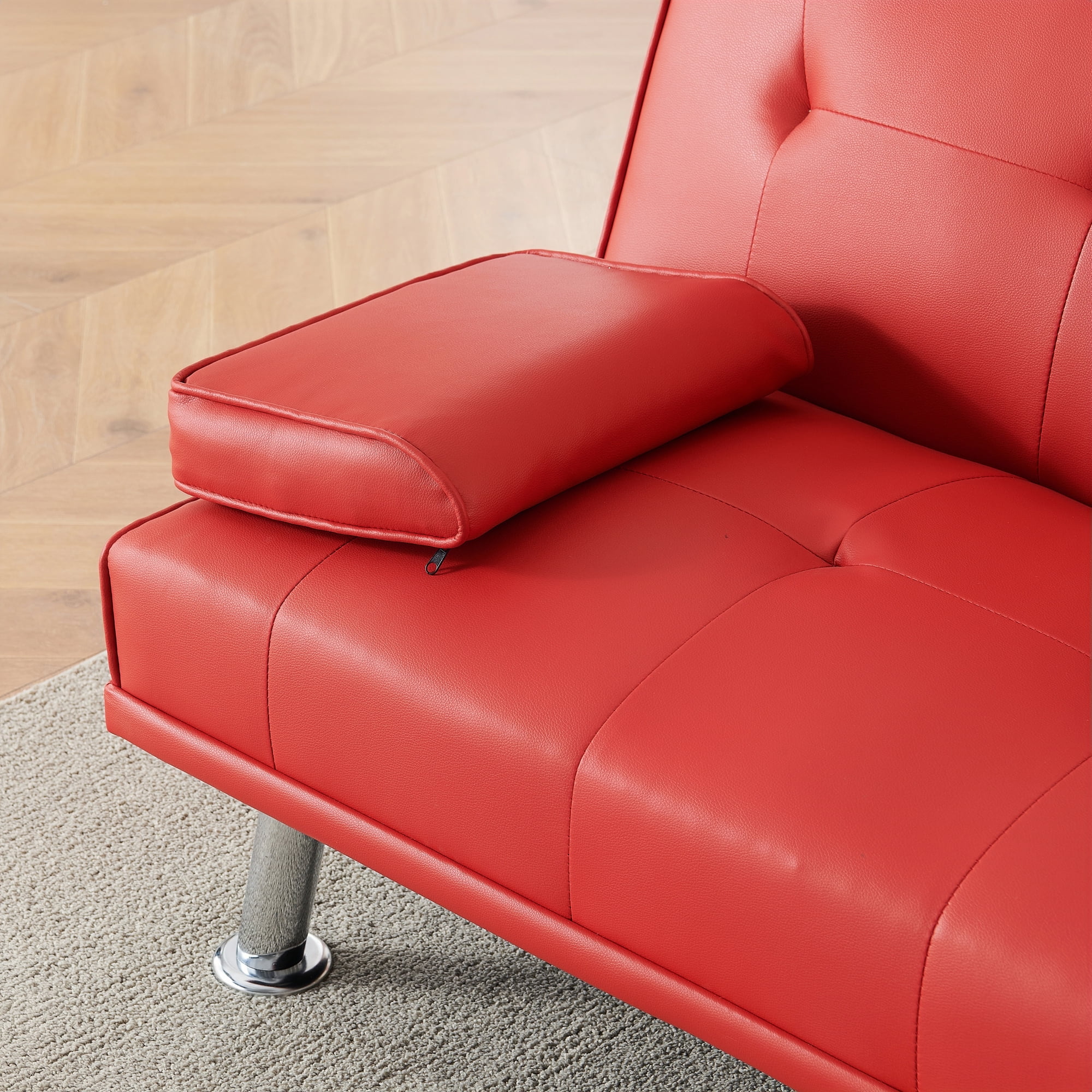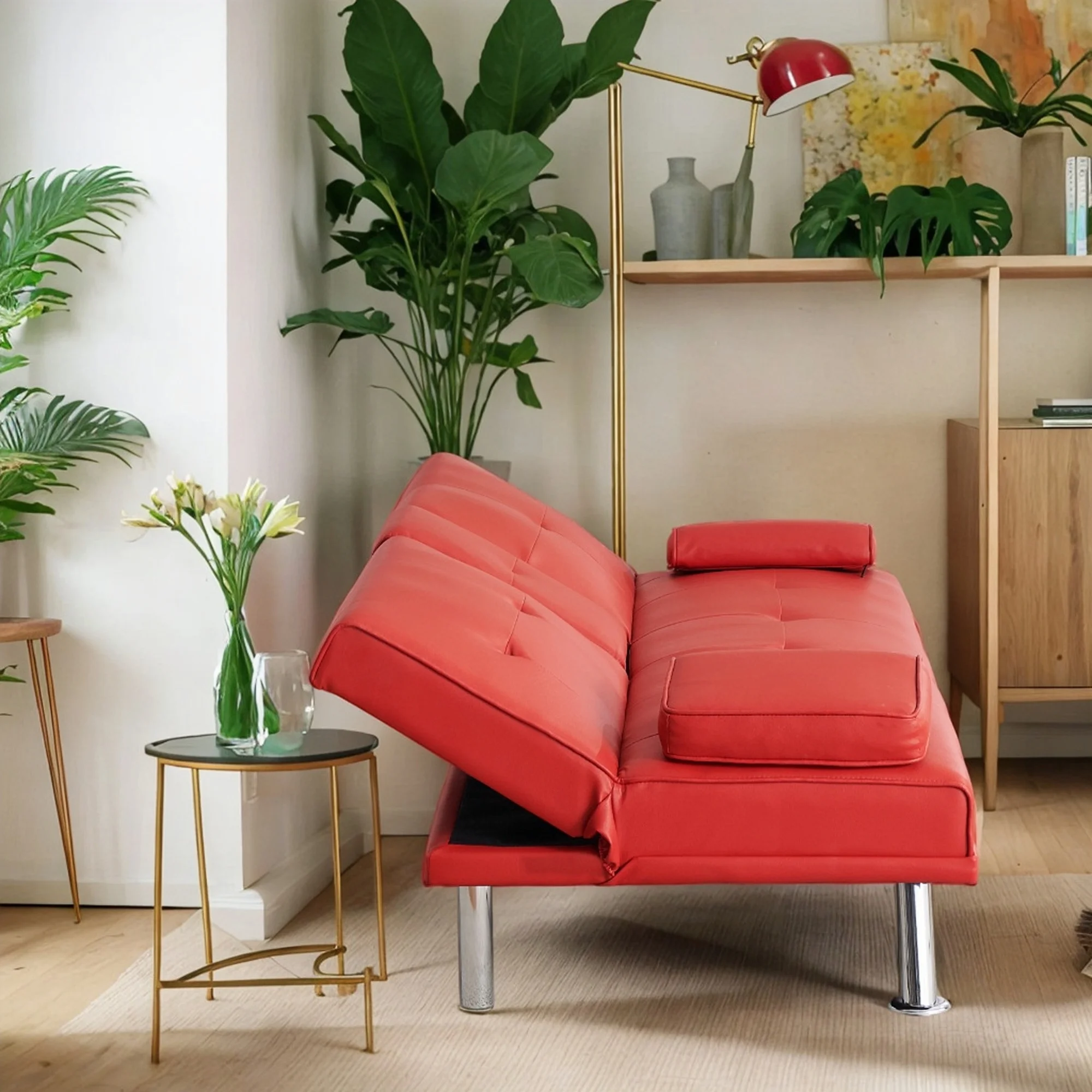 Red Leather Multifunctional Double Folding Sofa Bed for Office with Coffee Table