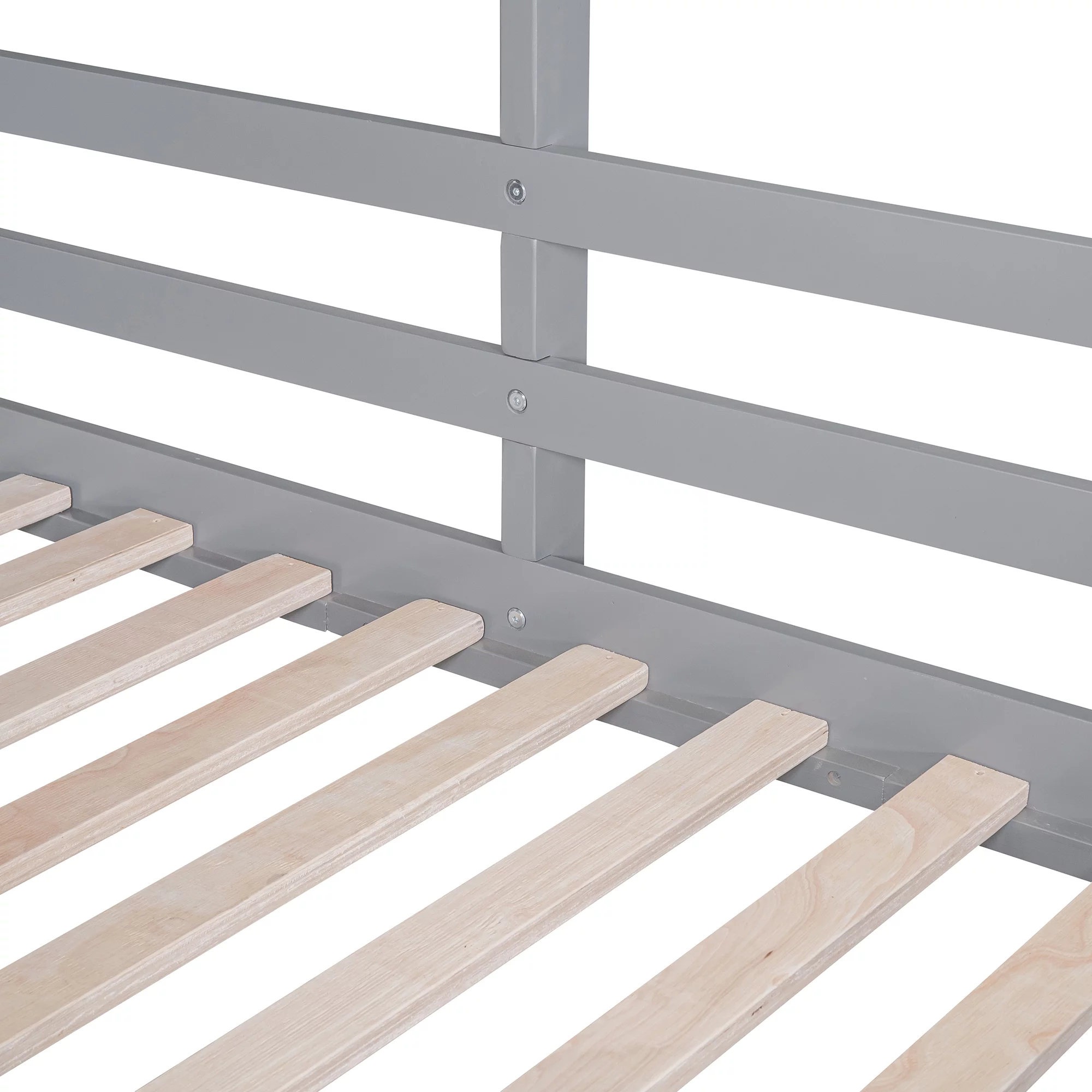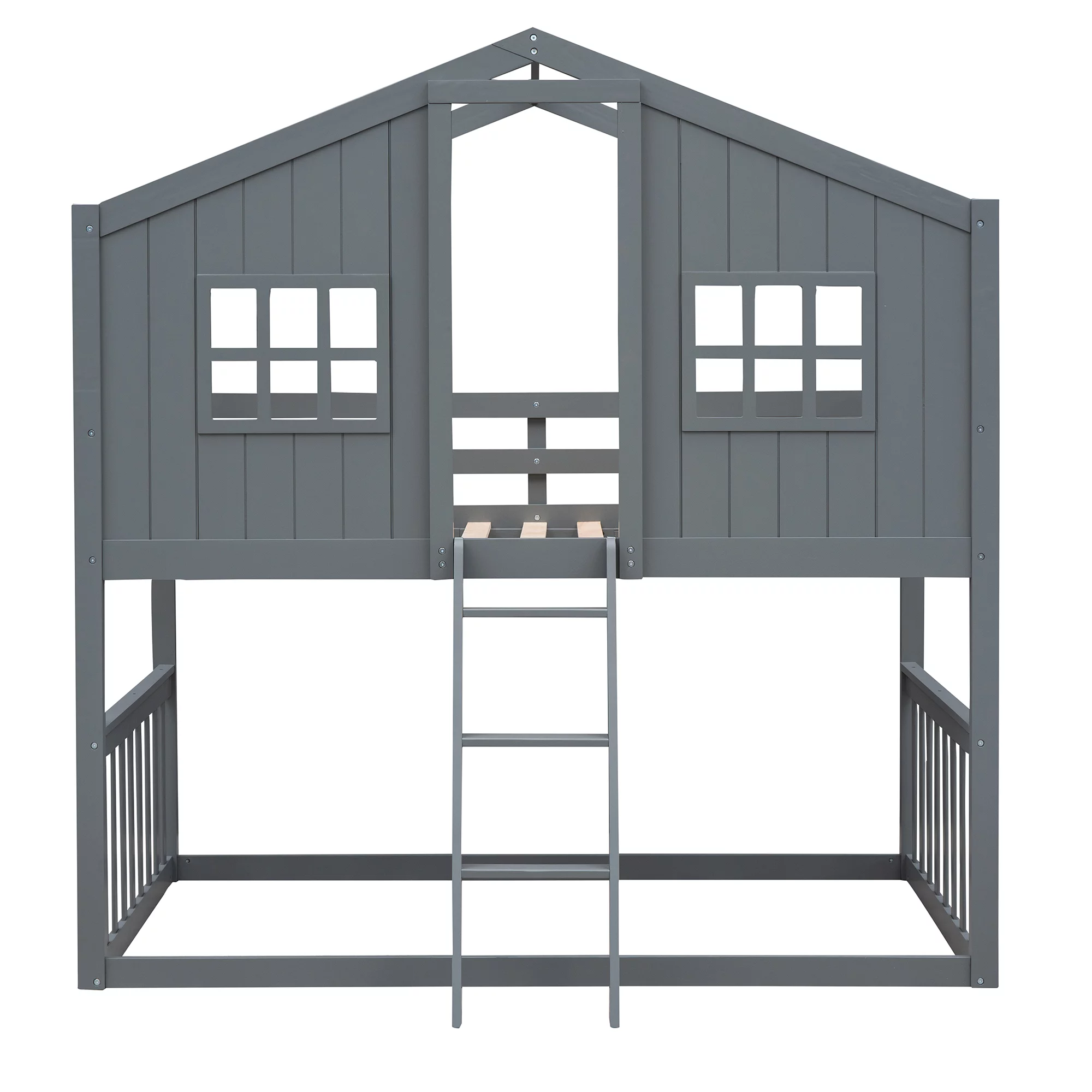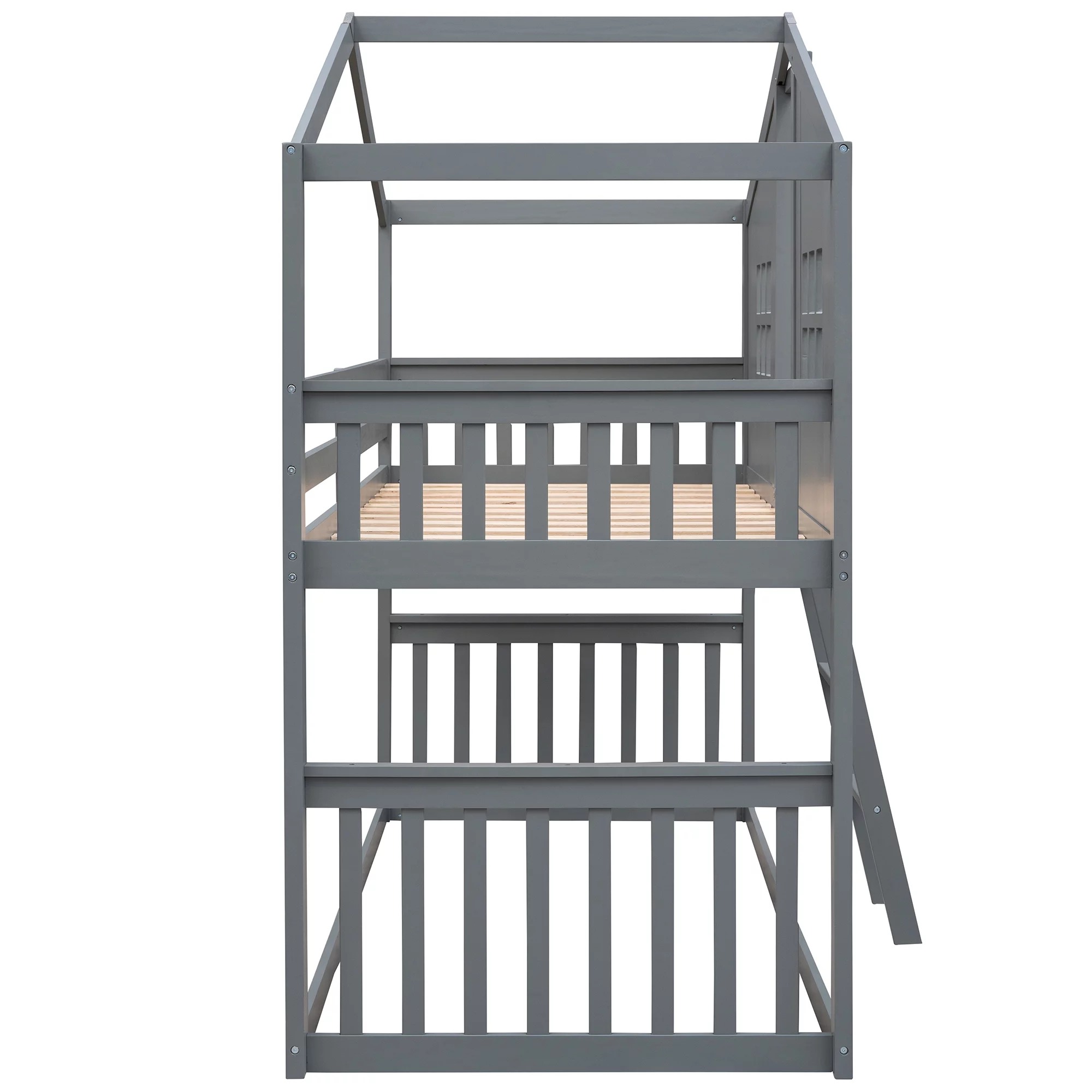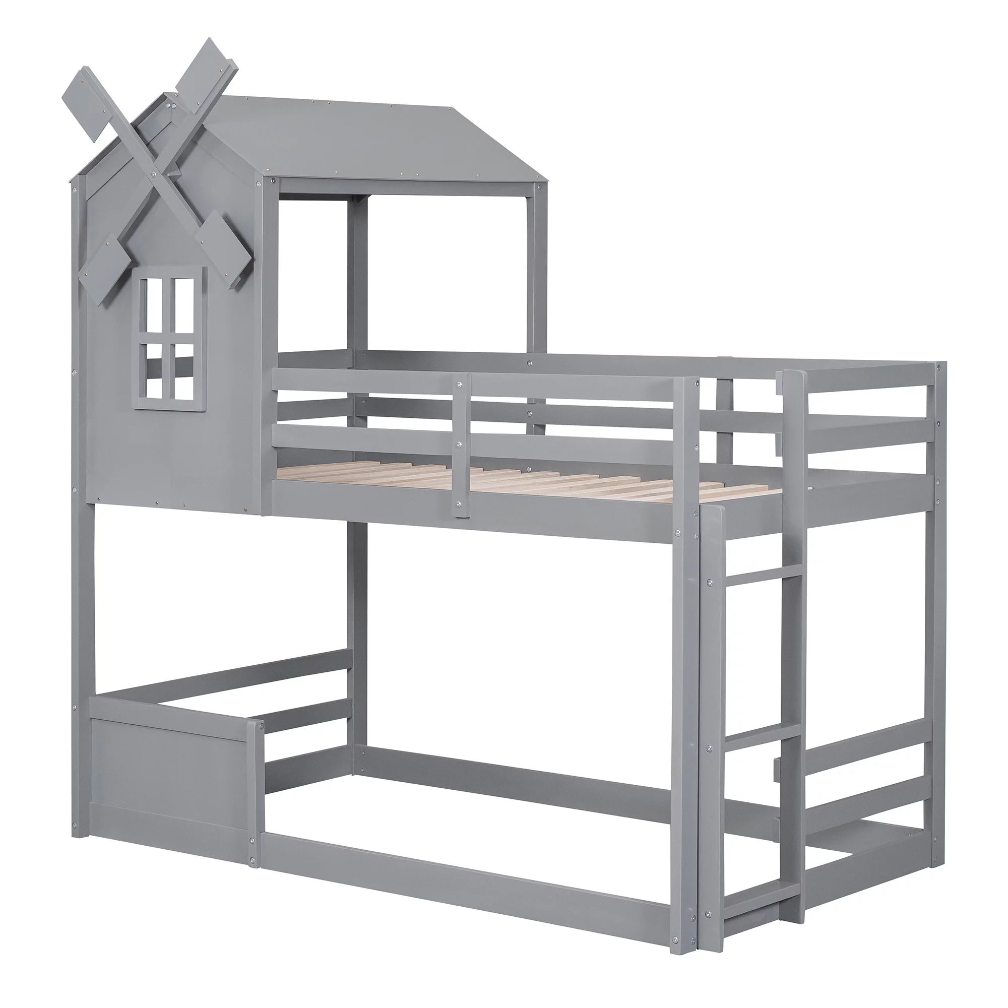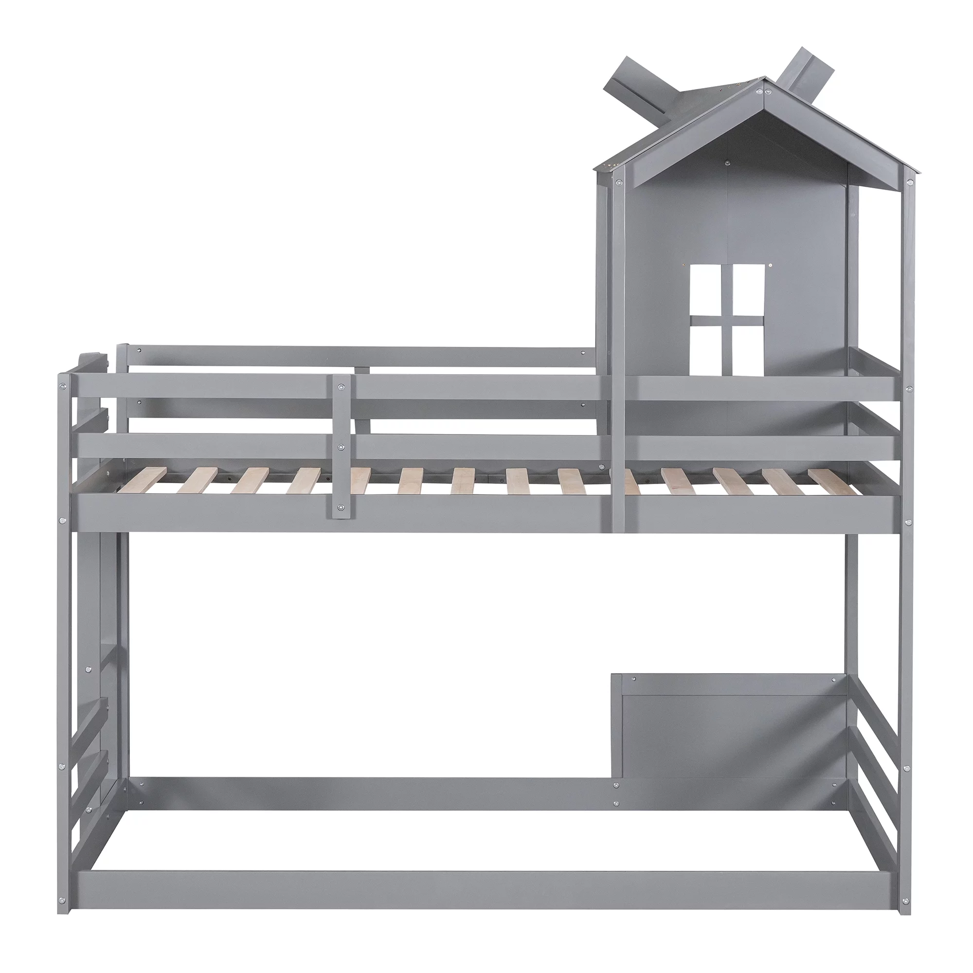 Churanty Twin Over Twin House Bunk Bed for Kids, Wooden Low Floor Bunk Bed Frame with Roof and Window,Gray