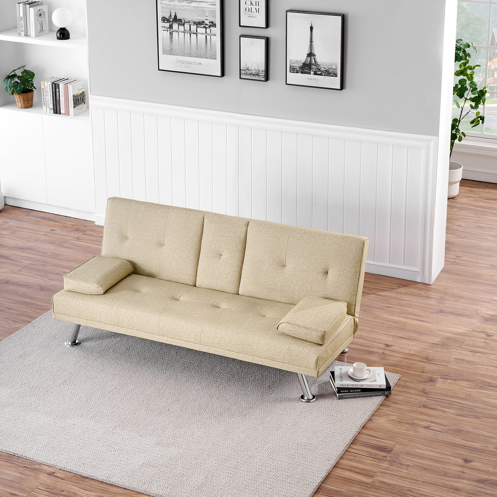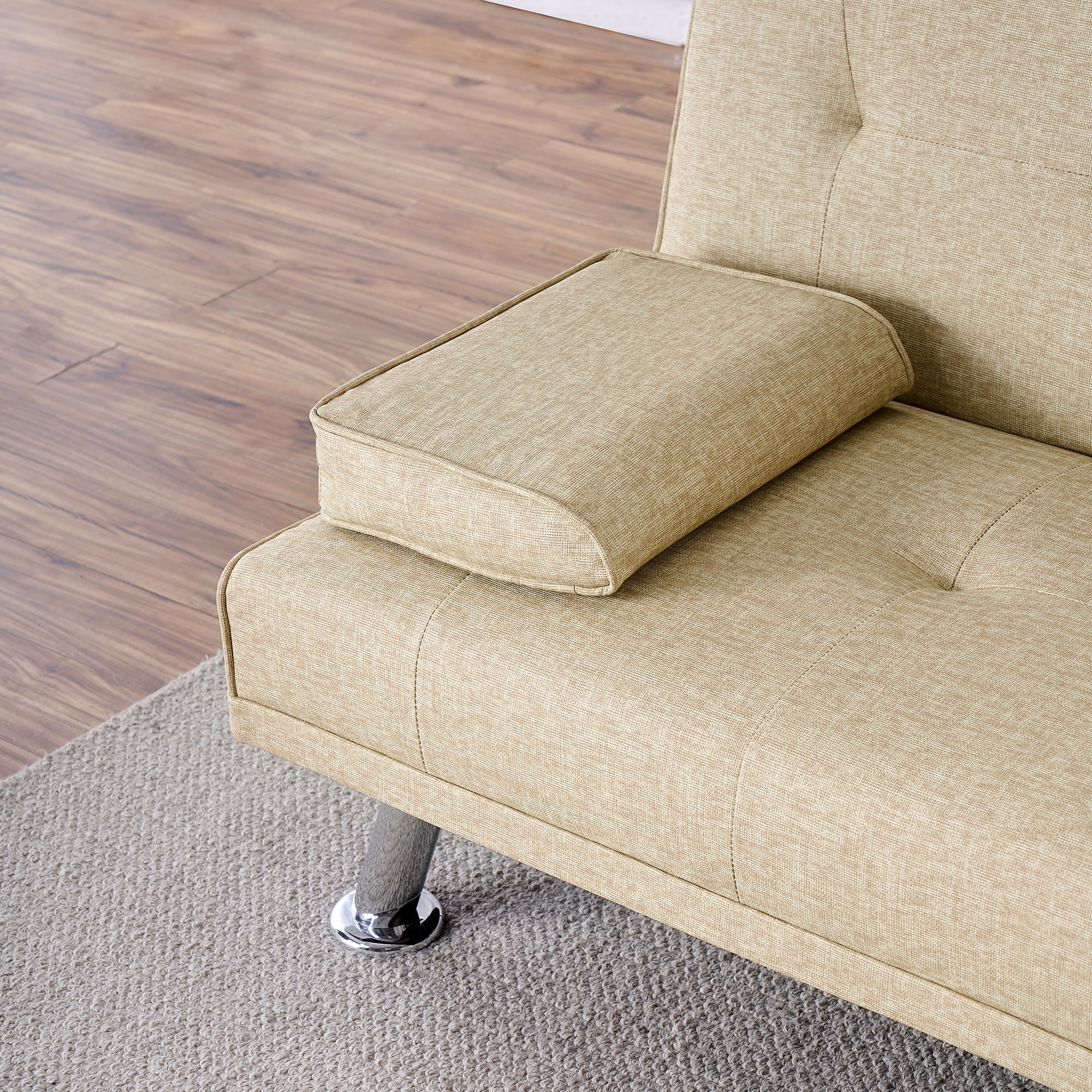Beige Folding Sofa Bed with Two Storage Pockets, Linen Convertible Foldable Couch Bed