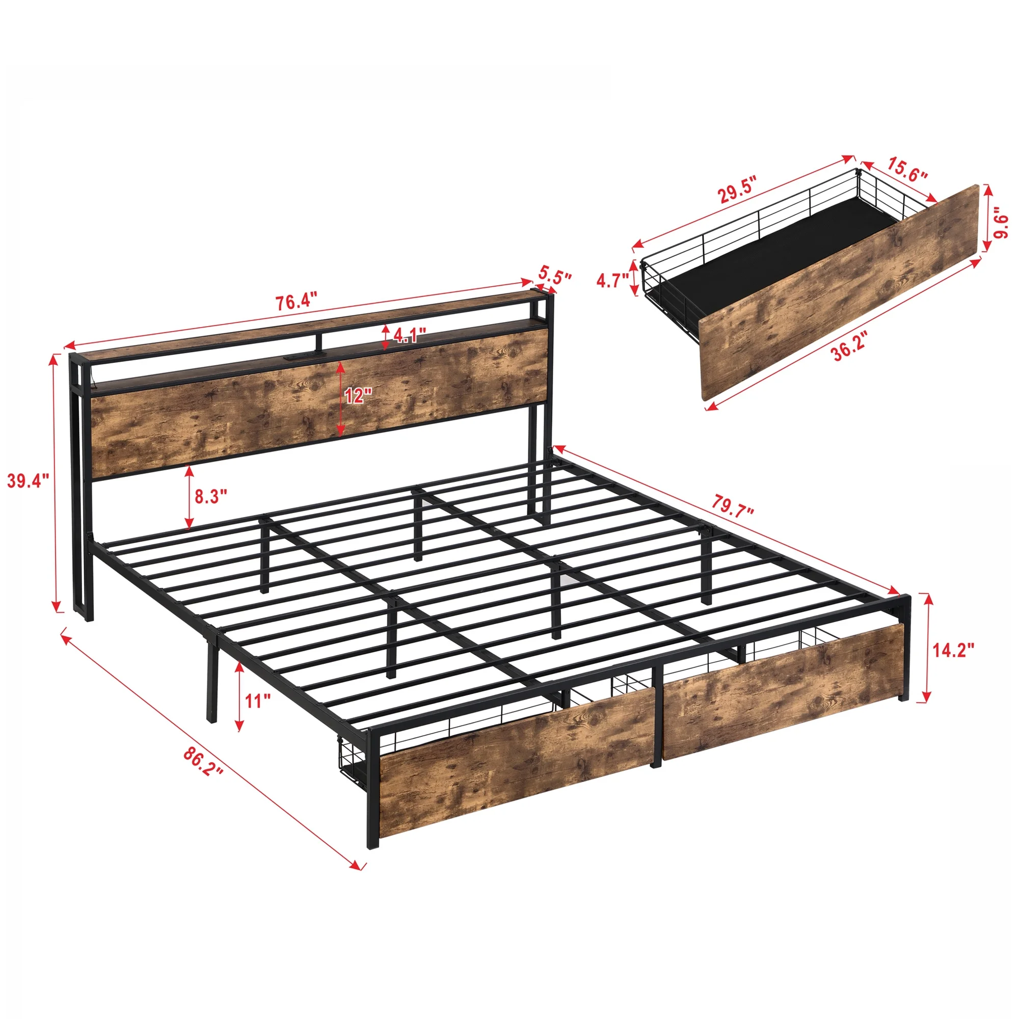 Momspeace King Bed Frame with 2 Drawers Storage Headboard with LED Lights and Charging Station, Brown