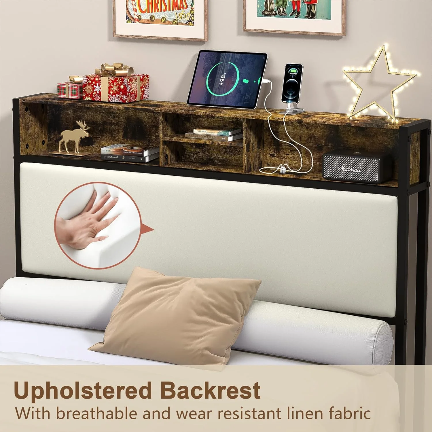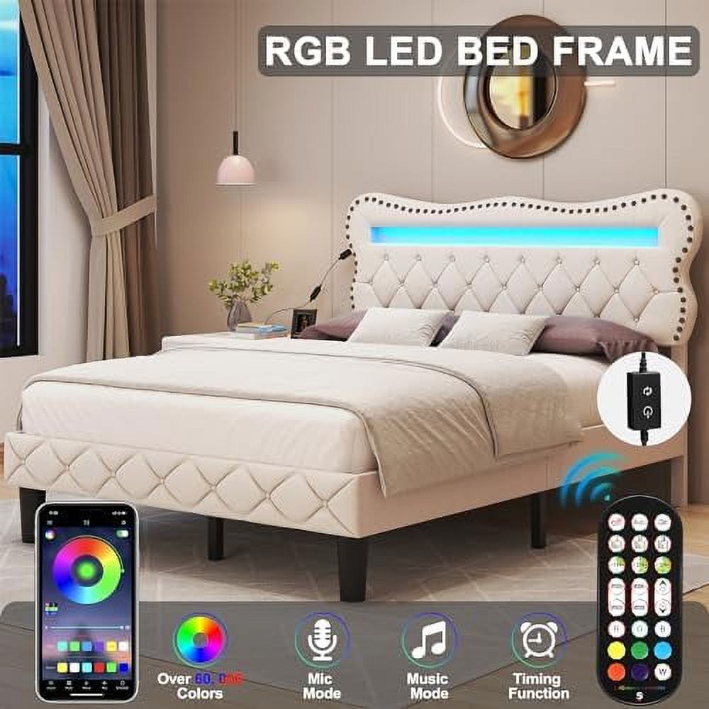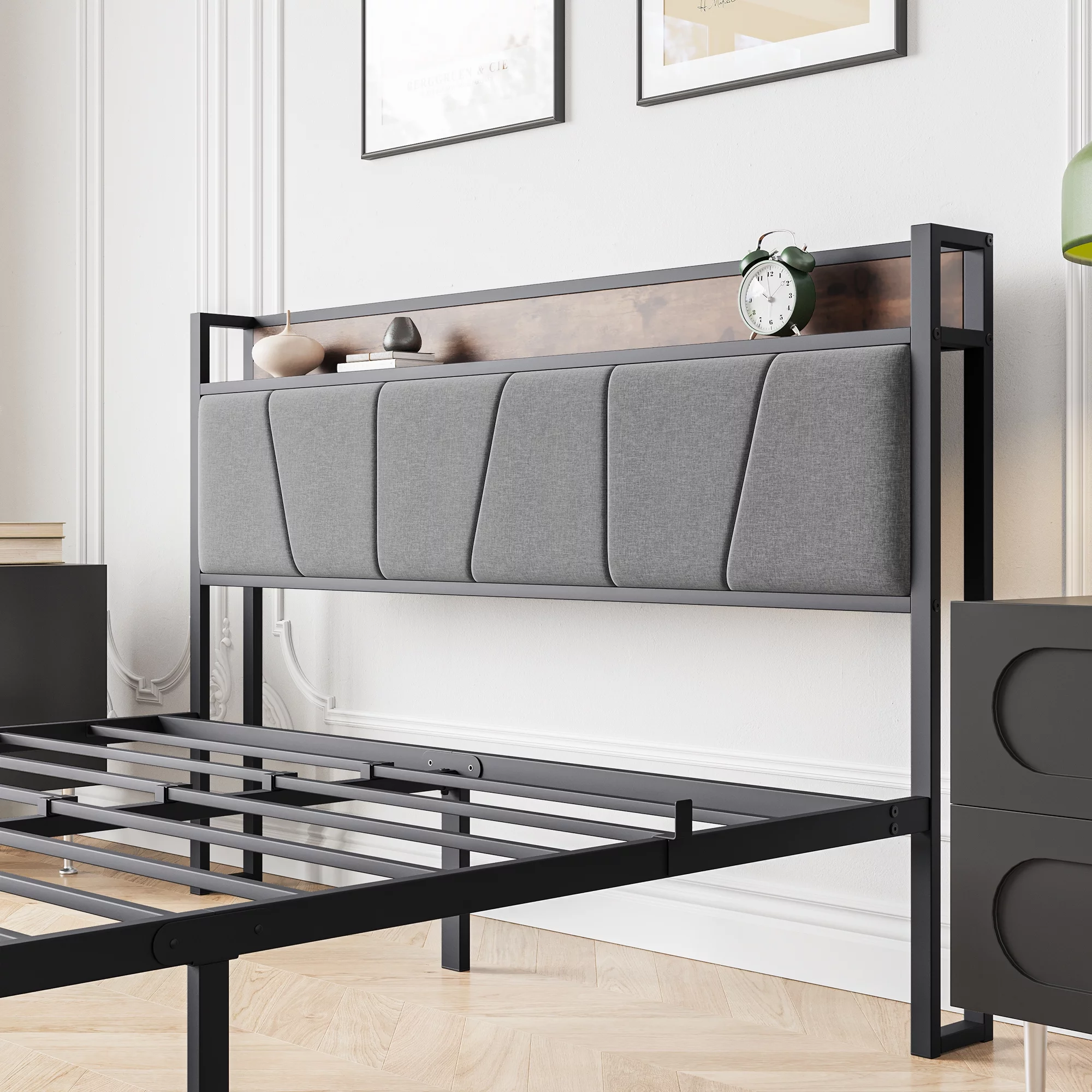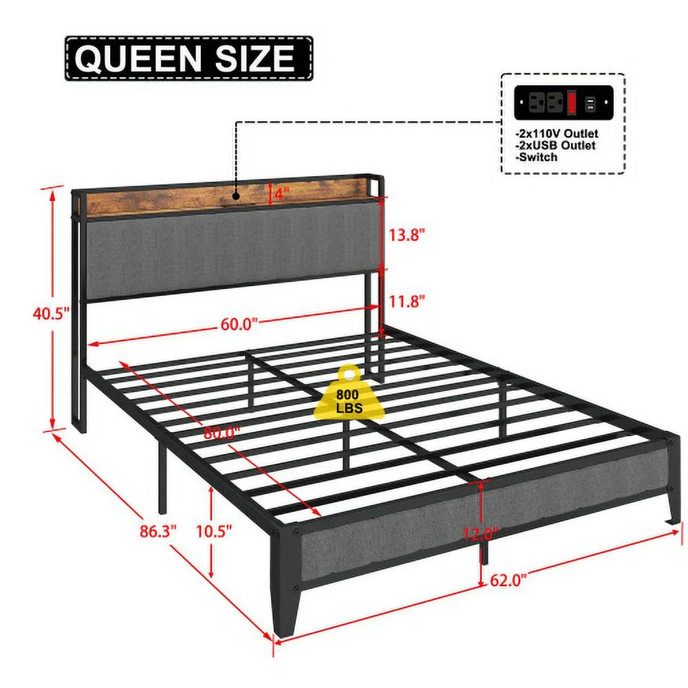 Queen Size Bed Frame with Charging Station, Upholstered Headboard, Metal Platform, Grey