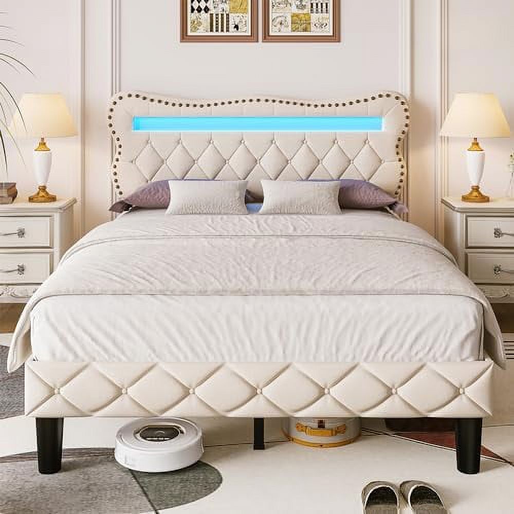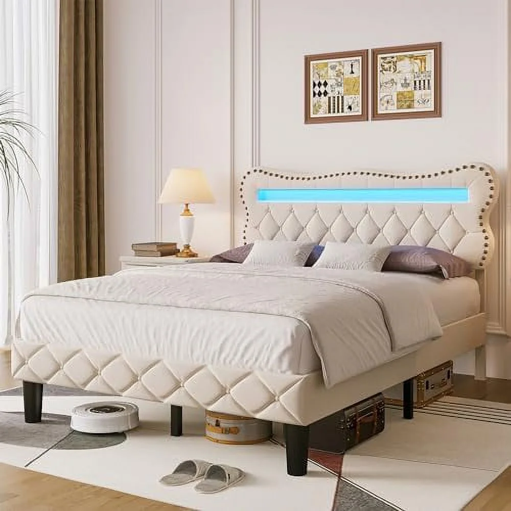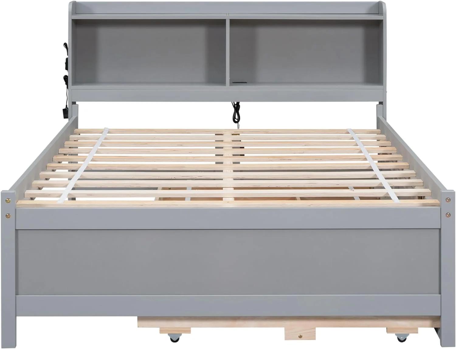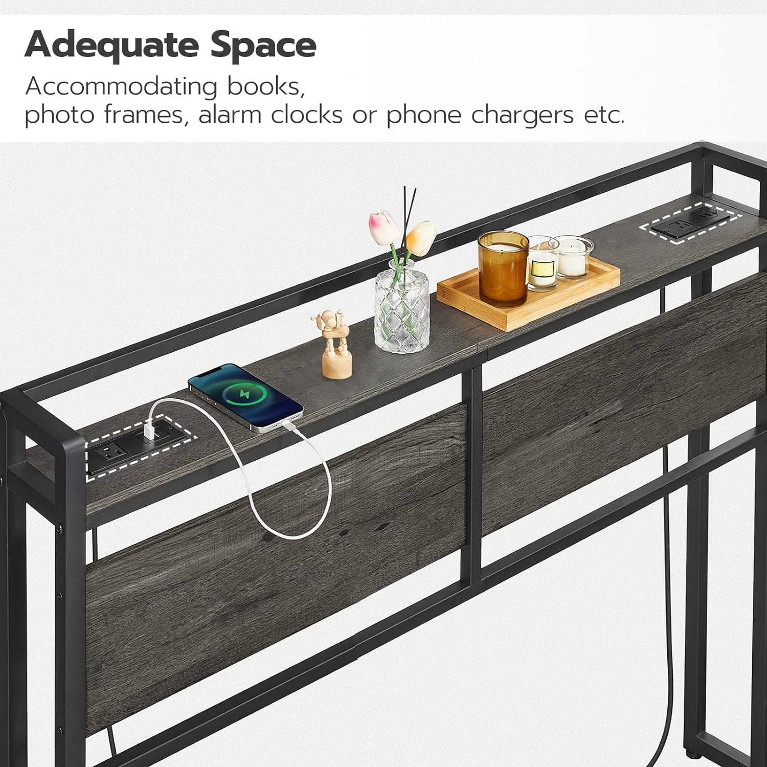Queen Size Bed Frame with Charging Station, Upholstered Headboard, Metal Platform, Grey
