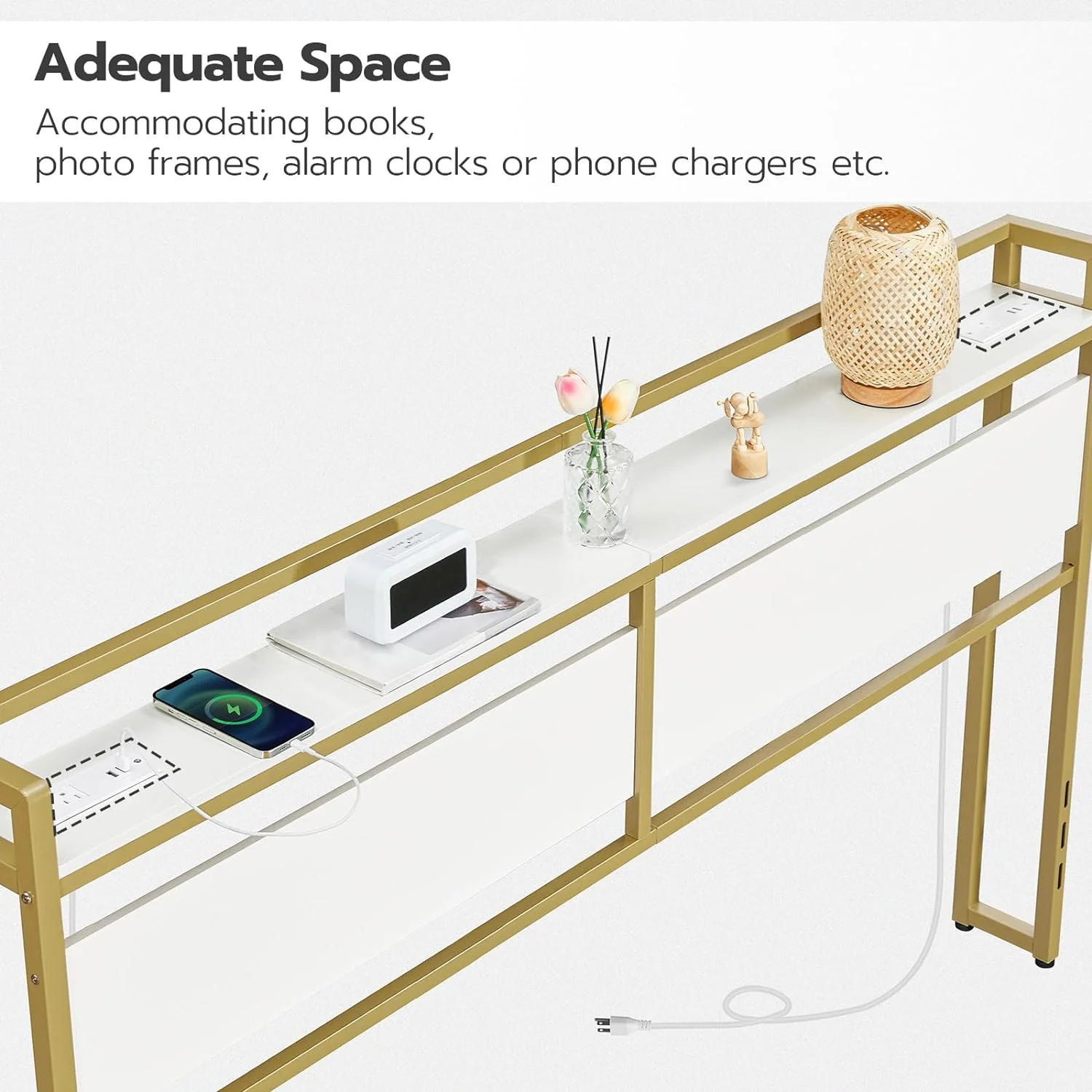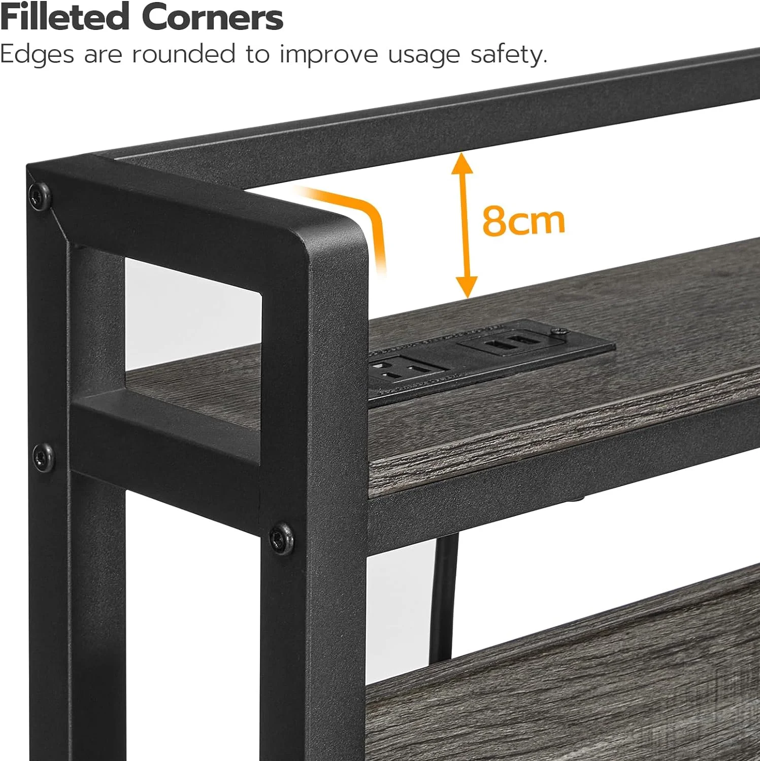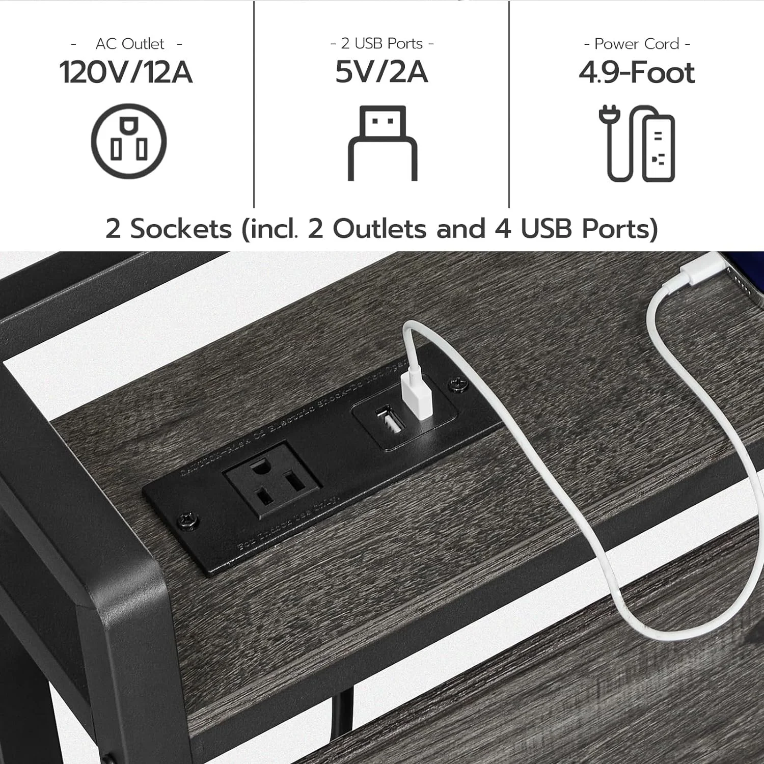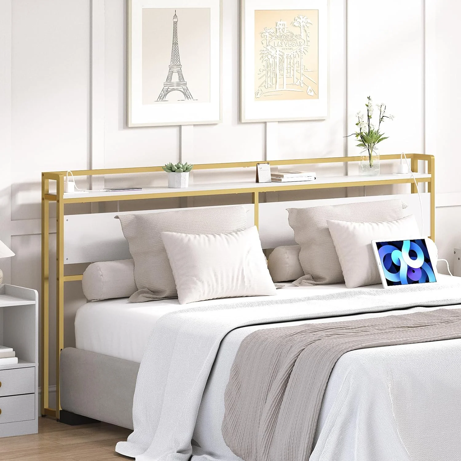 Queen Size Bed Frame with Charging Station, Upholstered Headboard, Metal Platform, Grey