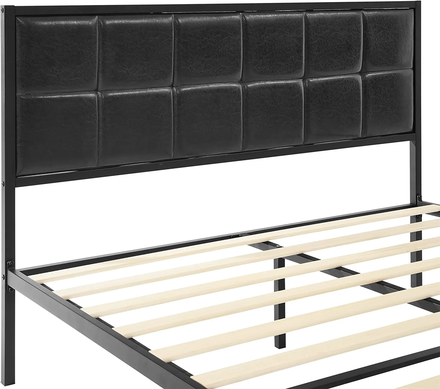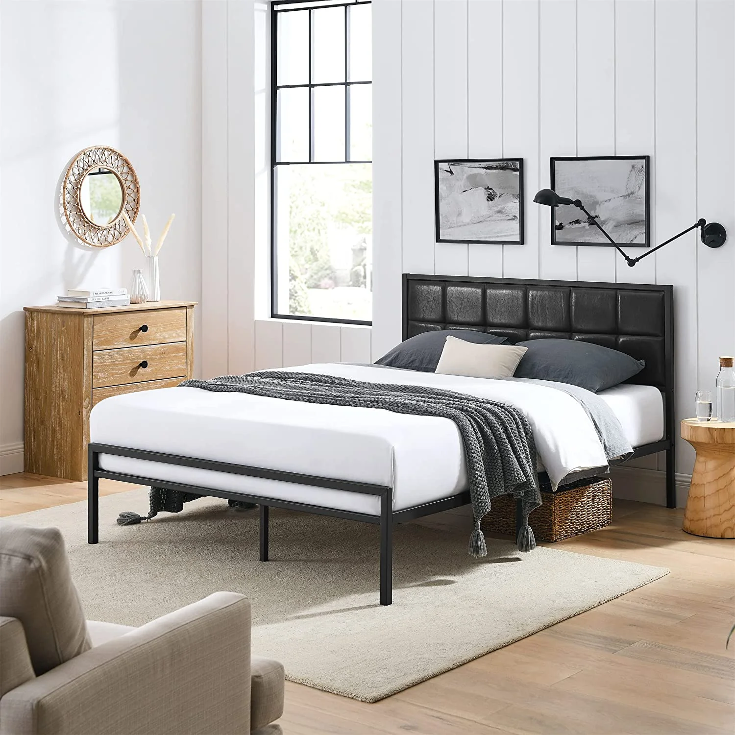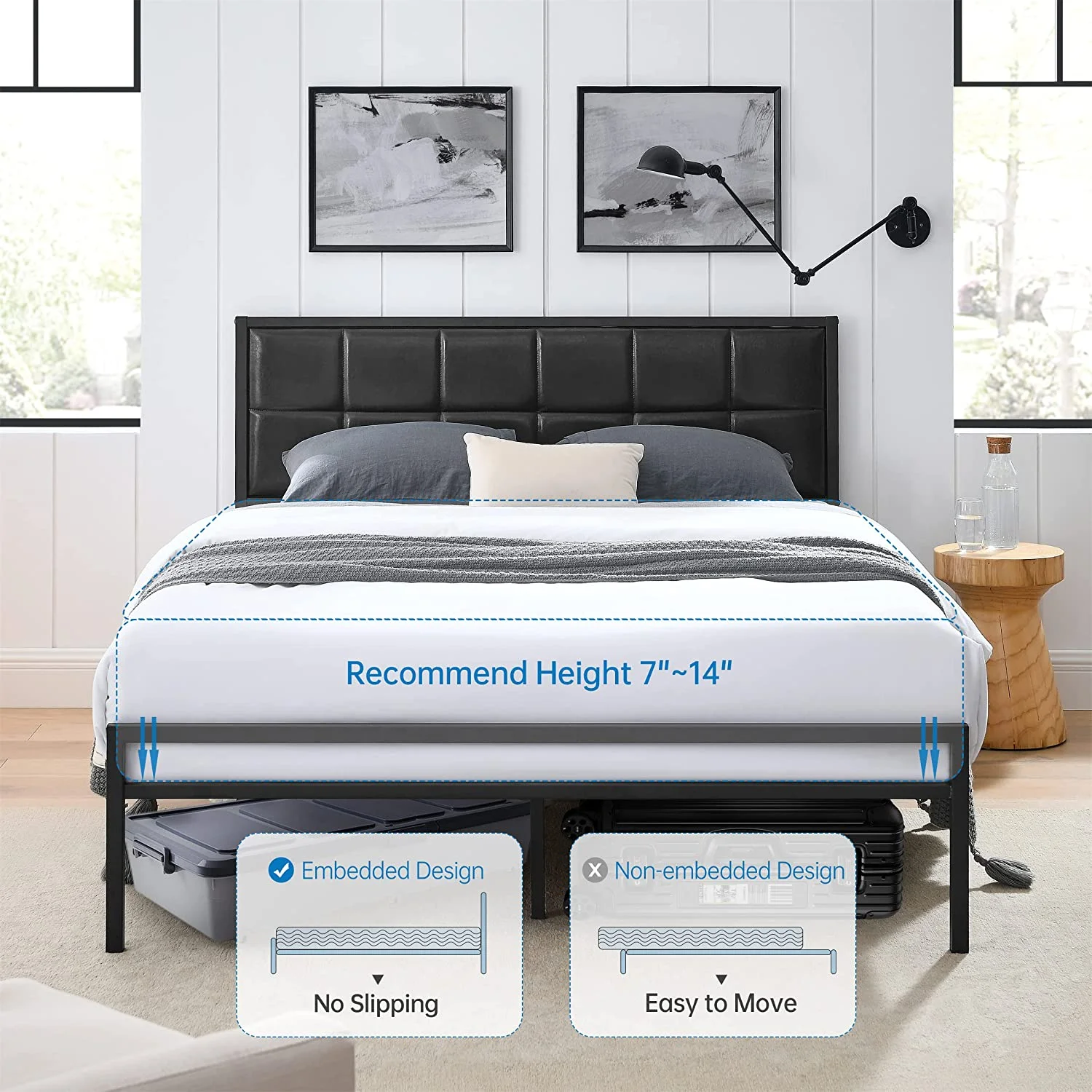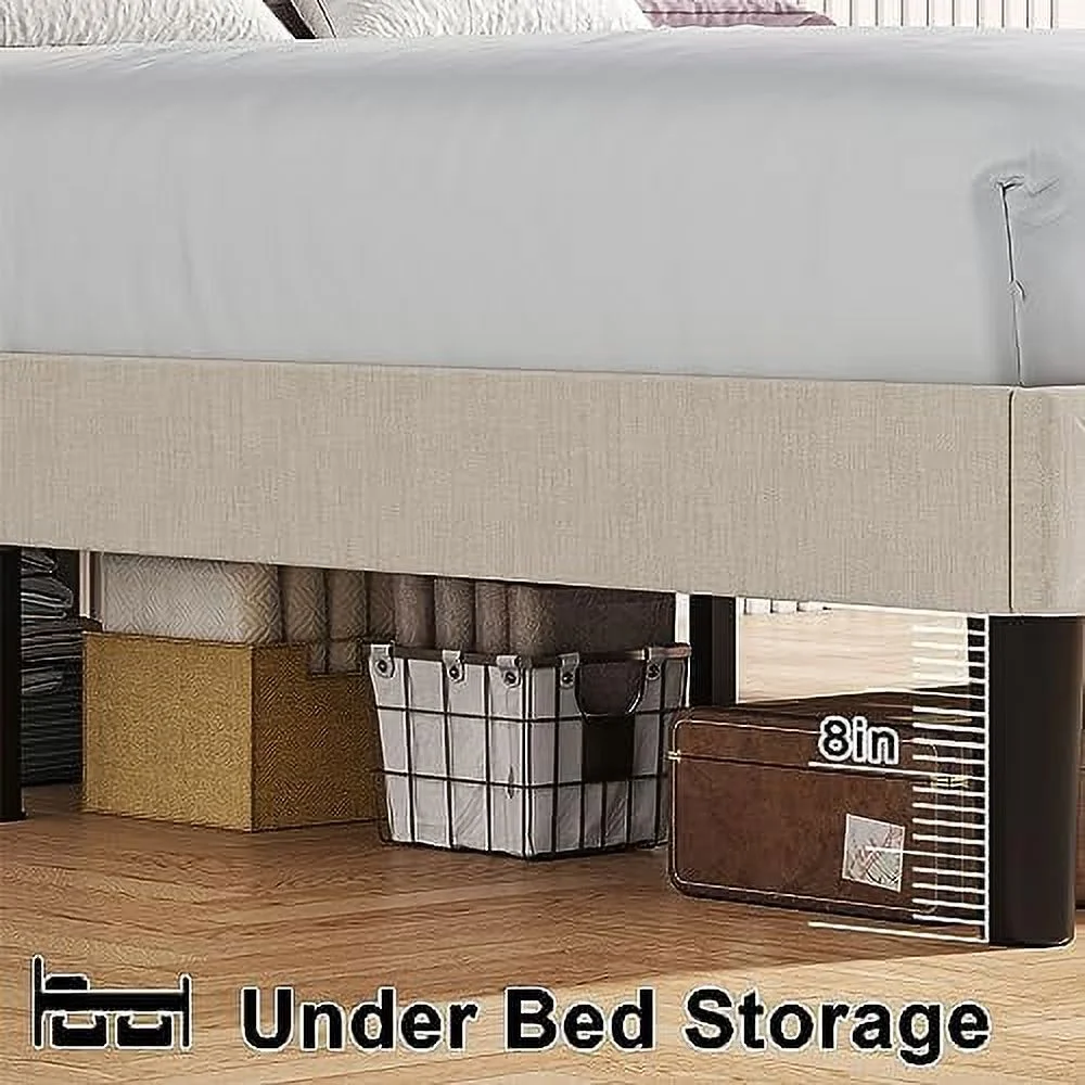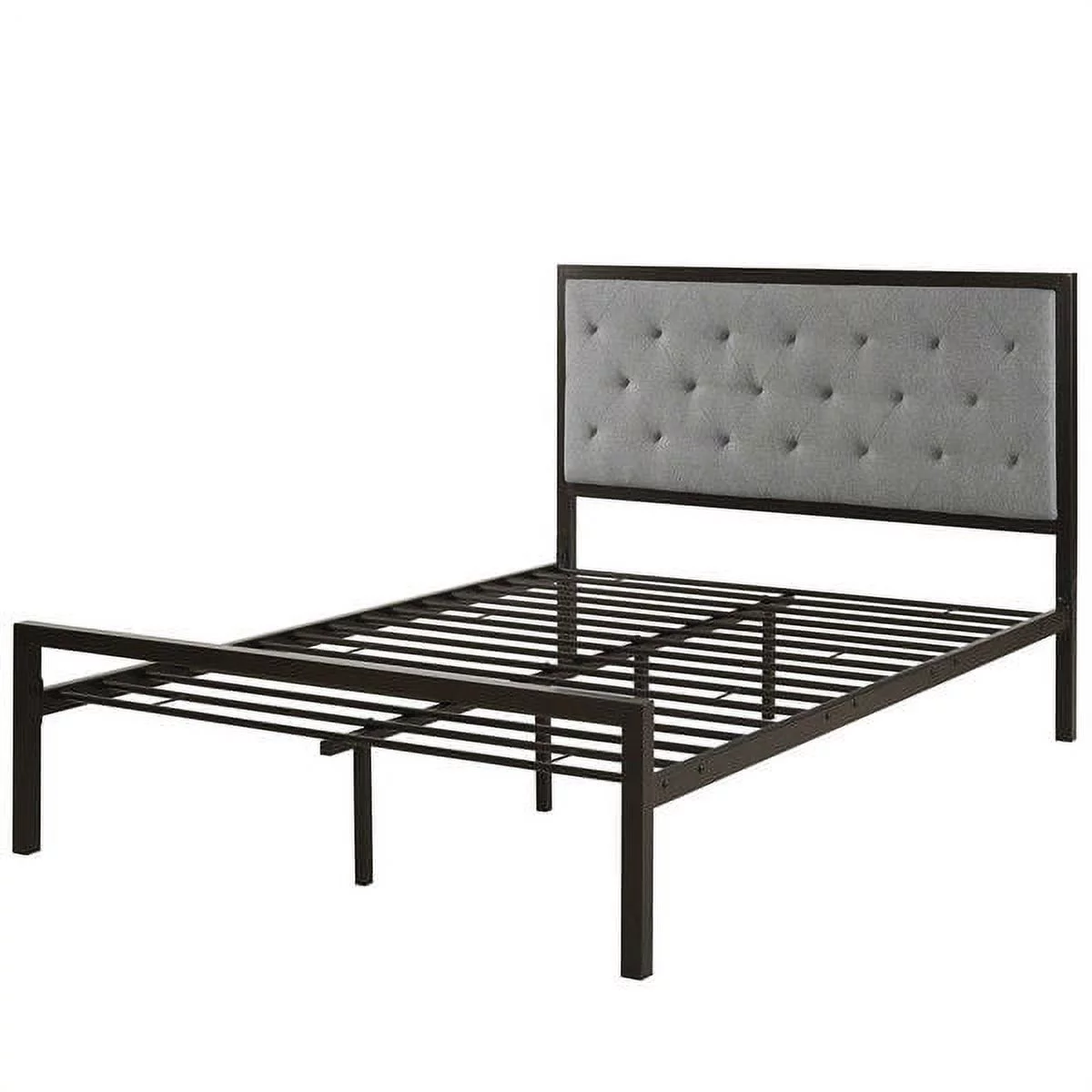 Queen size Contemporary Metal Platform Bed with Grey Upholstered Headboard