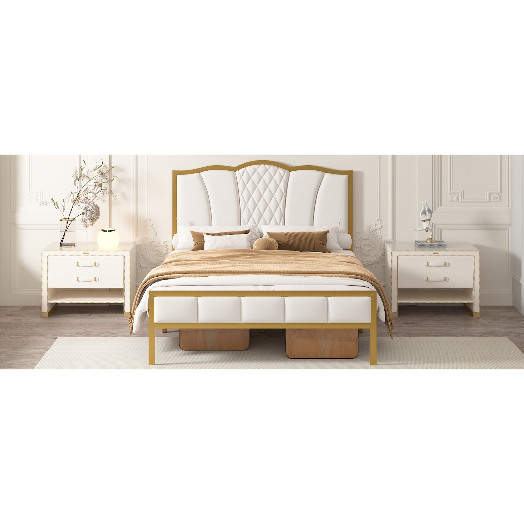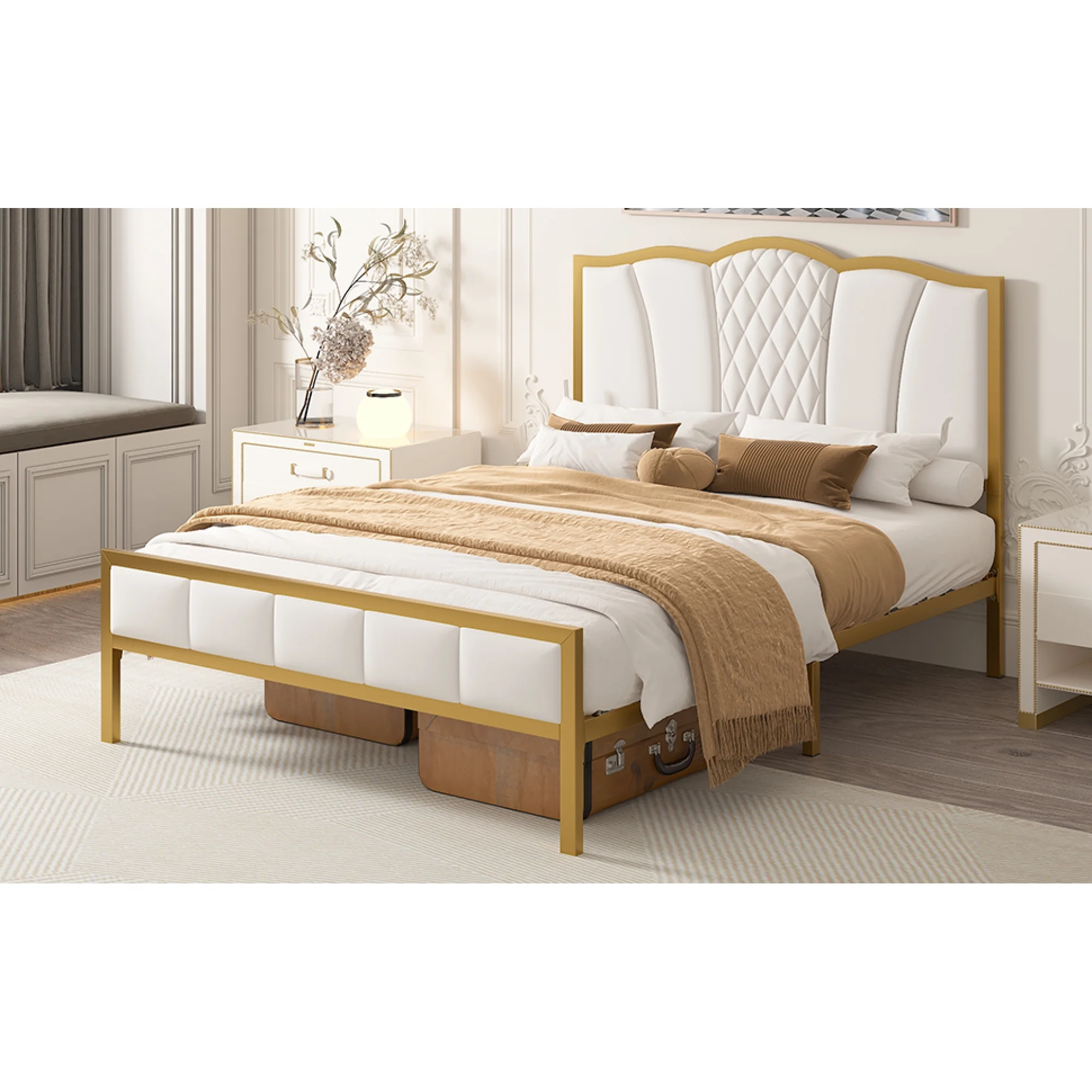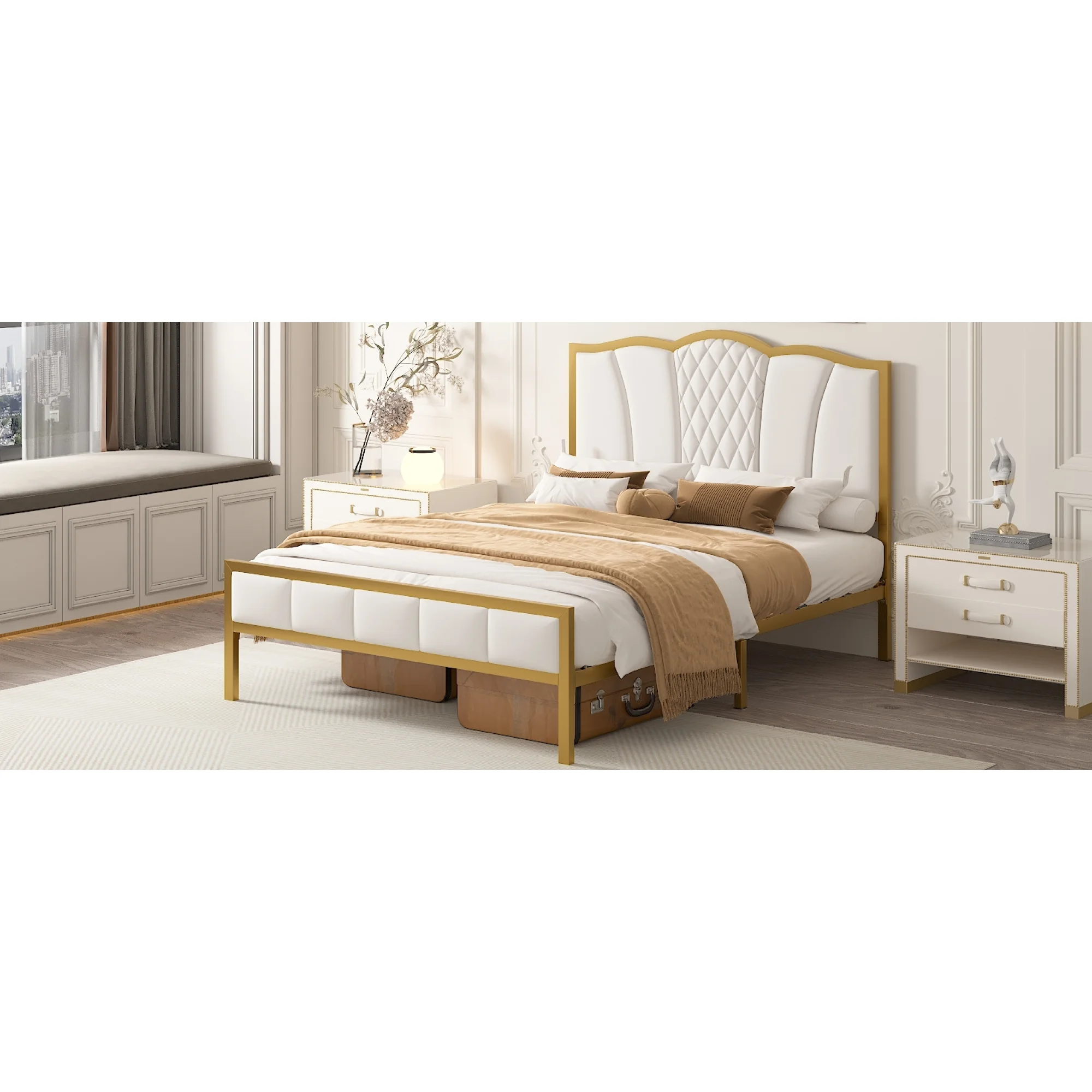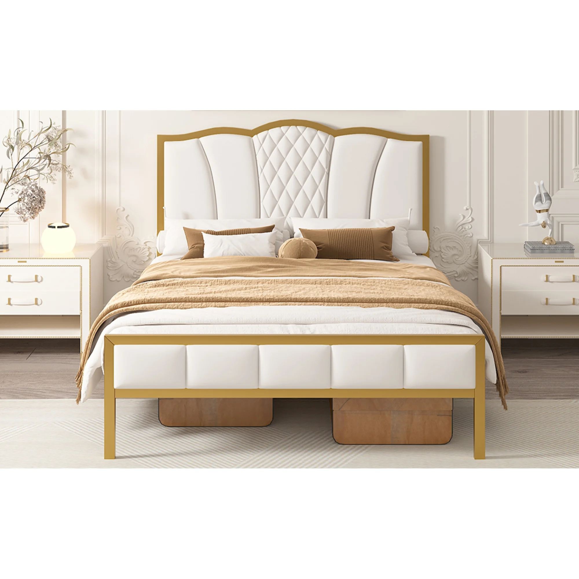 Modern Upholstered Full Size Bed Frame, Tufted Headboard, Golden Metal Platform, No Box Spring, Beige