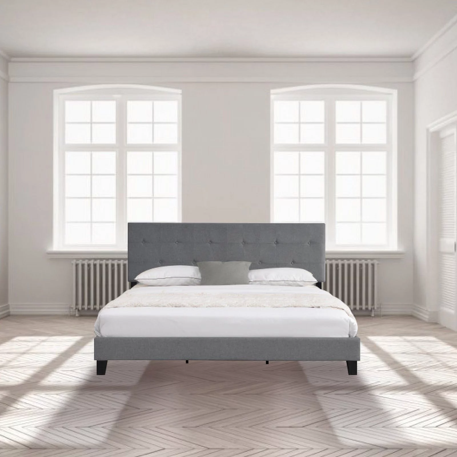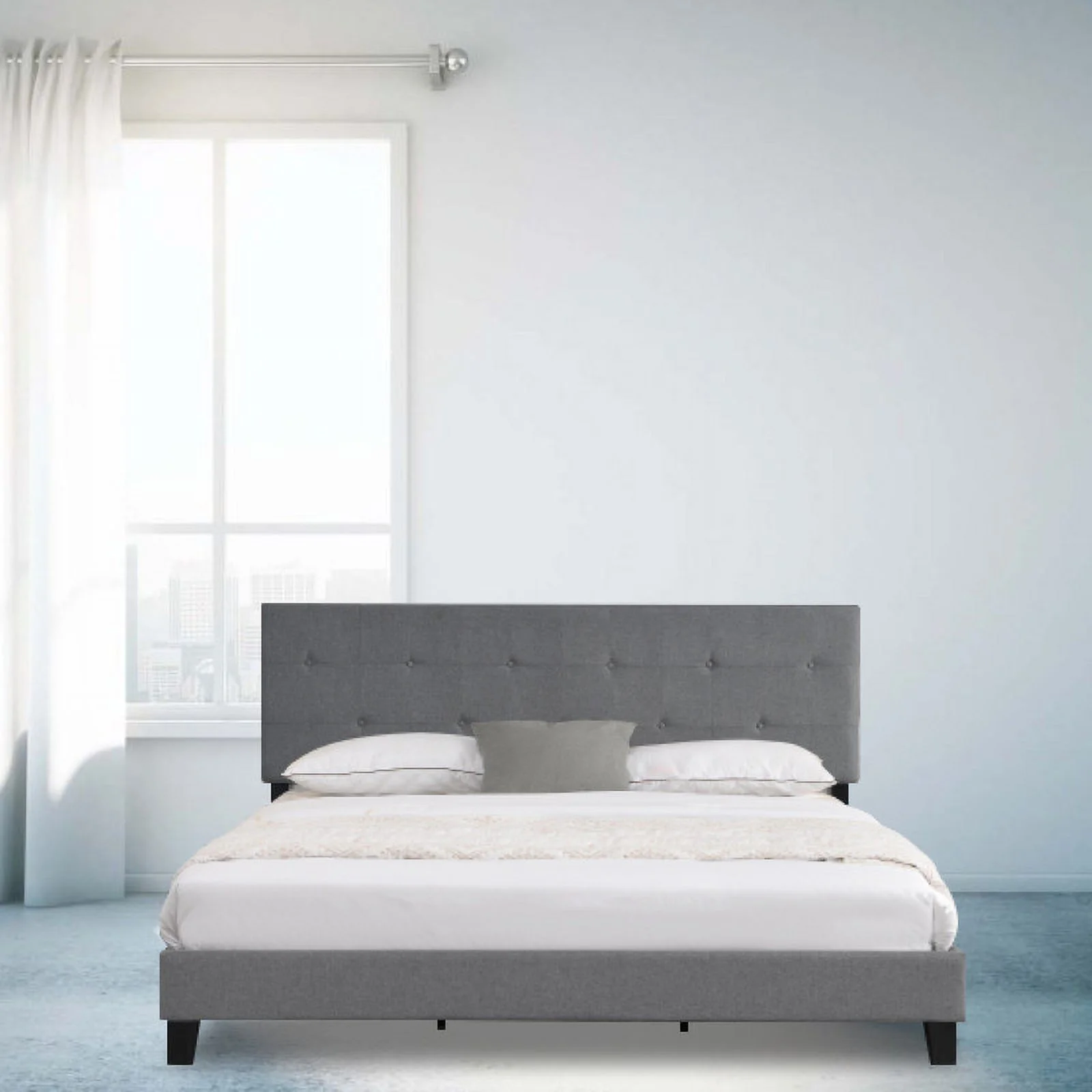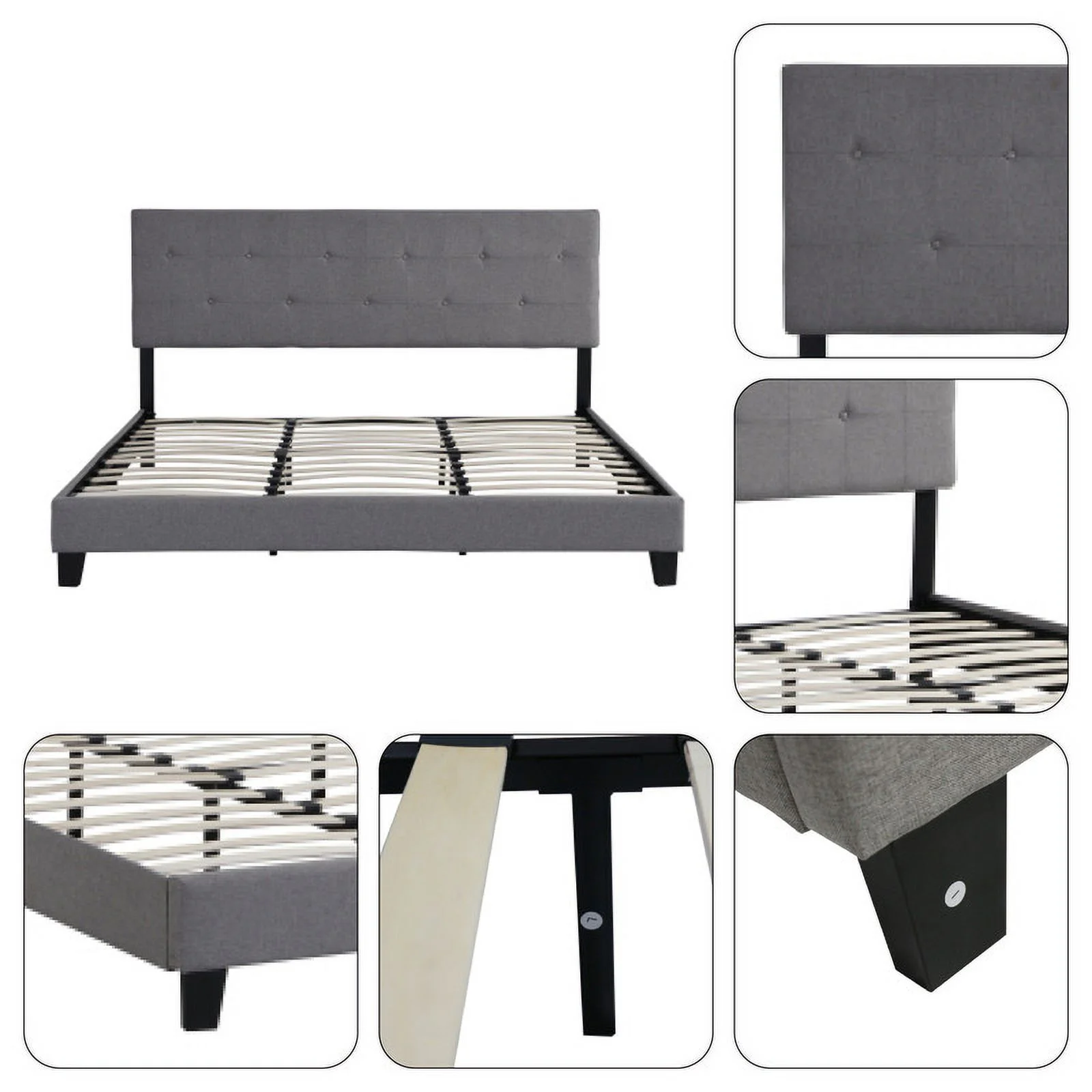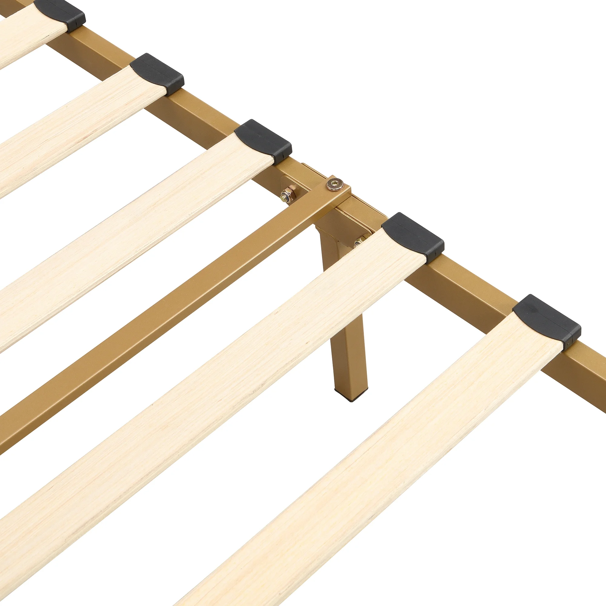 Modern Upholstered Full Size Bed Frame, Tufted Headboard, Golden Metal Platform, No Box Spring, Beige