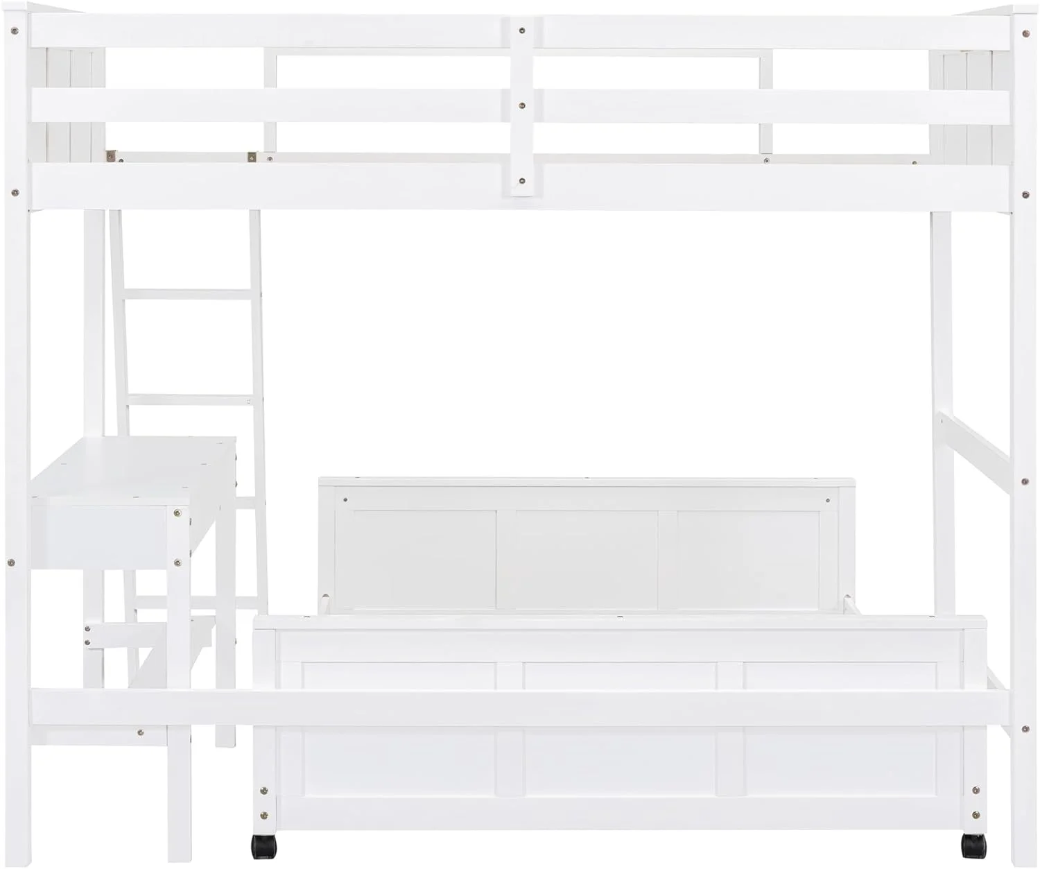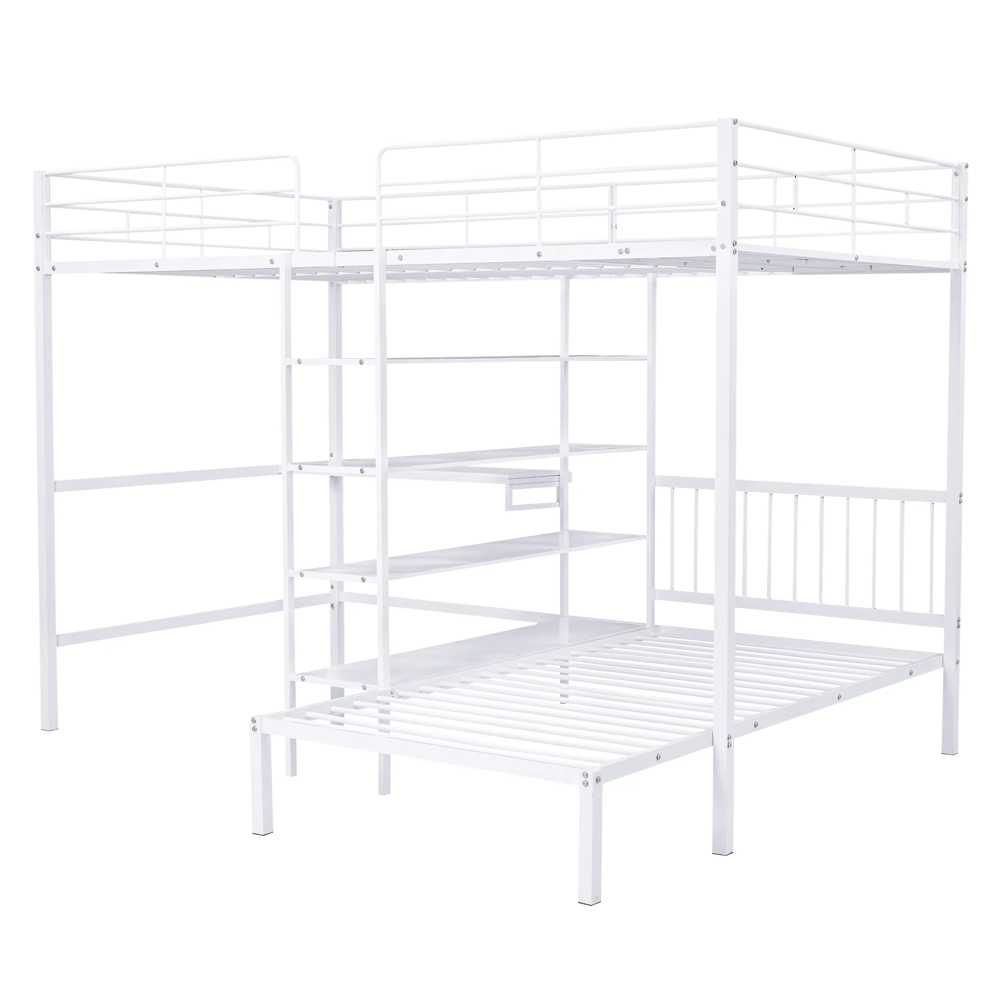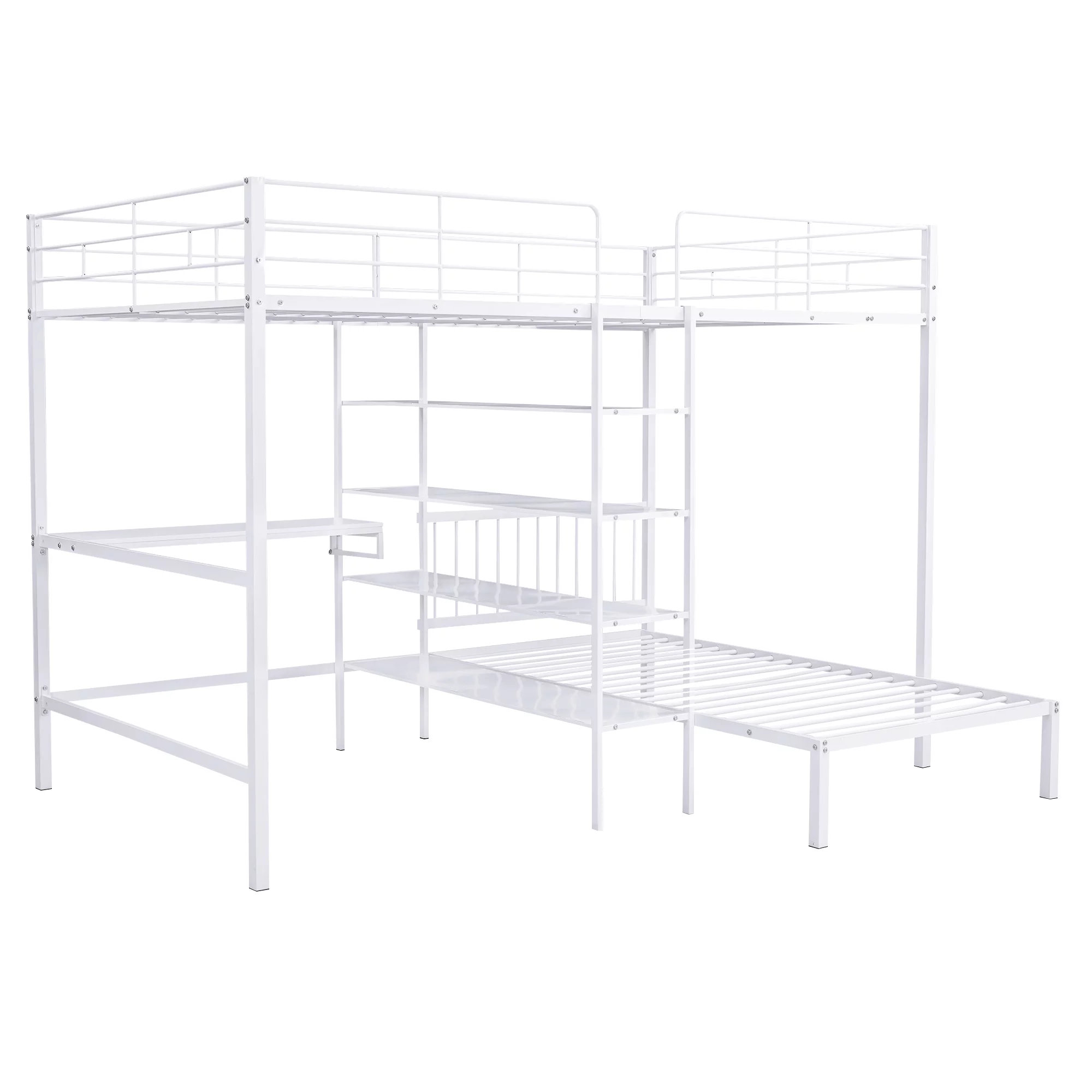 Convertible Loft Bed with L-Shape Desk, Twin Bunk Bed with Shelves and Ladder, White