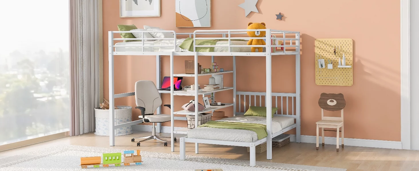 GUTALOR Twin Over Full Bunk Bed with Desk - Space-Saving White Metal Bunk Bed for Kids/Teens