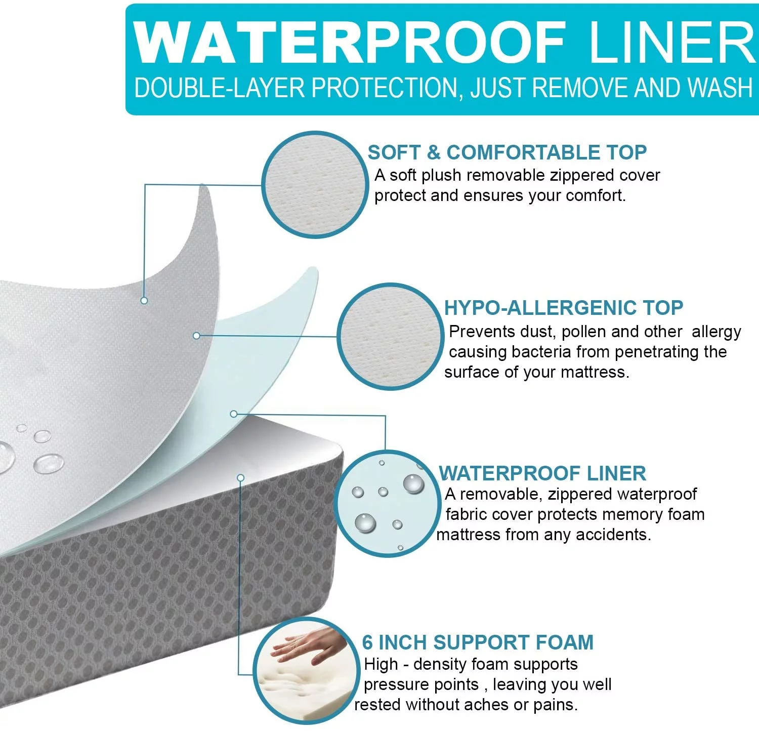 Tri Folding 6" Feet Foam Mattress With Waterproof Protector And Washable Cover