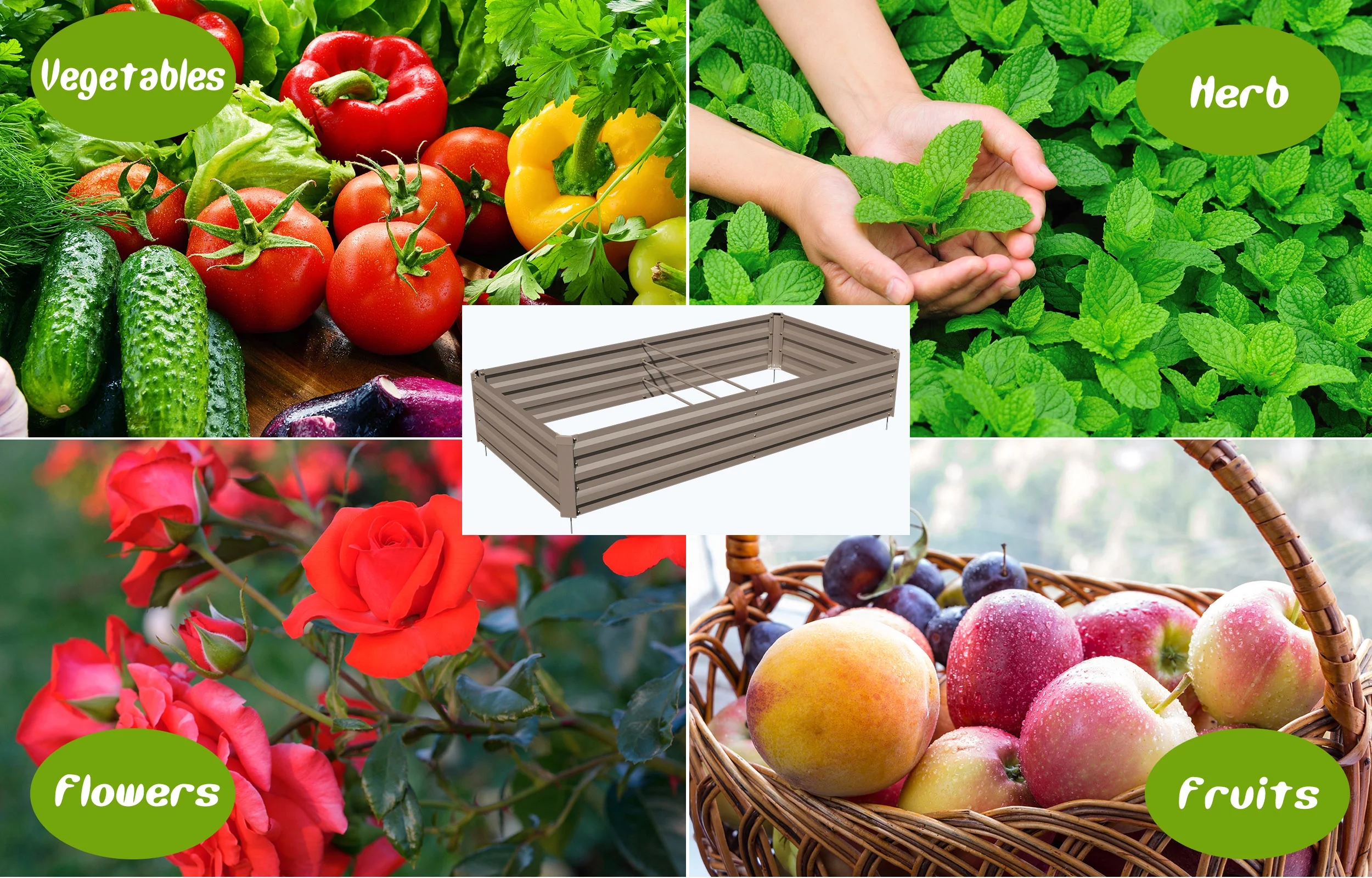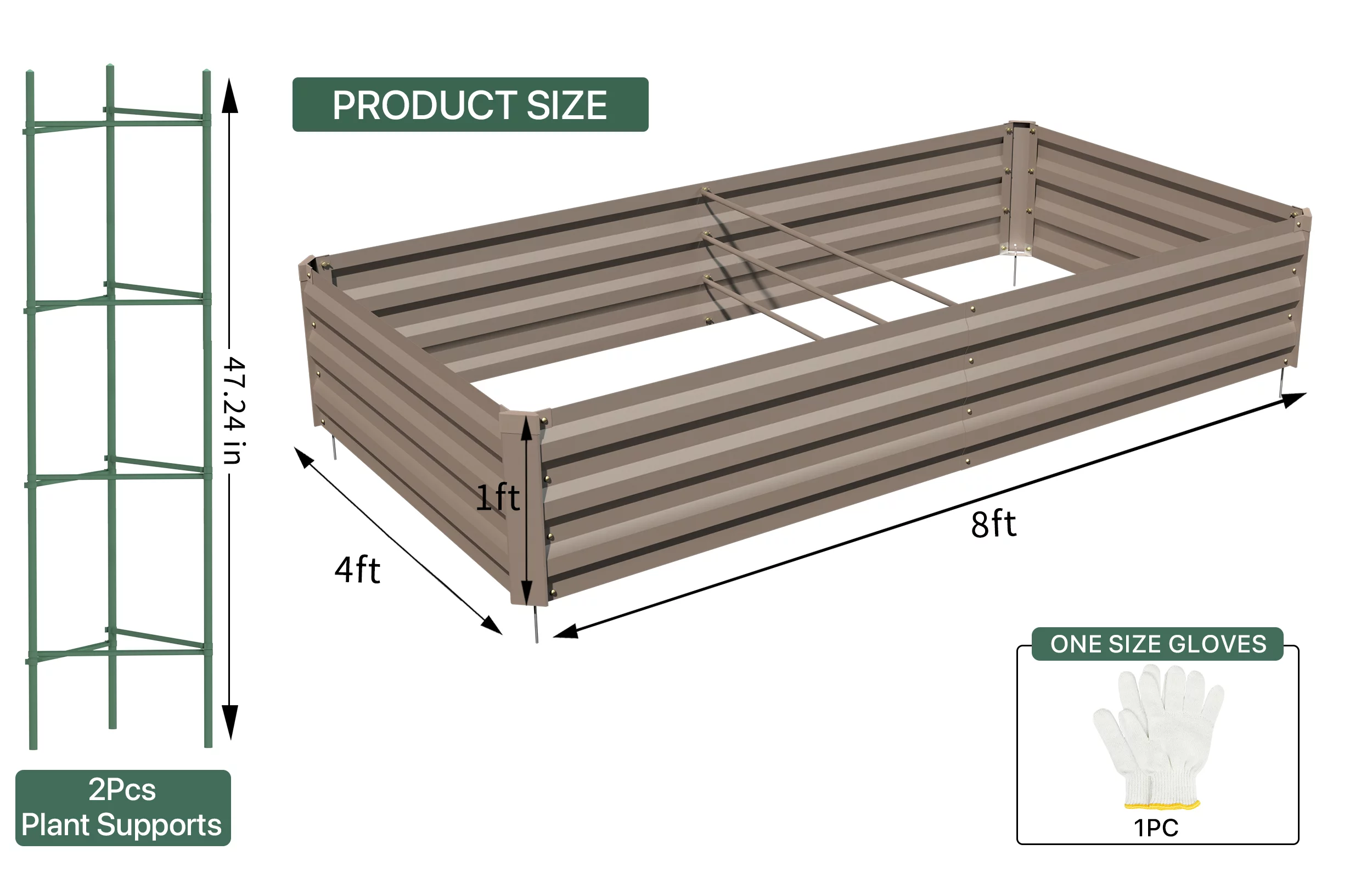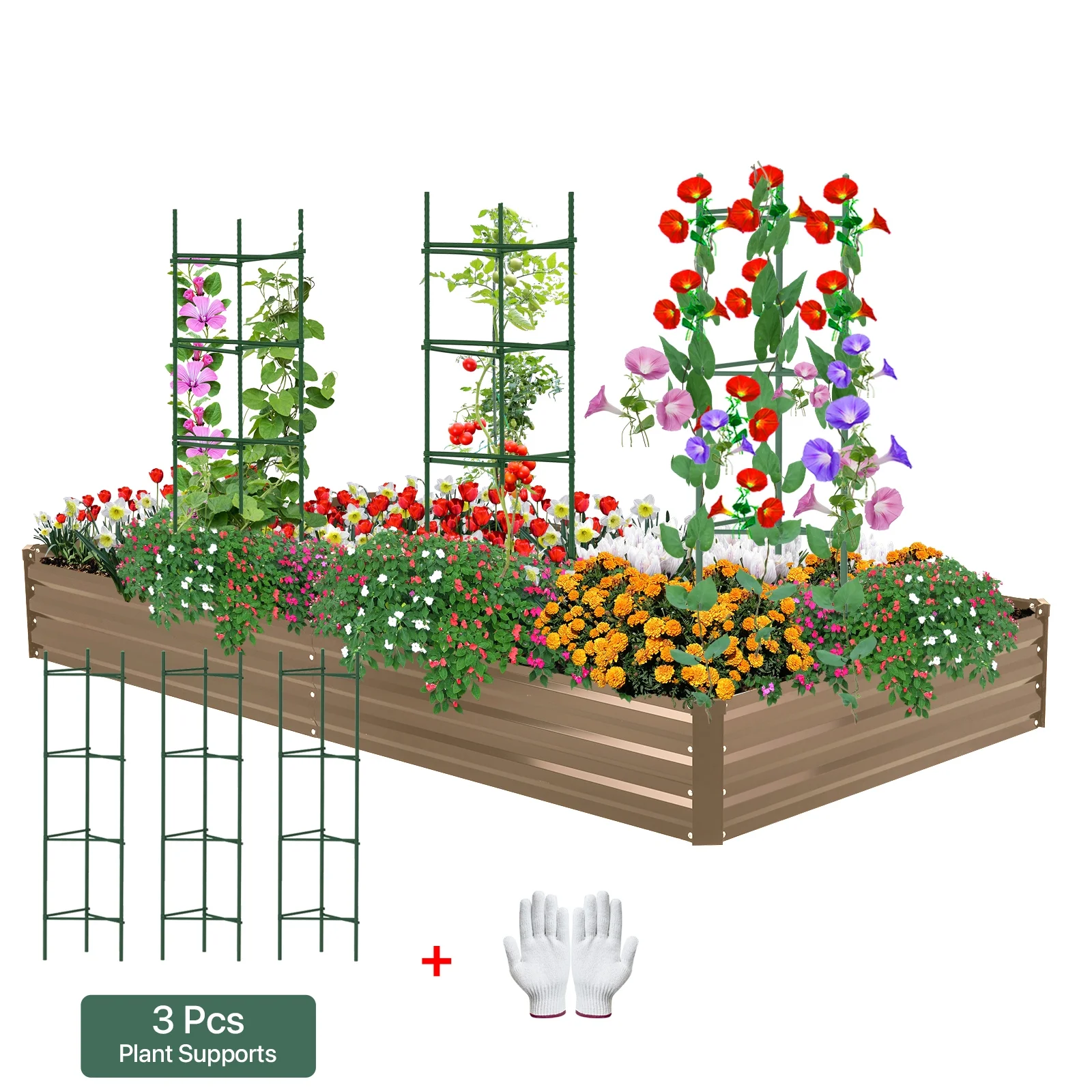 AMOBORO 8x4x1ft Outdoor Metal Raised Garden Bed Planter Box for Vegetables, Flowers, Herbs w/ 3 Tomato Cages Brown