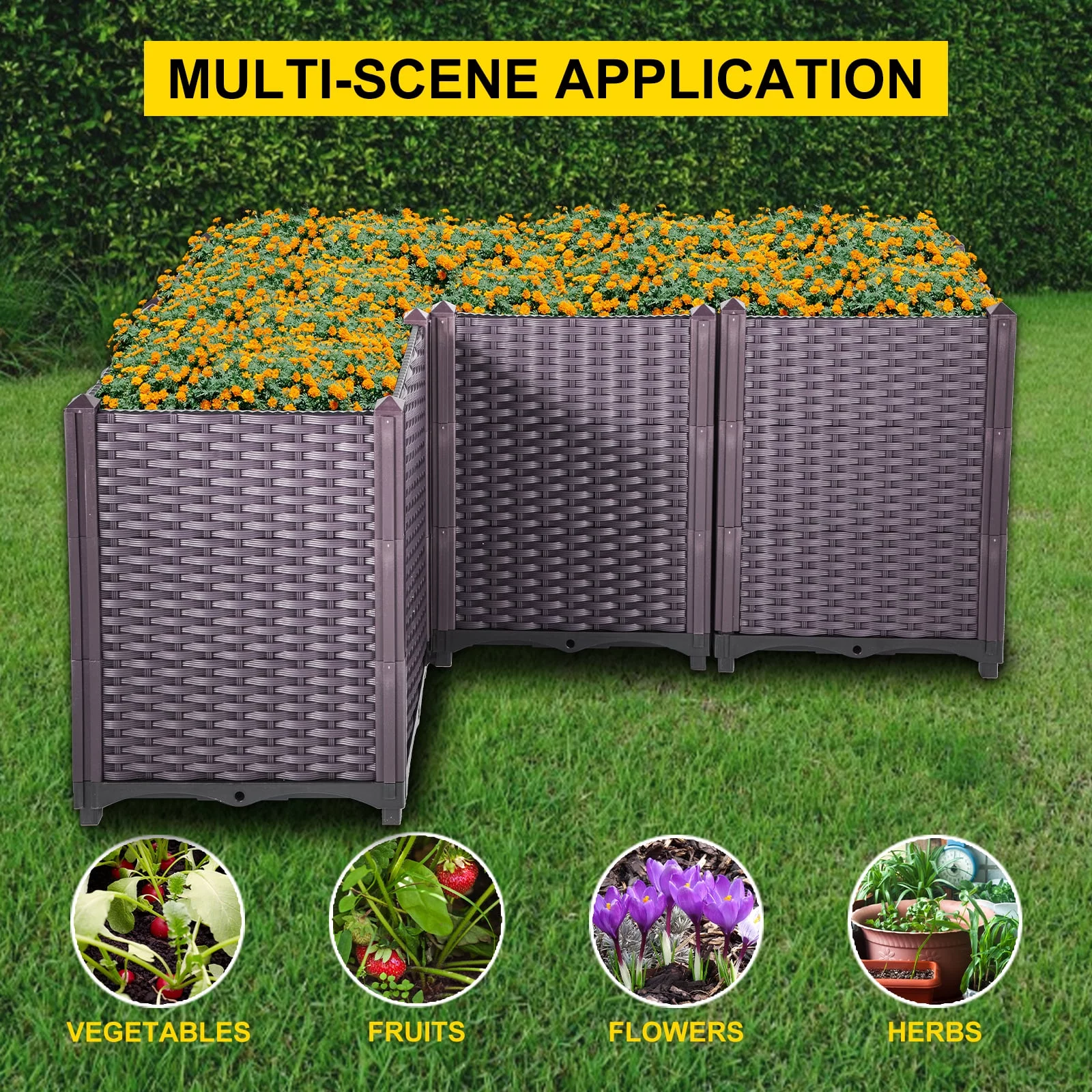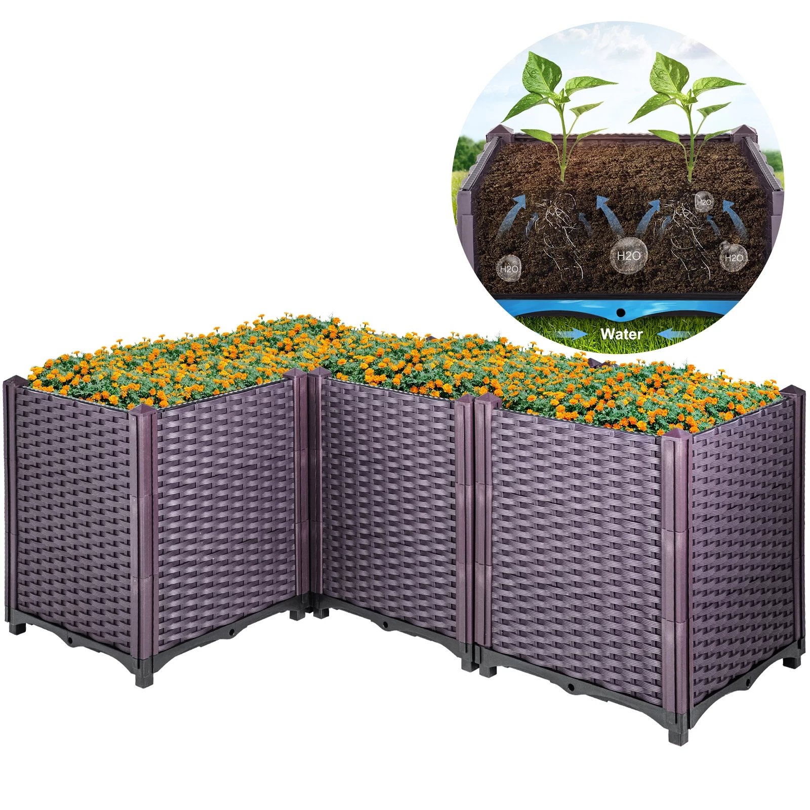 BENTISM Plastic Raised Garden Bed Flower Box Kit 20.5" Brown Rattan Style Set of 4