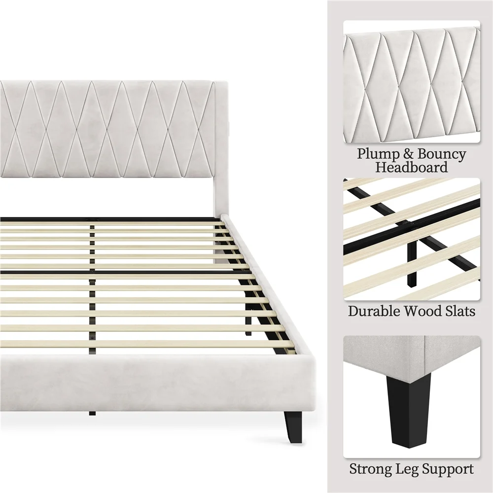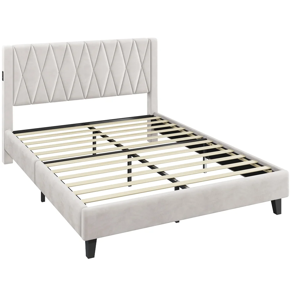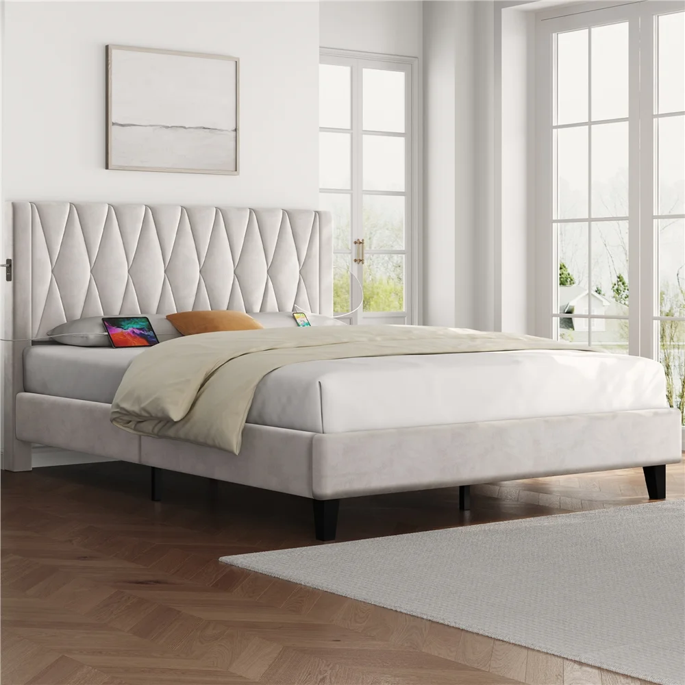 Smile Mart Queen Size Upholstered Bed with Tufted Headboard & Built-In USB Ports, Beige