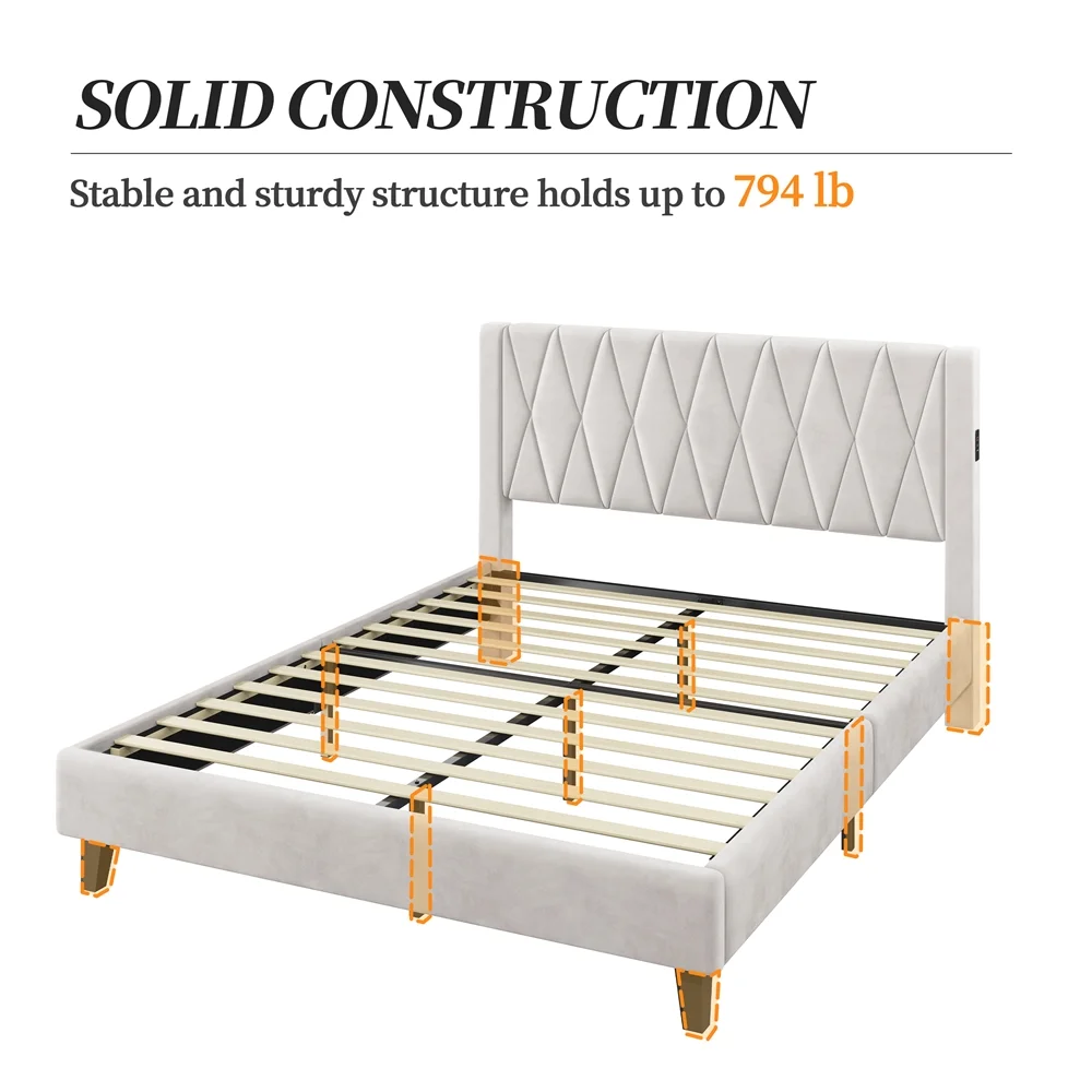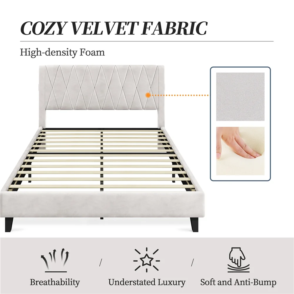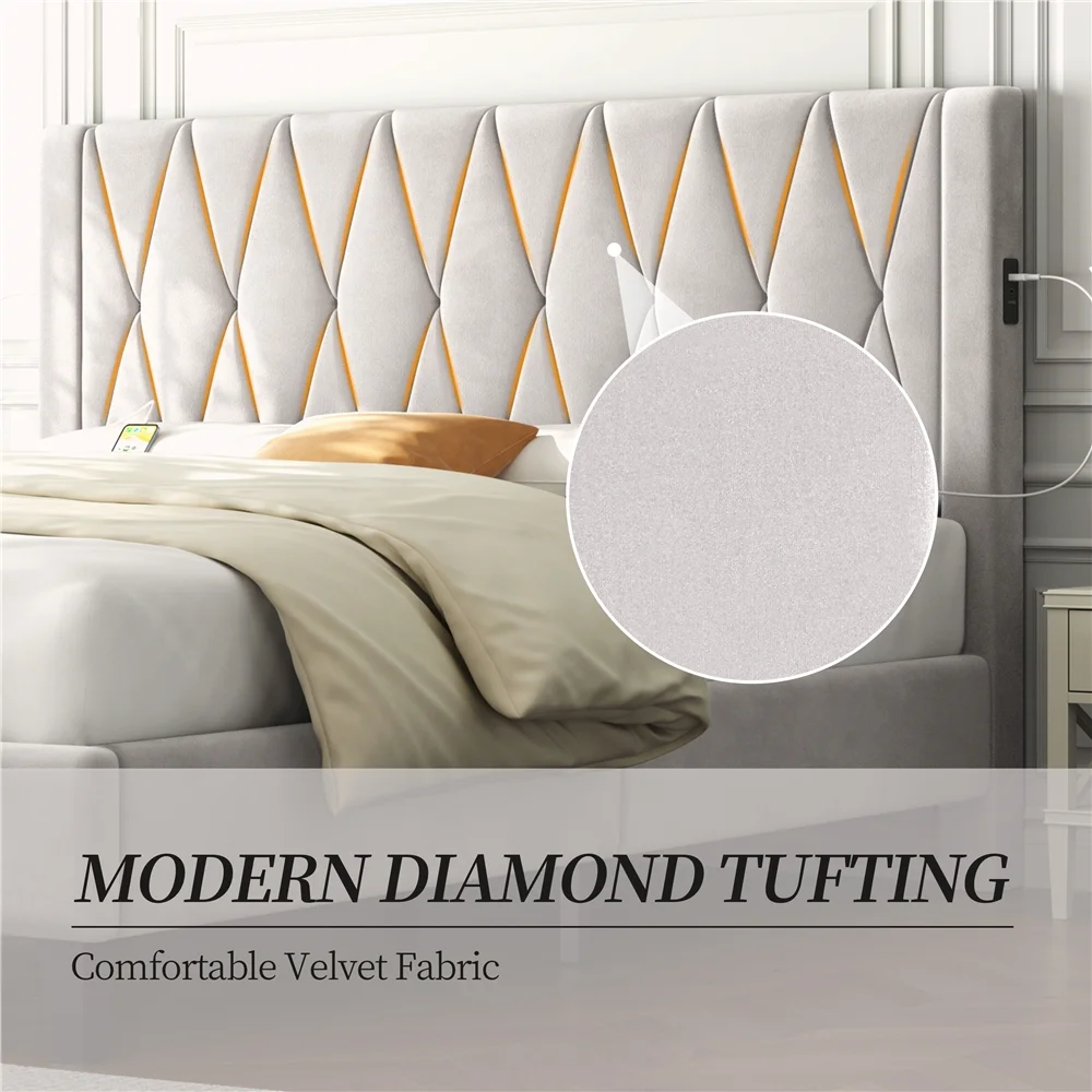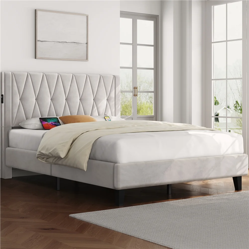 Smile Mart Queen Size Upholstered Bed with Tufted Headboard & Built-In USB Ports, Beige
