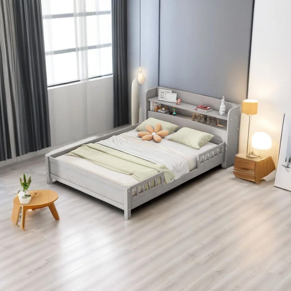 Platform Bed with Built-in LED Light,Storage Headboard and Guardrail Grey-87''L x 43''W x 31.3''H