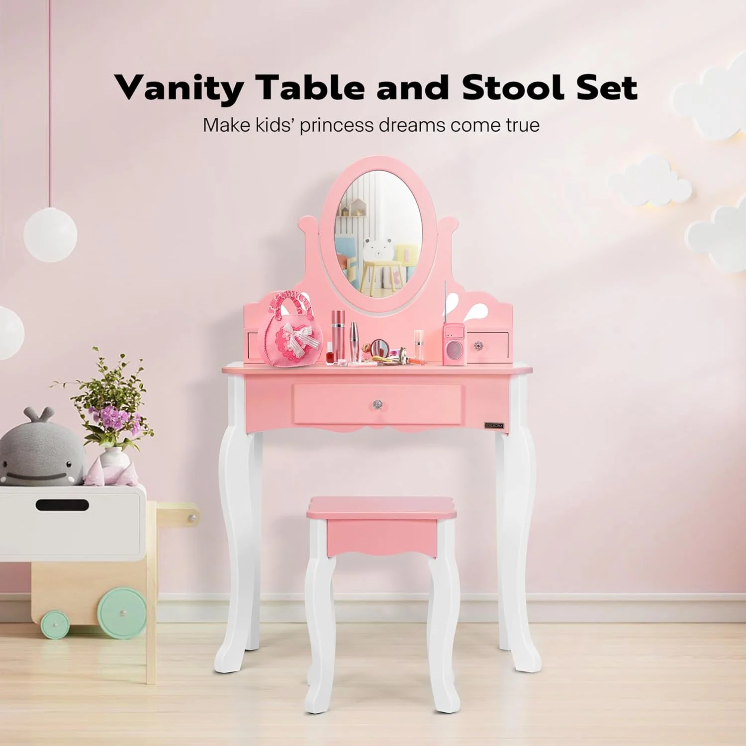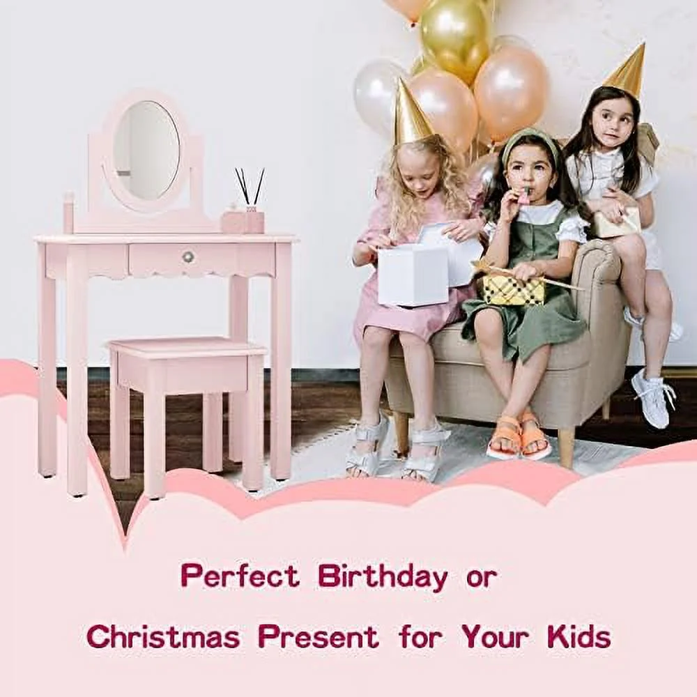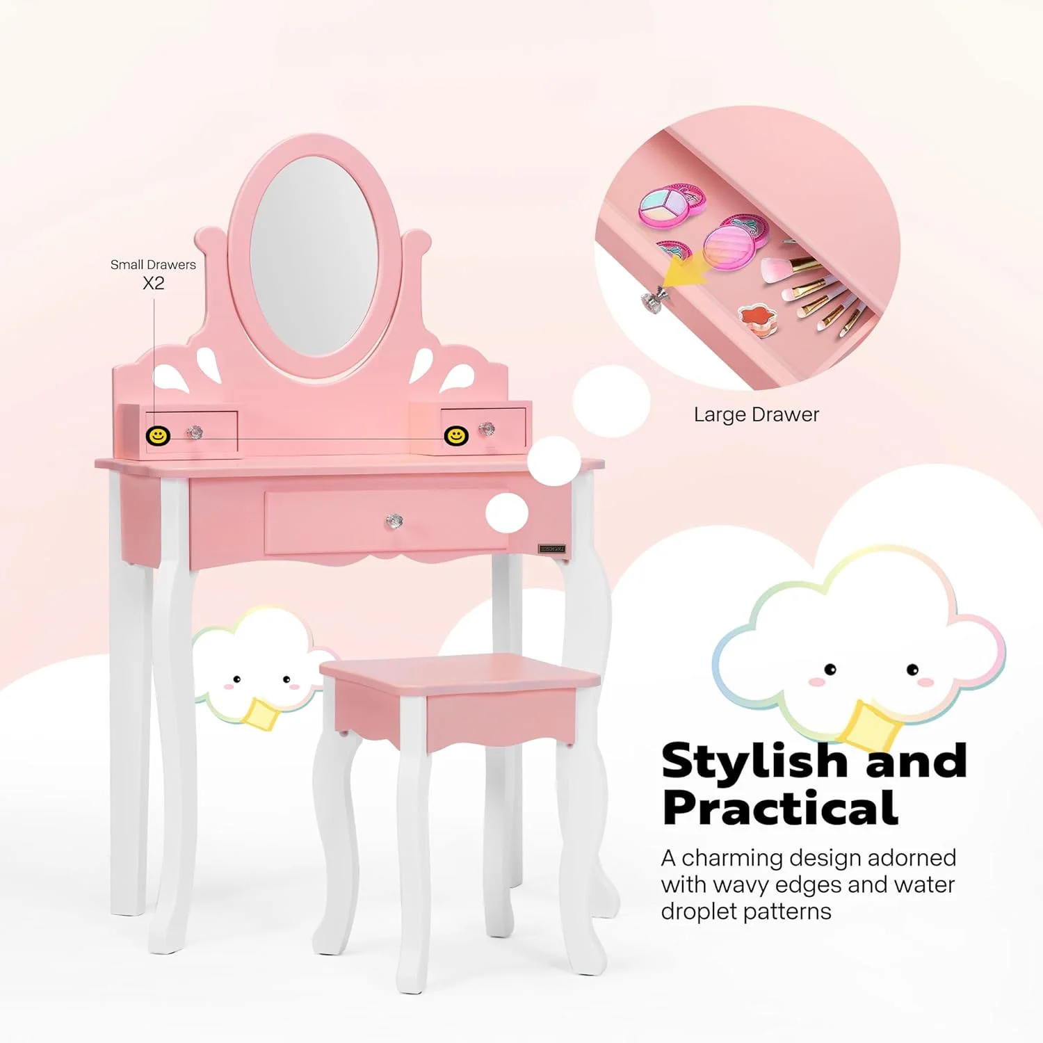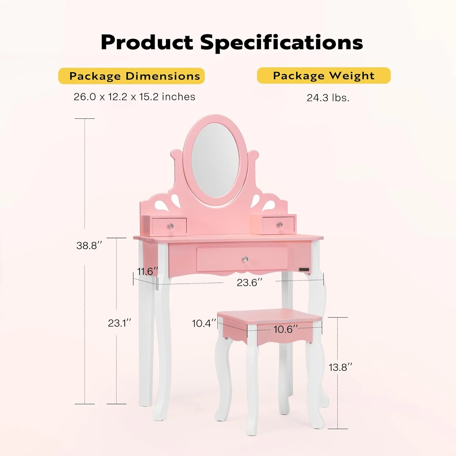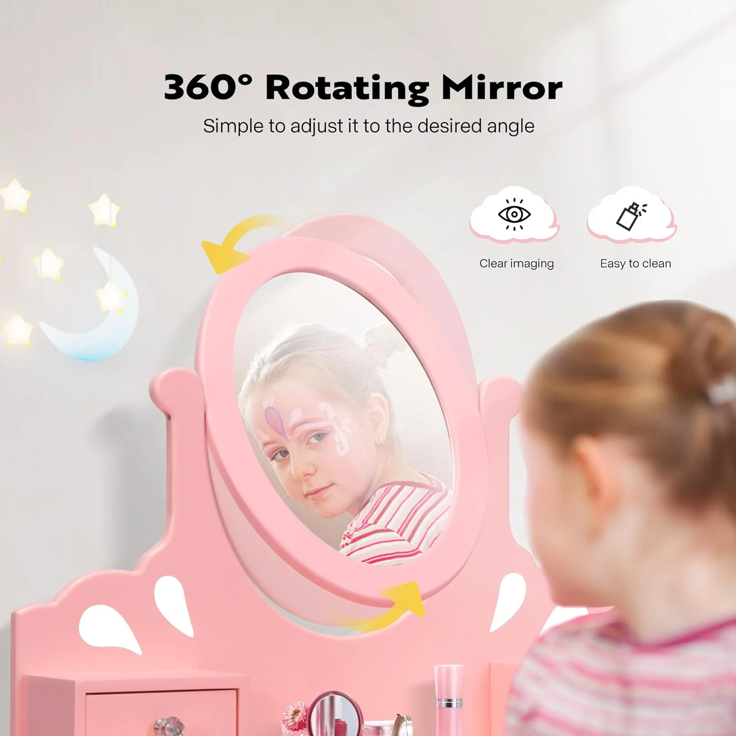 SPECSTAR Kids Vanity Set, Princess MDF Makeup Dressing Table with 360° Rotating Mirror and Drawers for Girls, Pink