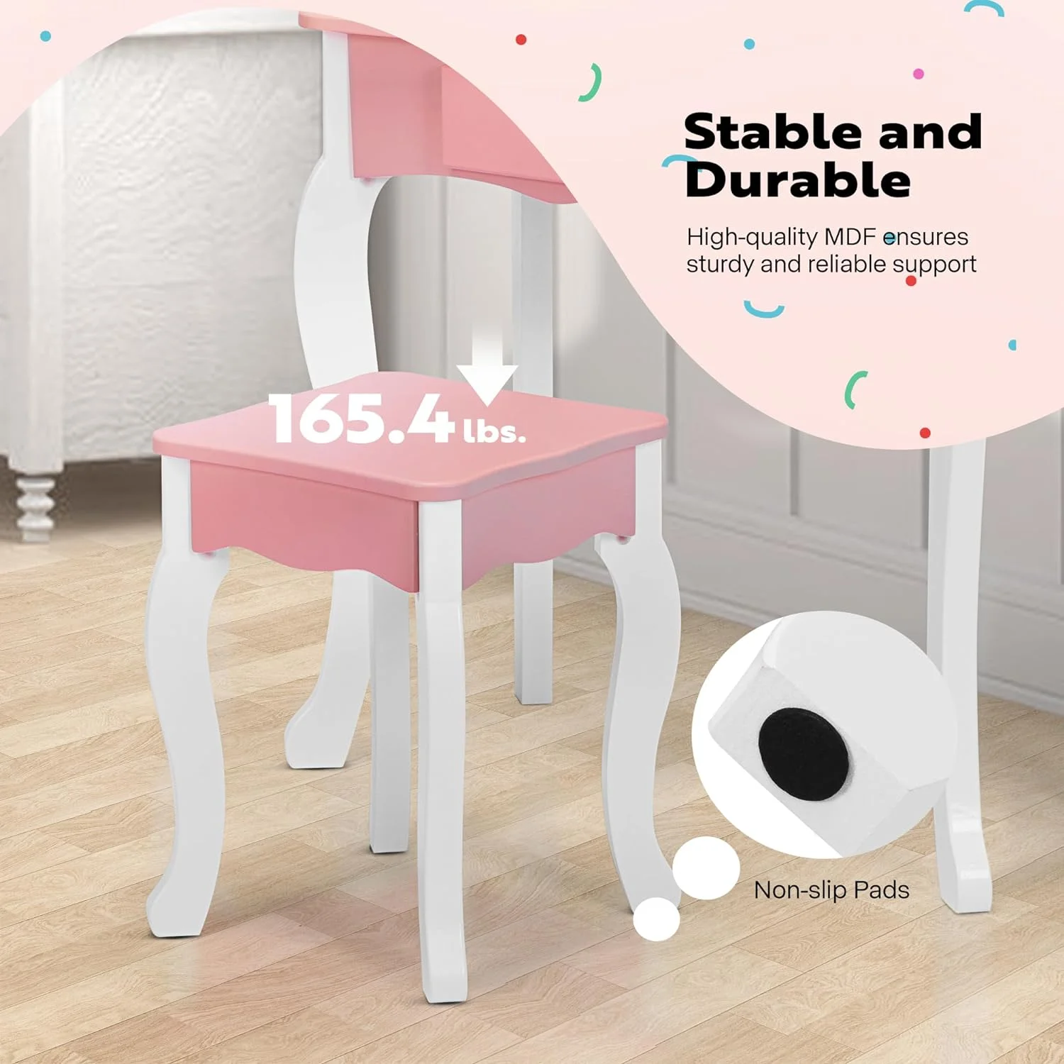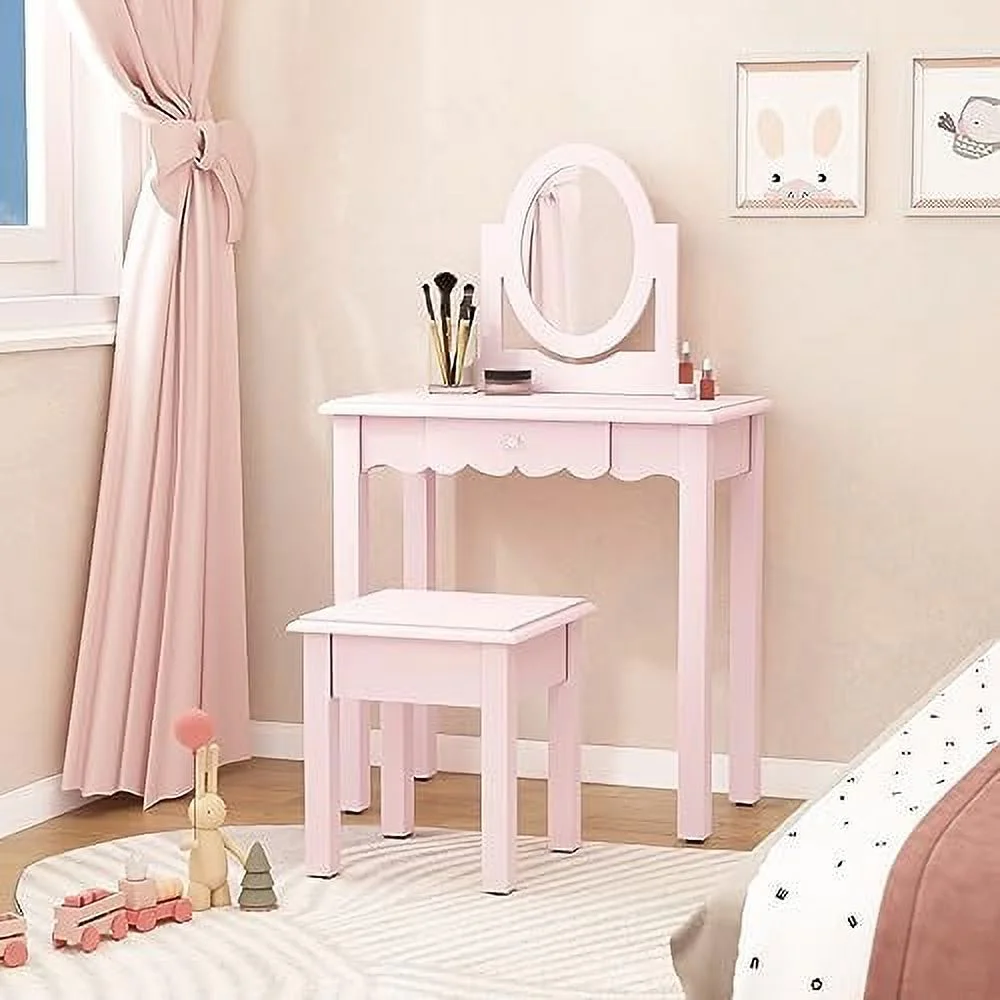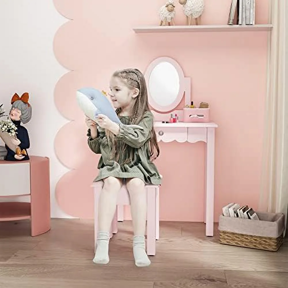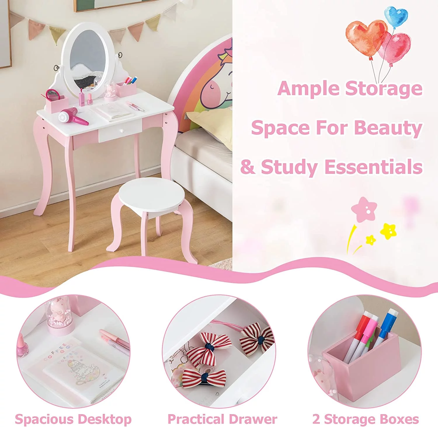 SPECSTAR Kids Vanity Set, Princess MDF Makeup Dressing Table with 360° Rotating Mirror and Drawers for Girls, Pink
