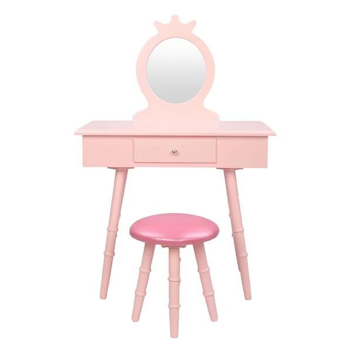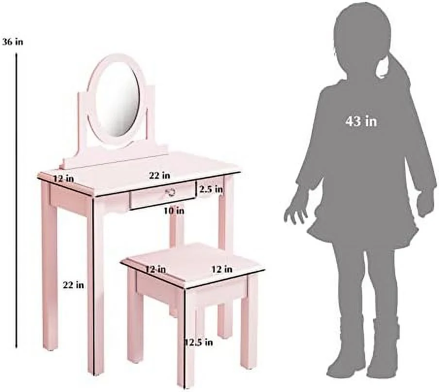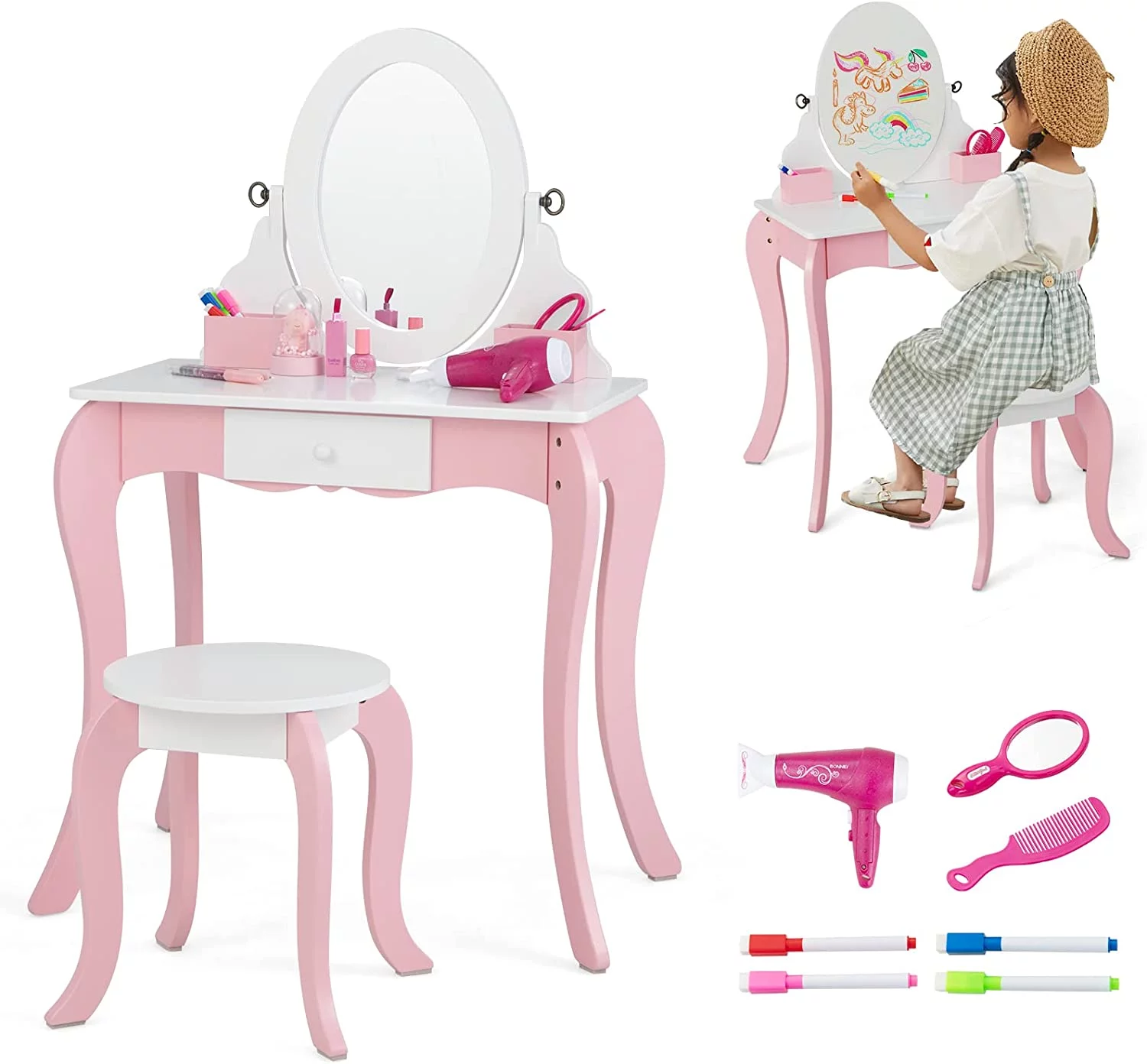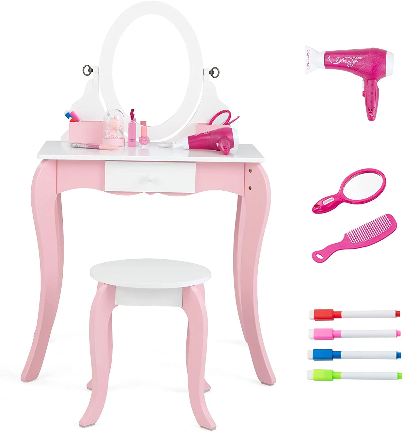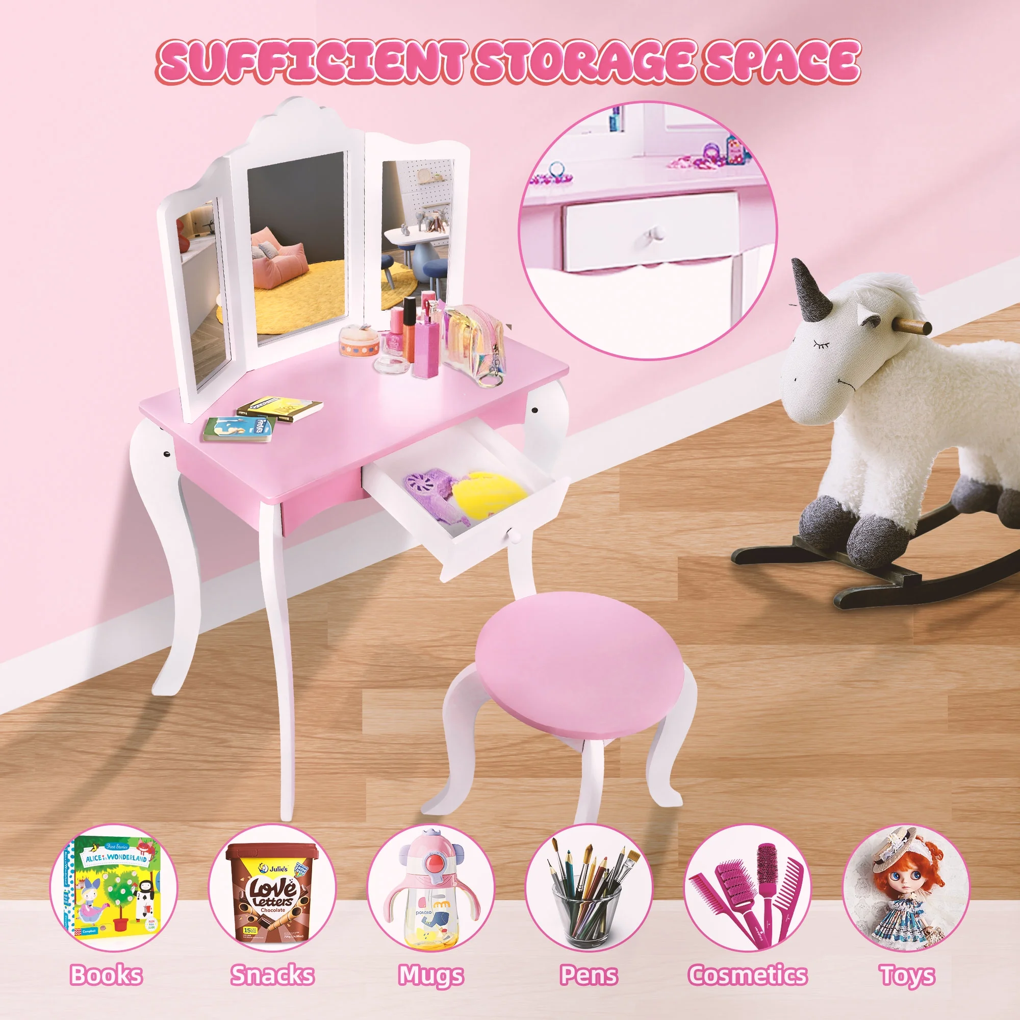 SPECSTAR Kids Vanity Set, Princess MDF Makeup Dressing Table with 360° Rotating Mirror and Drawers for Girls, Pink