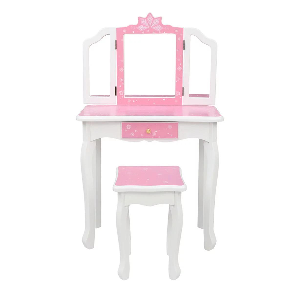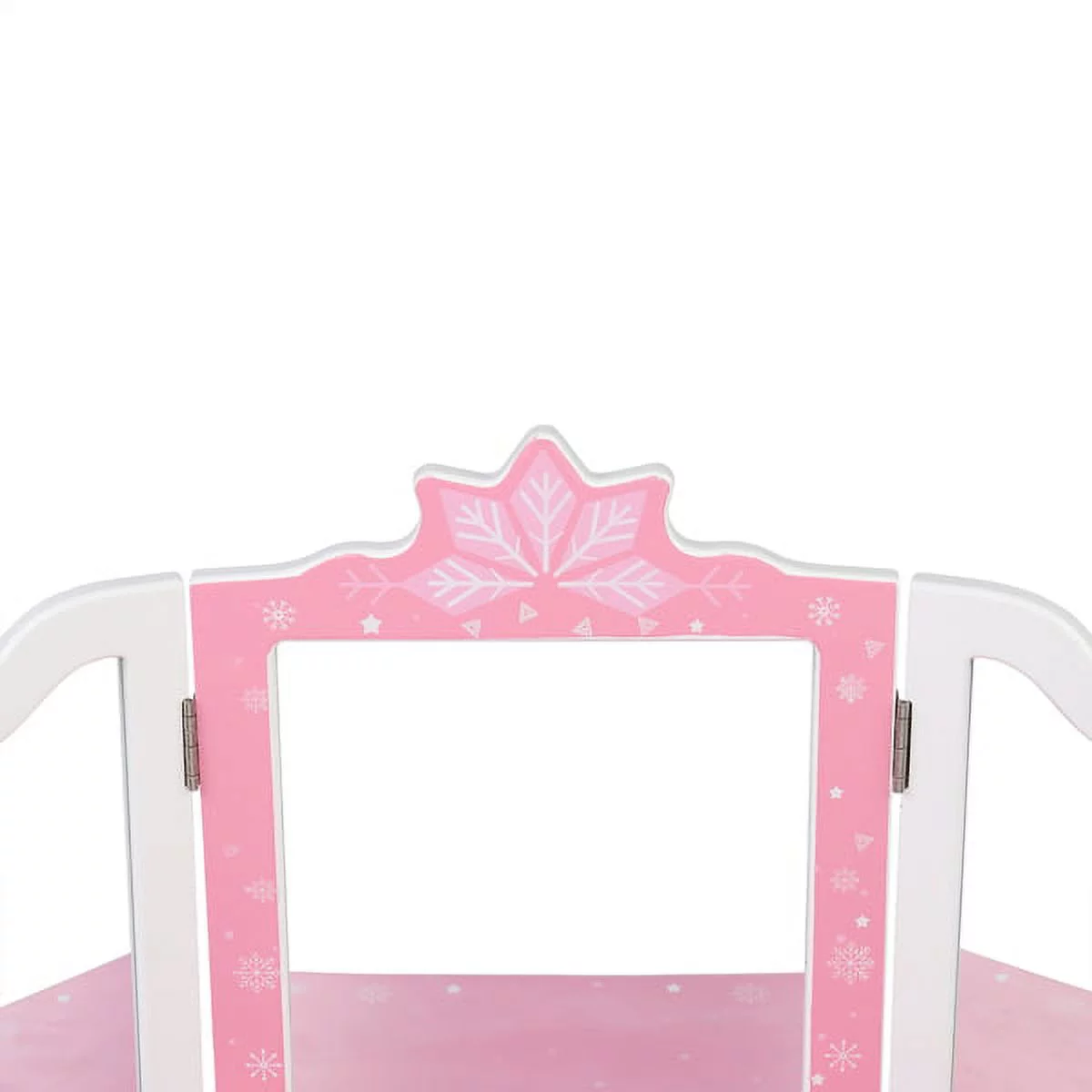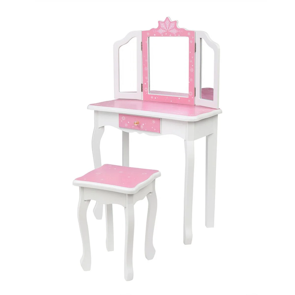 Children's Wooden Dressing Table Three-Sided Folding Mirror Dressing Table Chair Single Drawer Blue Snowflake Style