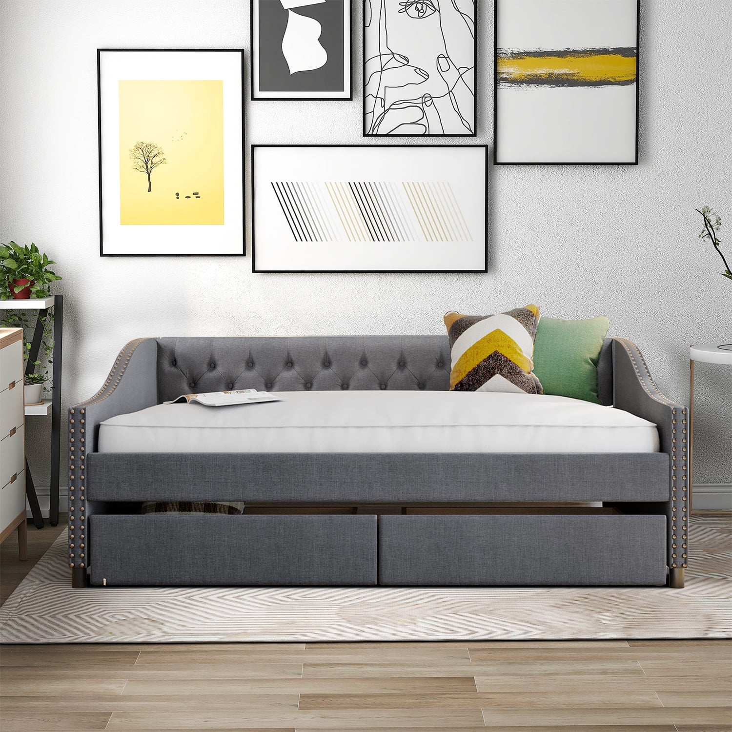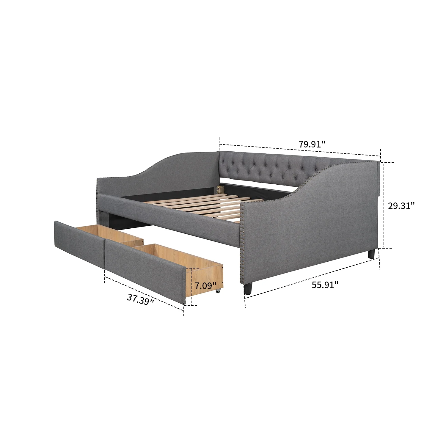 Elegant Full Size Linen Fabric Button-Tufted Upholstered Daybed with 2 Drawers and Rivet Decor, Gray