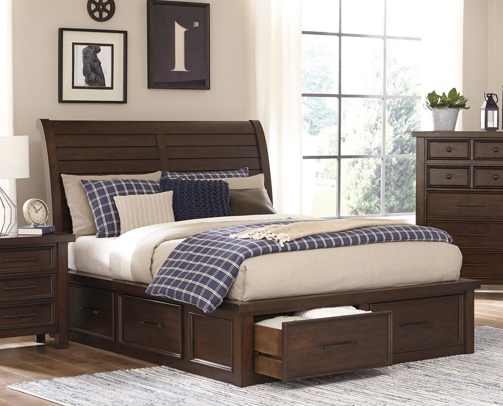 Transitional Brown Finish 1pc Eastern King Size Storage Bed Sleigh Headboard 6x Drawers Classic Design Furniture