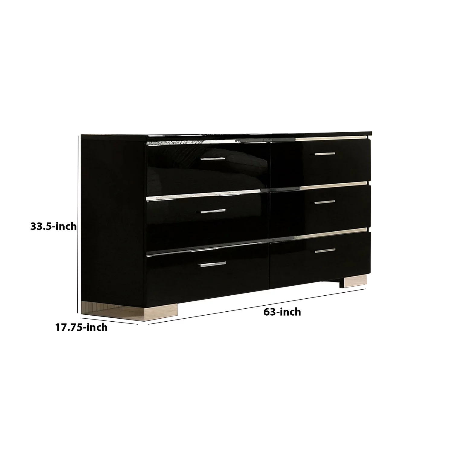 Benjara 63 Inches 6 Drawer Dresser with Metal Legs, Black and Chrome