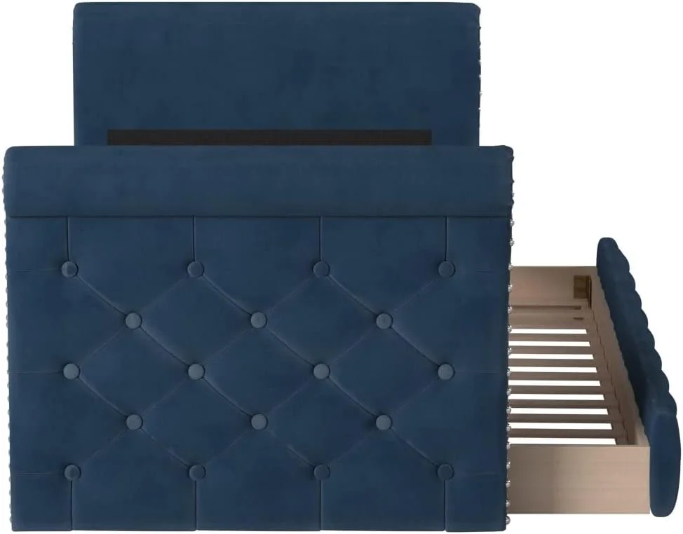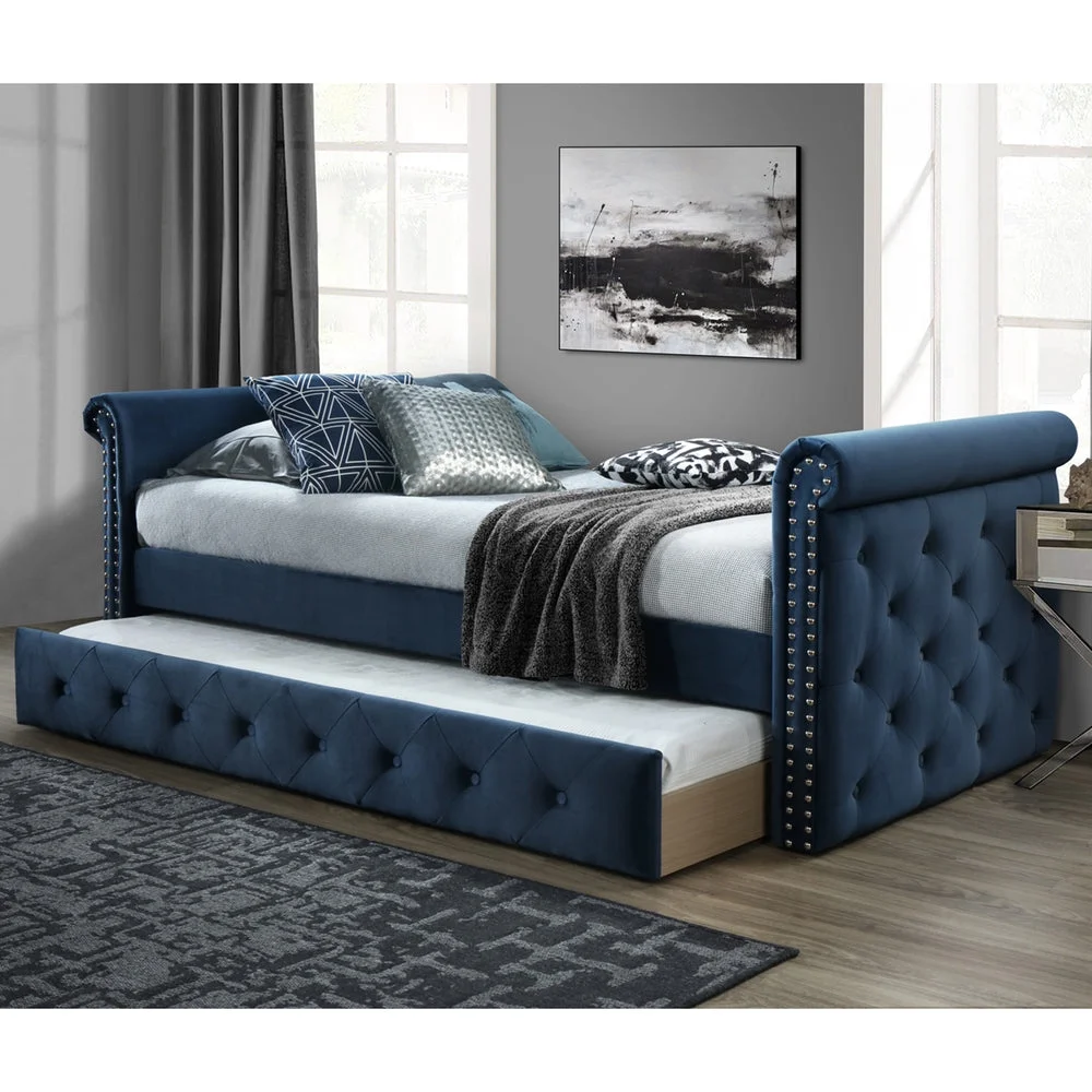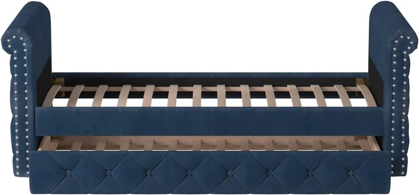 DG Casa Hesdin Twin Daybed - Button Tufting, Nailhead Trim, Trundle, Full Wooden Slats, No Box Spring - Blue Faux Velvet