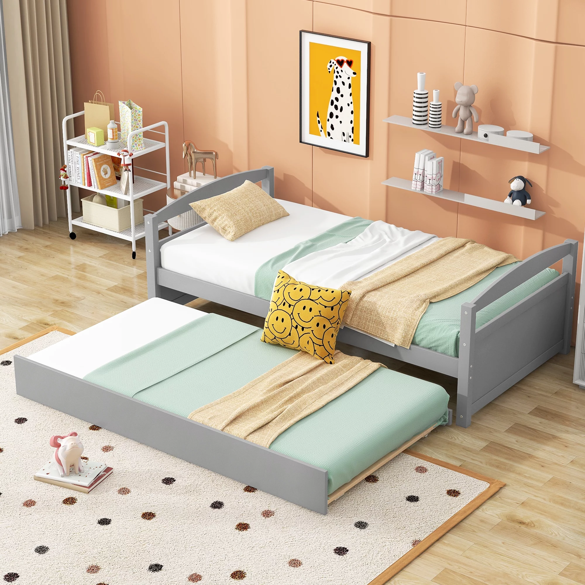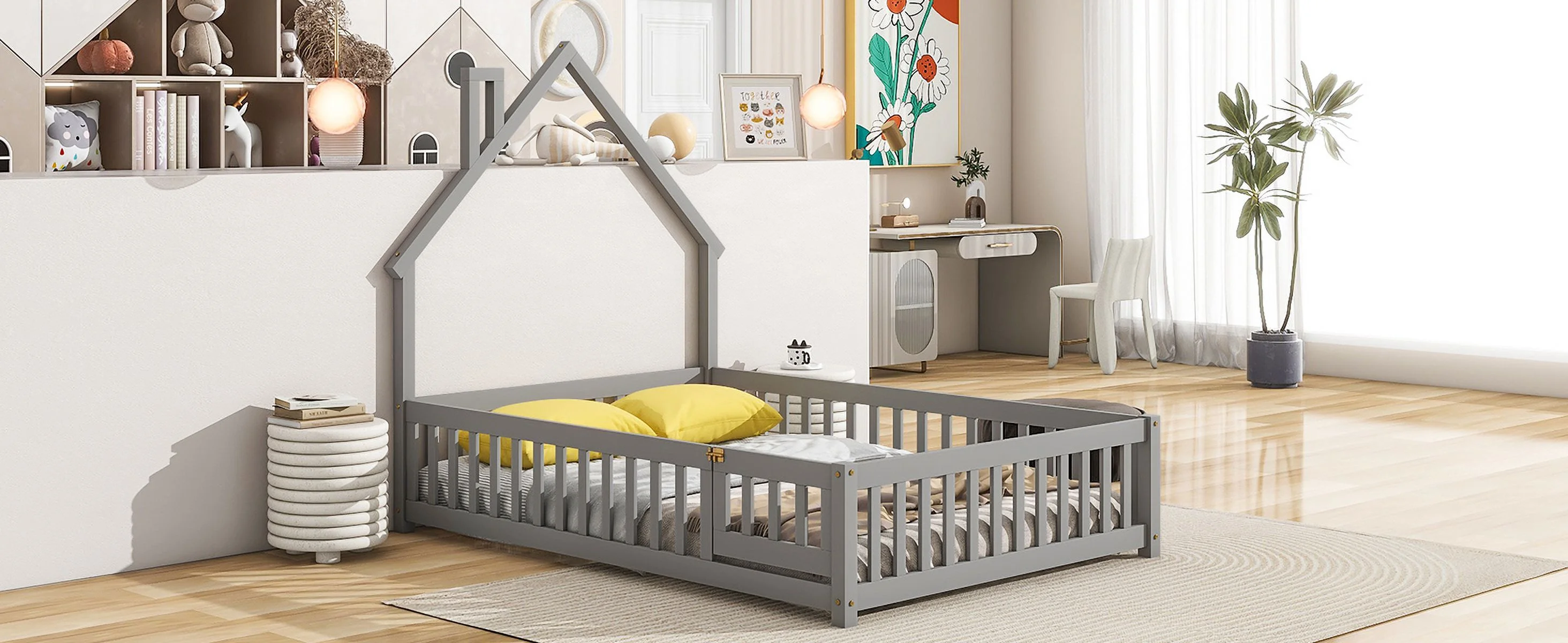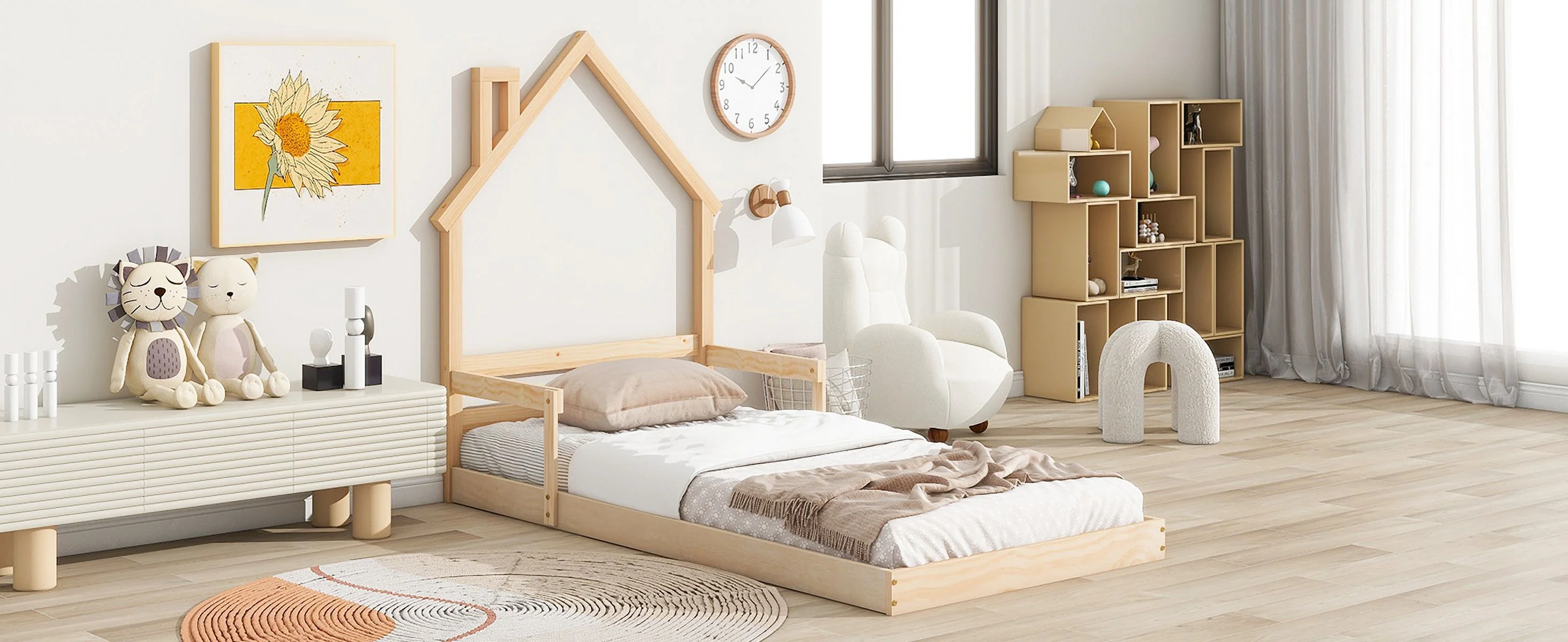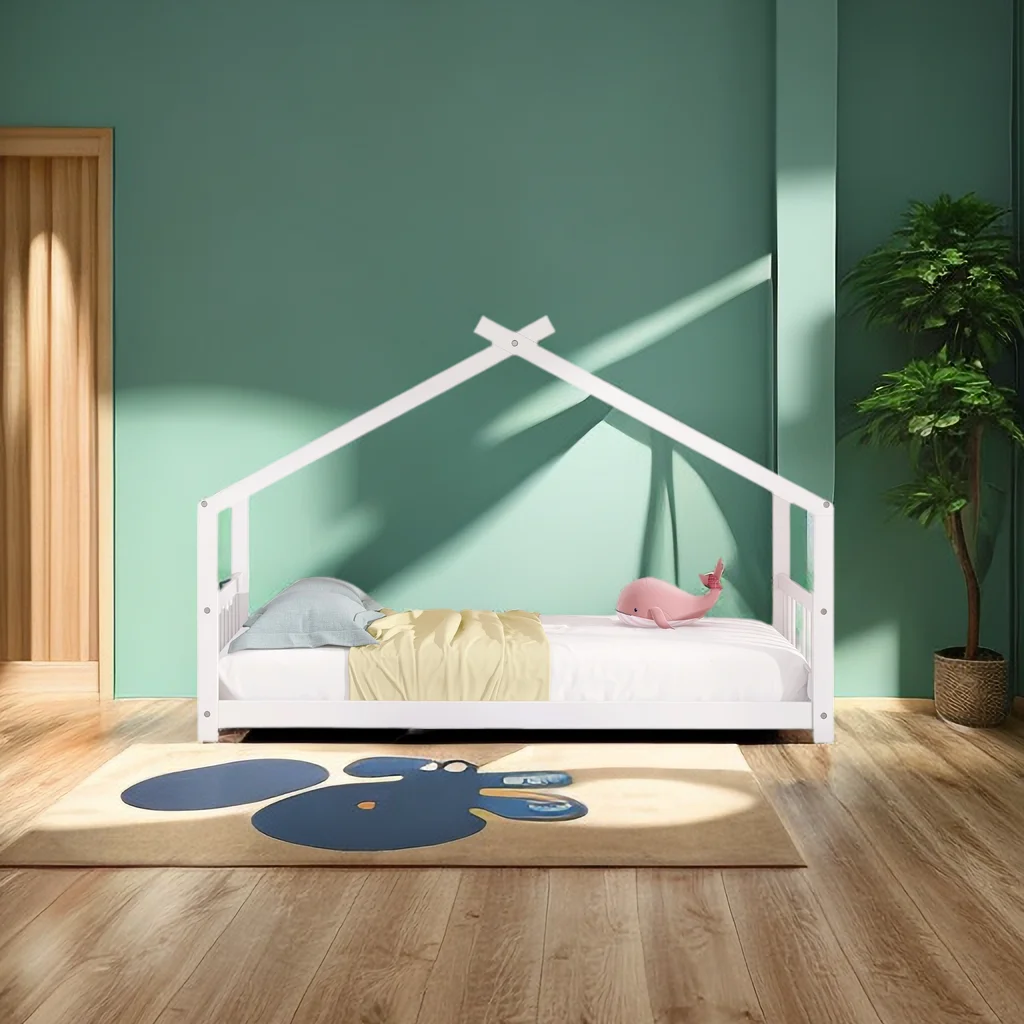 Twin House Beds Wood Montessori Bed Frame Floor Bed Kids Platform Bed with Headboard & Footboard, No Box Spring Needed