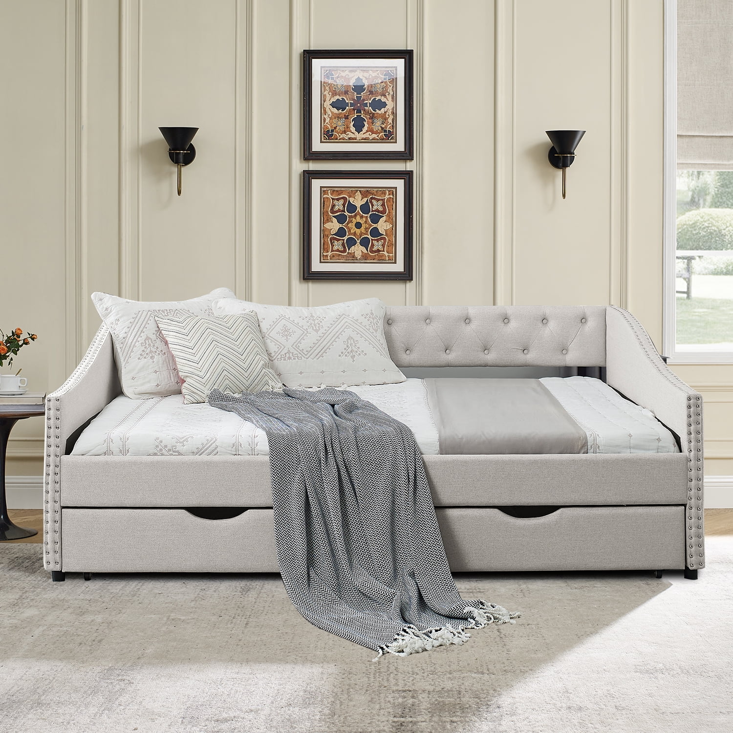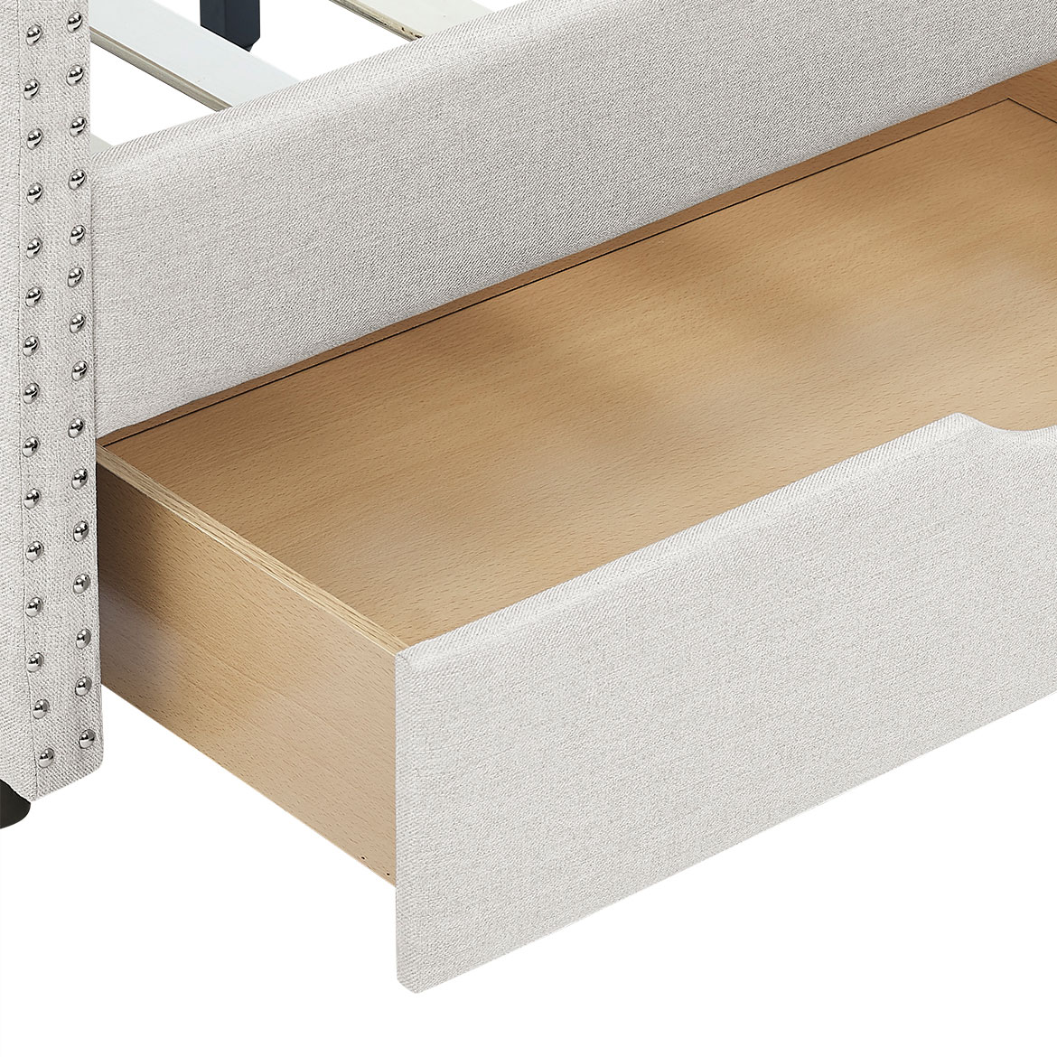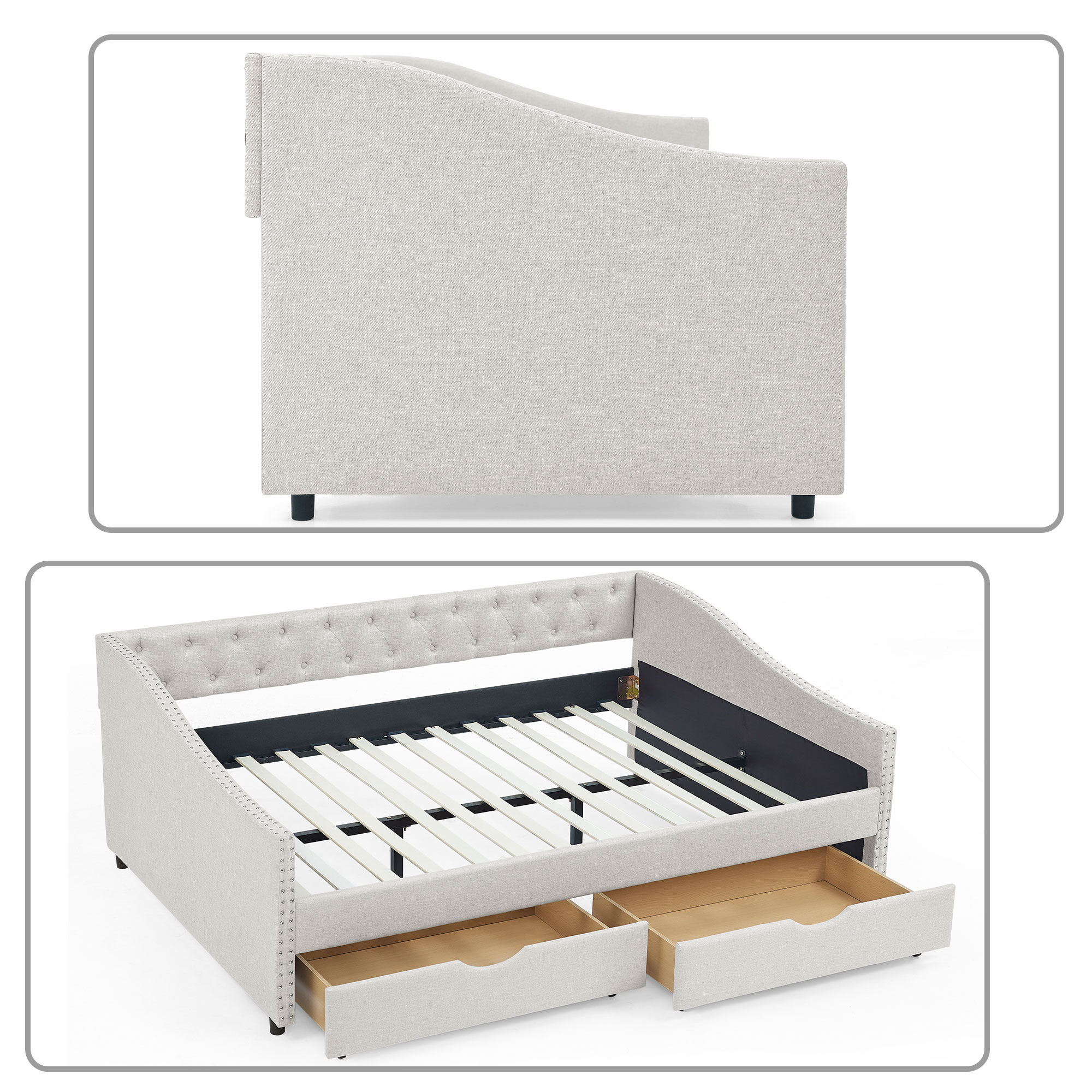 Classic and Stylish Full Size Linen Fabric Button-Tufted Daybed with 2 Drawers and Rivet Decor, Beige