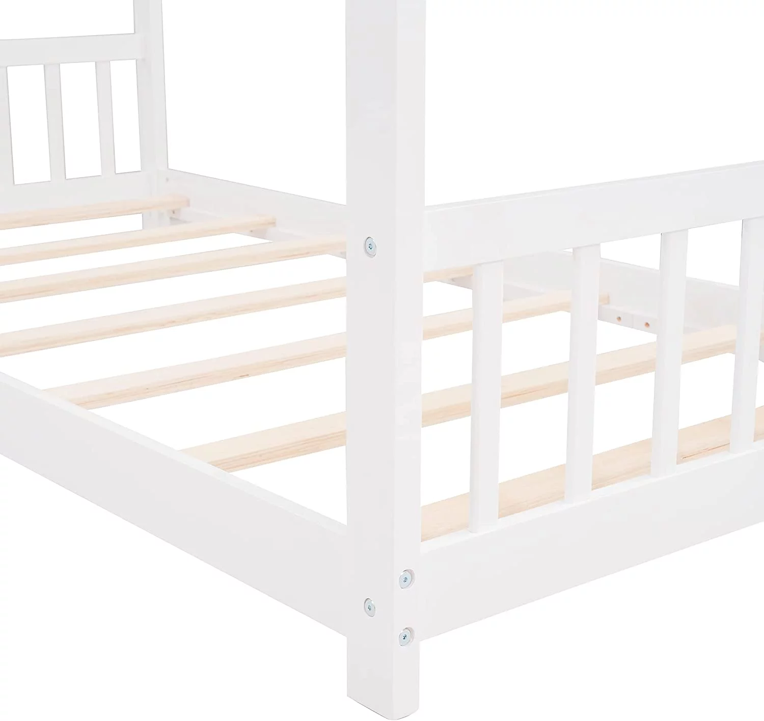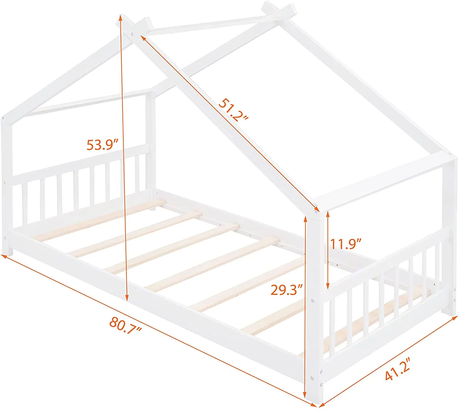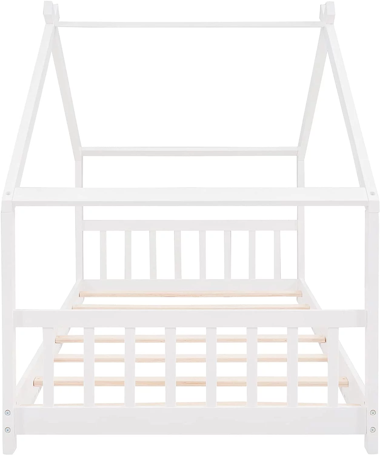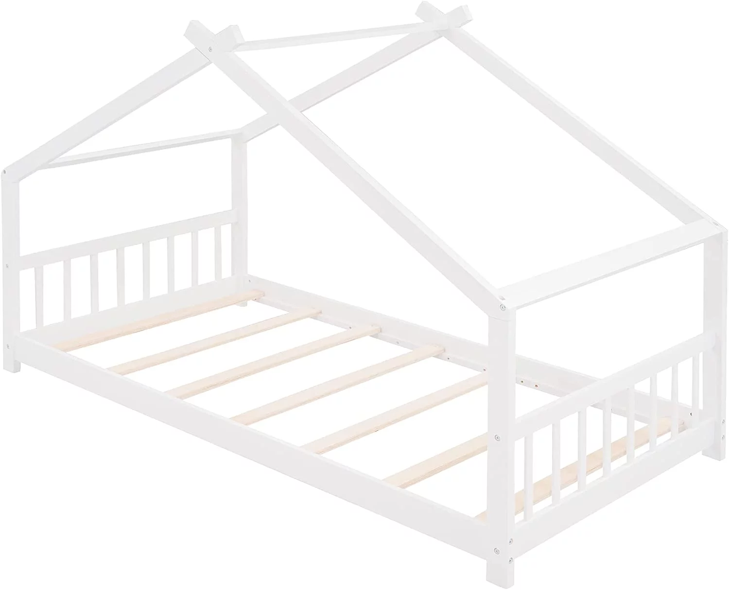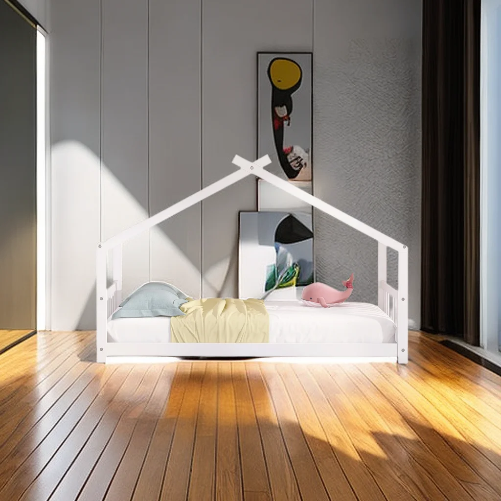 CoSoTower Twin House-Shaped Headboard Floor Bed with Handrails ,Slats,White
