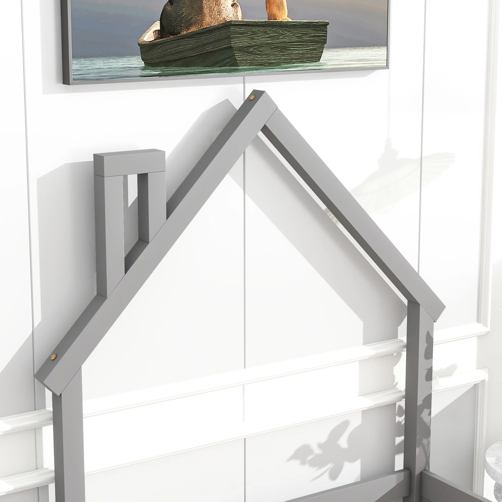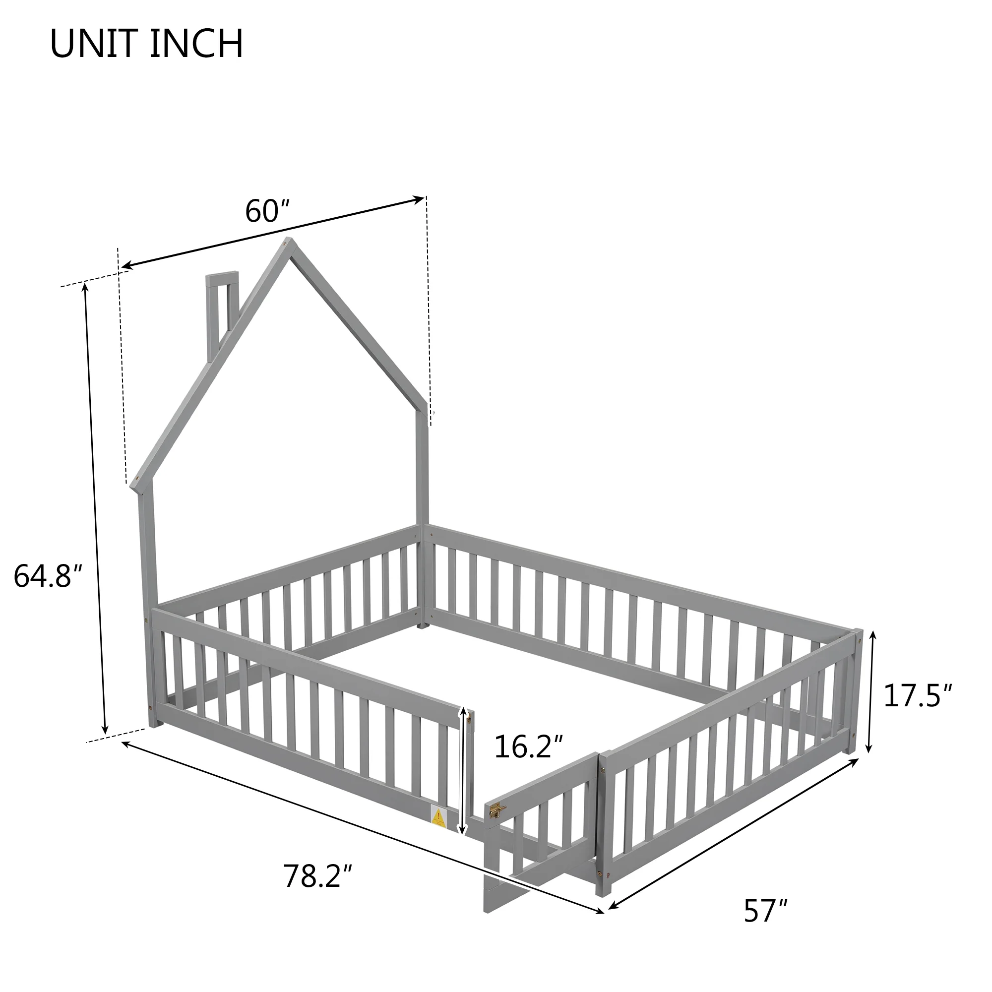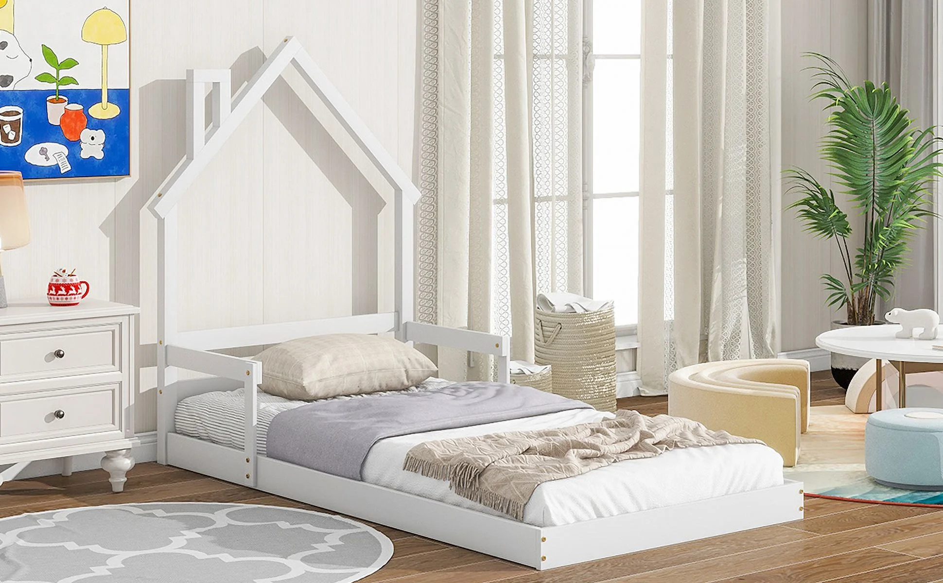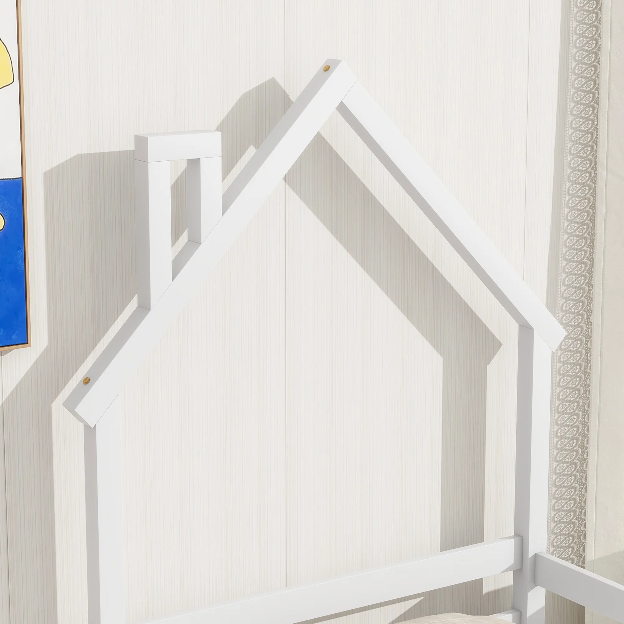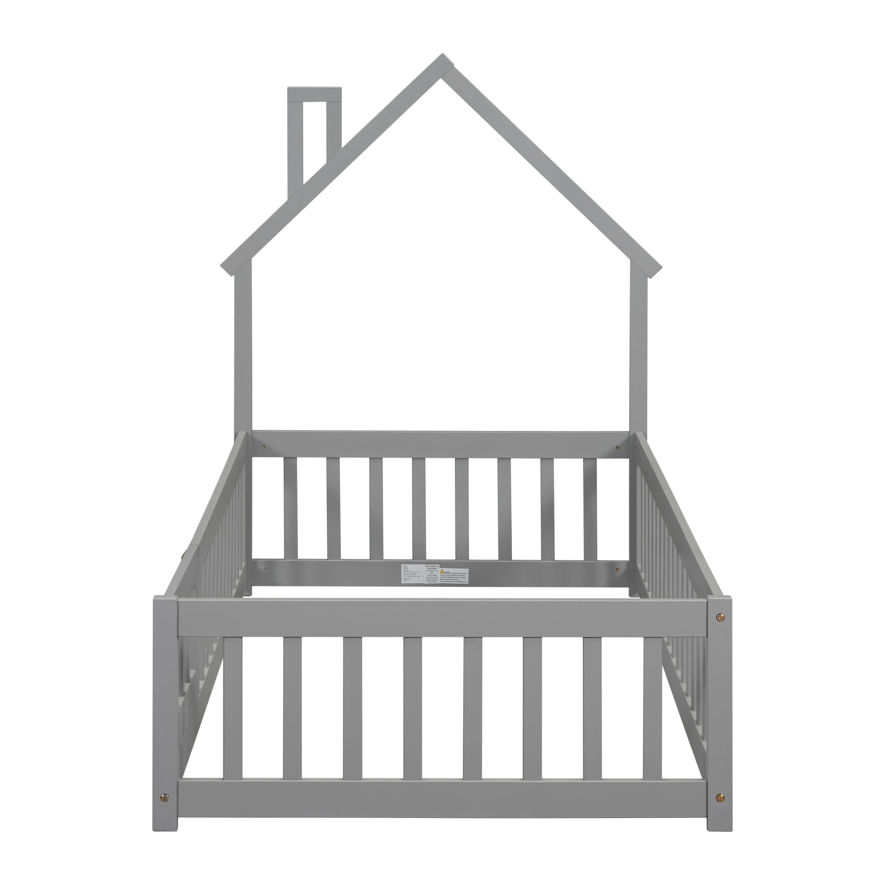 CoSoTower Twin House-Shaped Headboard Floor Bed with Handrails ,Slats,White