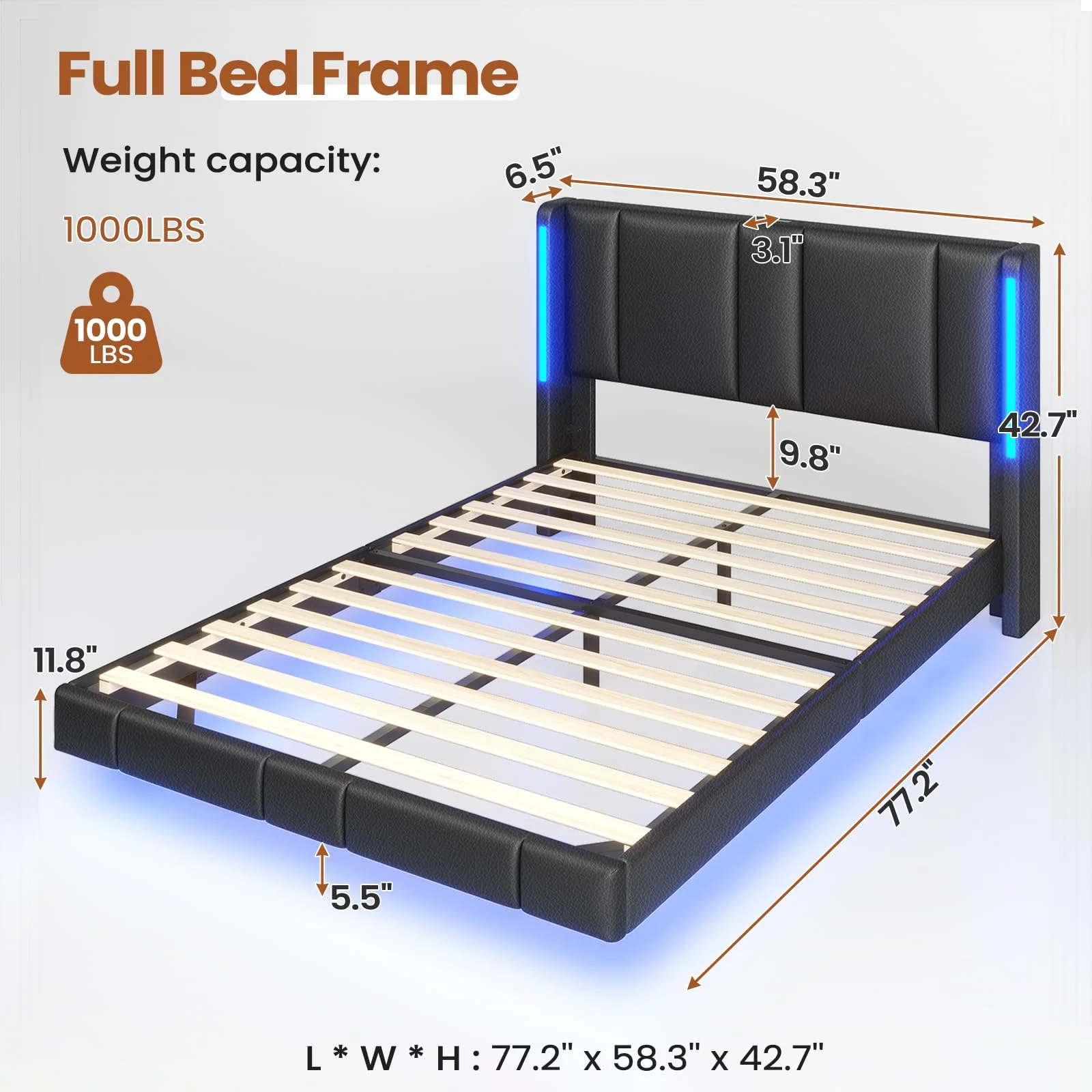Full Size LED Floating Bed Frame with Charging Station, Upholstered Platform Bed Frame, No Box Spring Needed, Black